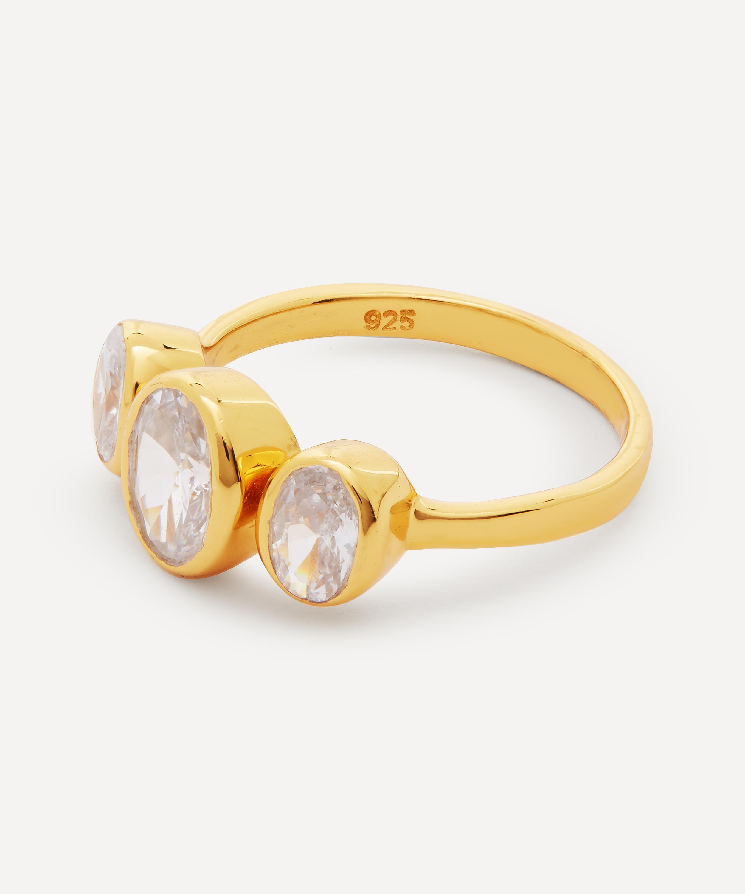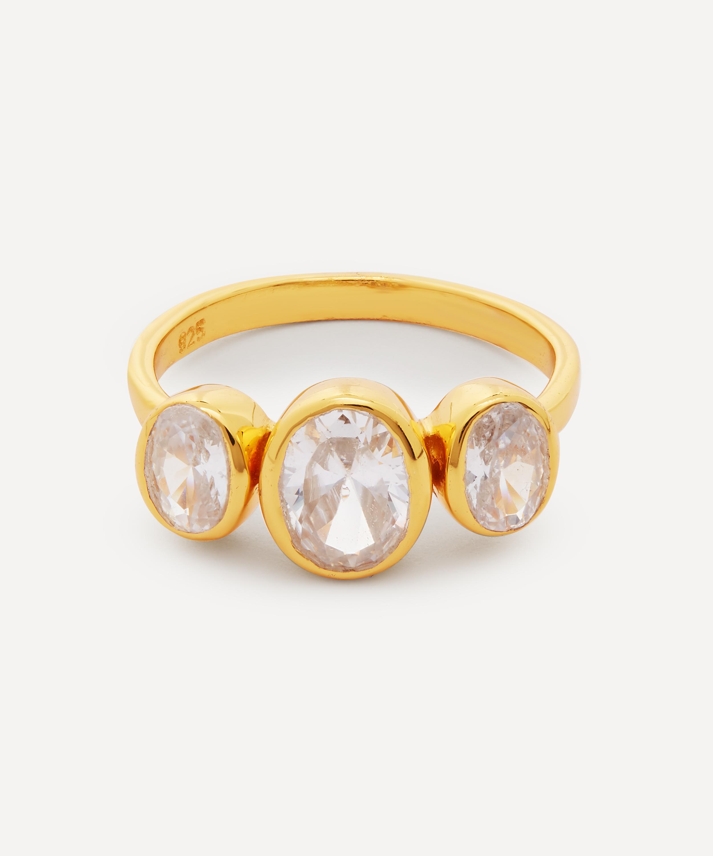 Crafted from 22 carat gold-plated sterling silver, this ring features three oval cut hydro glass crystals, presented in a trio of bezel settings on a slim, polished band. The clean, contemporary design is perfect for both day and night dressing - style it solo as a stand-alone statement piece, or wear it with several of Shyla's other stacking bands and coloured glass cocktail rings for an unapologetically maximalist approach.