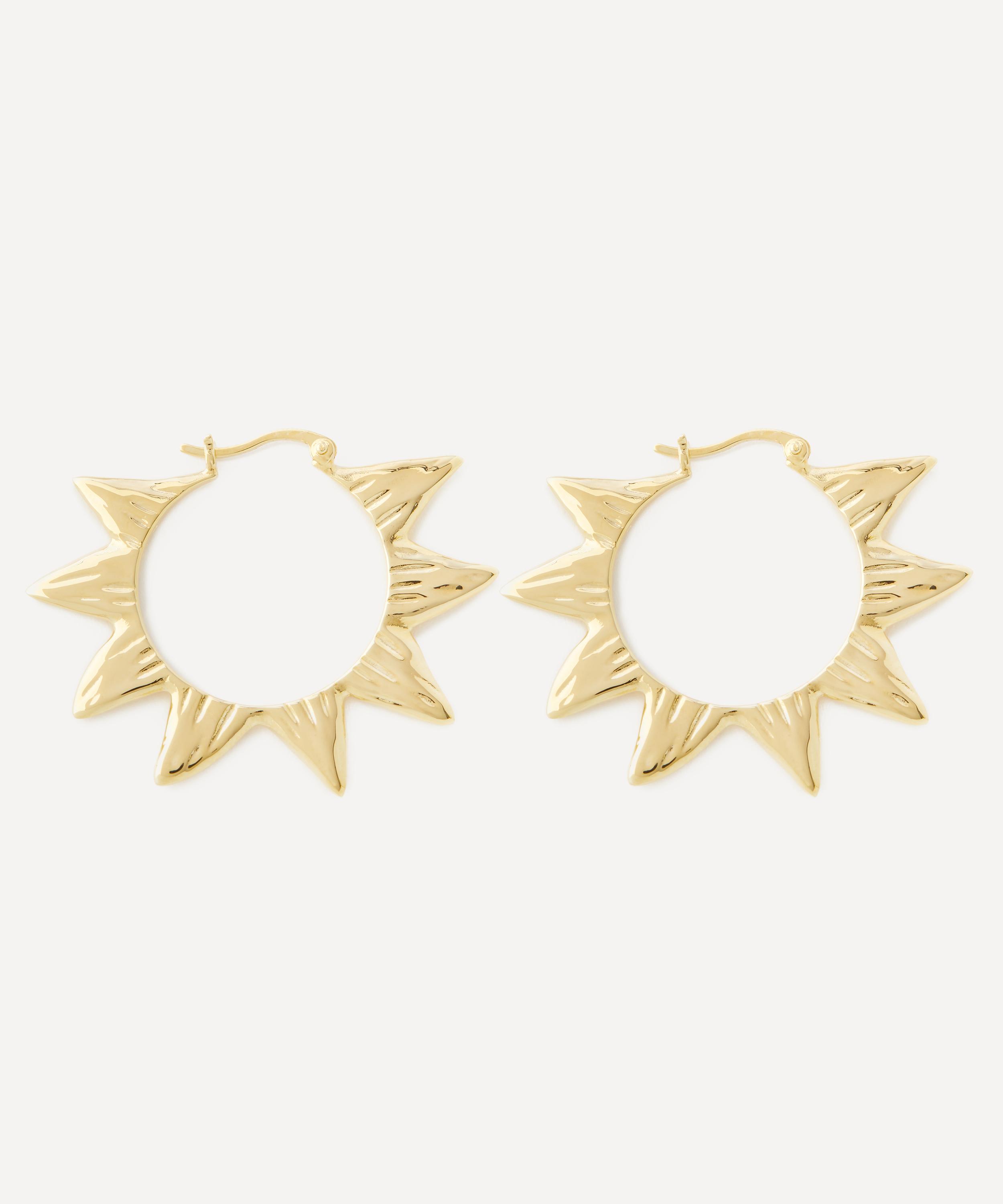 Beautifully crafted from gold-plated brass to a large hoop silhouette with sun rays on the outer edge, these stylish earrings are complete with a polished finish to enhance their radiance – incorporate them into a mixed ear stack for a trend-led finish, or style solo to showcase their eye-catching design.