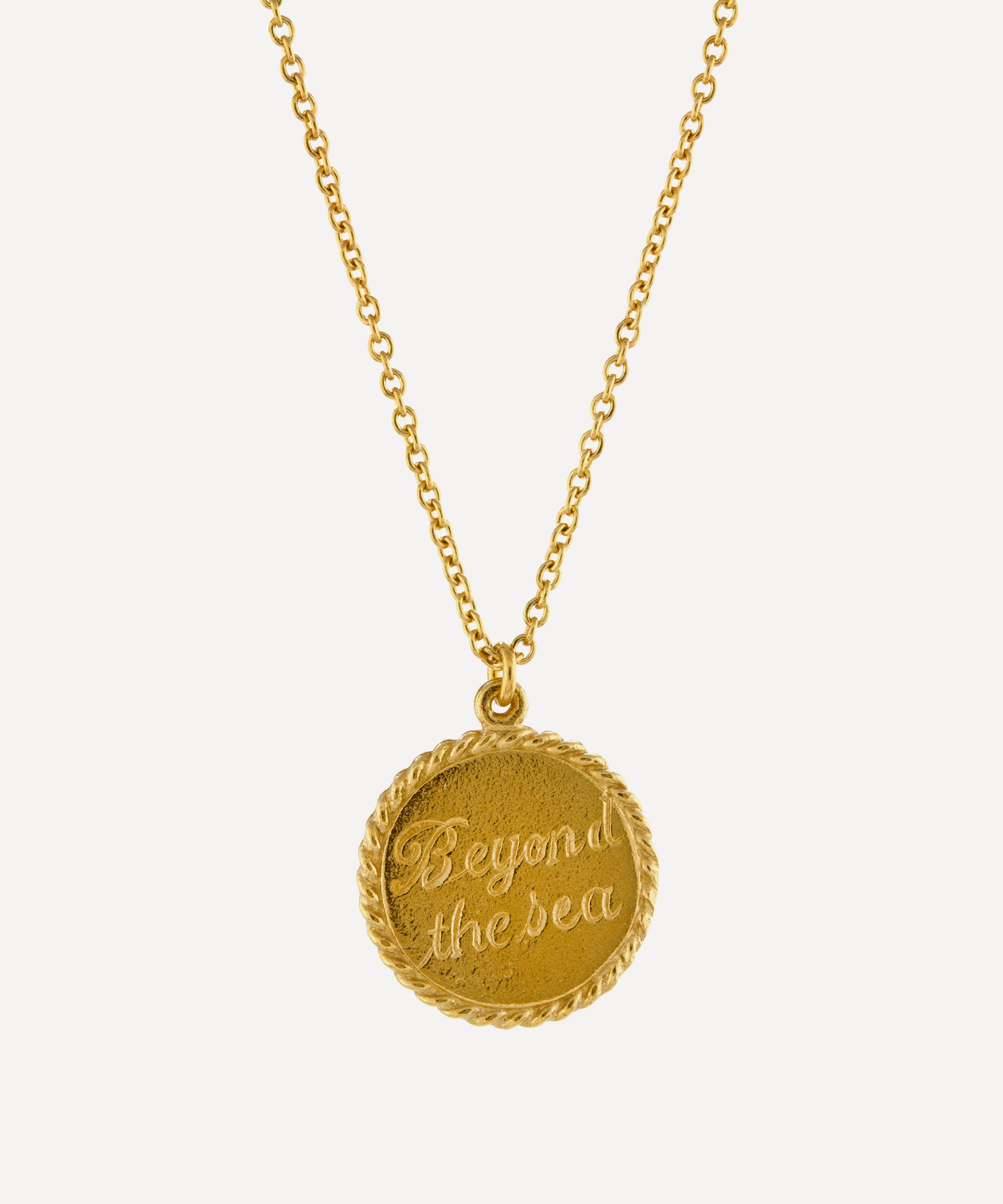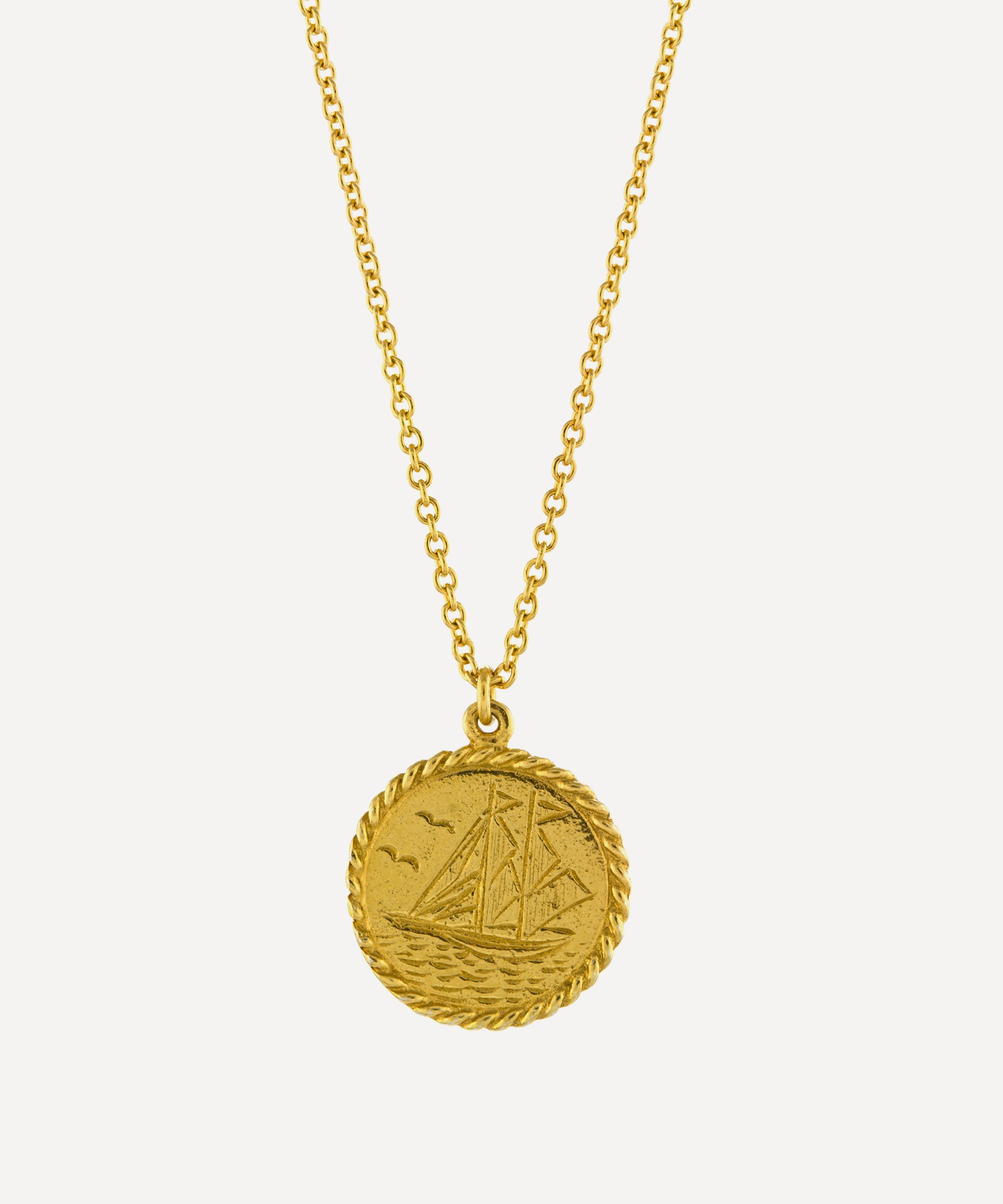 Exemplifying Alex Monroe’s affinity for symbolic jewellery design, this pendant necklace draws on great adventures across the sea. Crafted in a glistening gold-plating, it’s characterised by a fine chain and coin pendant – inspired by antique coin pendants crafted in the Victorian era. The pendant features a hand-engraved ship motif, accented by ship rope detailing around the edges.
