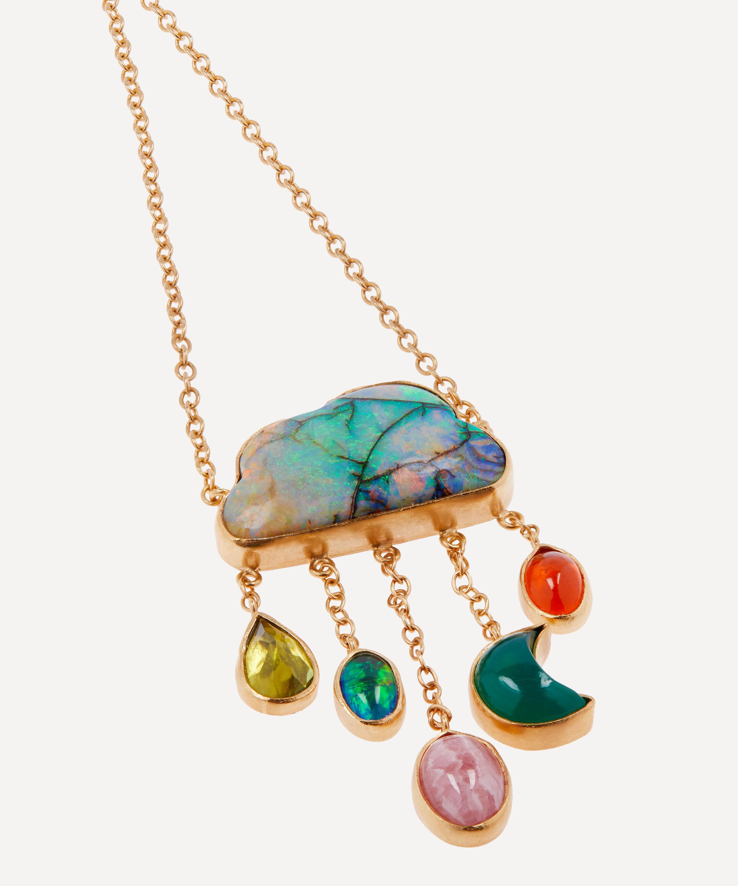 Handmade in Edinburgh, every Grainne Morton creation is formed of a wonderfully unique curation of found objects, coloured gems and tiny trinkets. Crafted from 18 carat gold-plated sterling silver, this fine chain necklace features an Ethiopian opal cloud pendant with a cluster of graduating chains and five mixed-cut, multi-coloured gems falling from the base like rain. Finished with a simple toggle clasp, it offers an unexpected juxtaposition of vintage and contemporary styles - wear with a pair of the brand's chandelier-style drop earrings for an artful evening look.