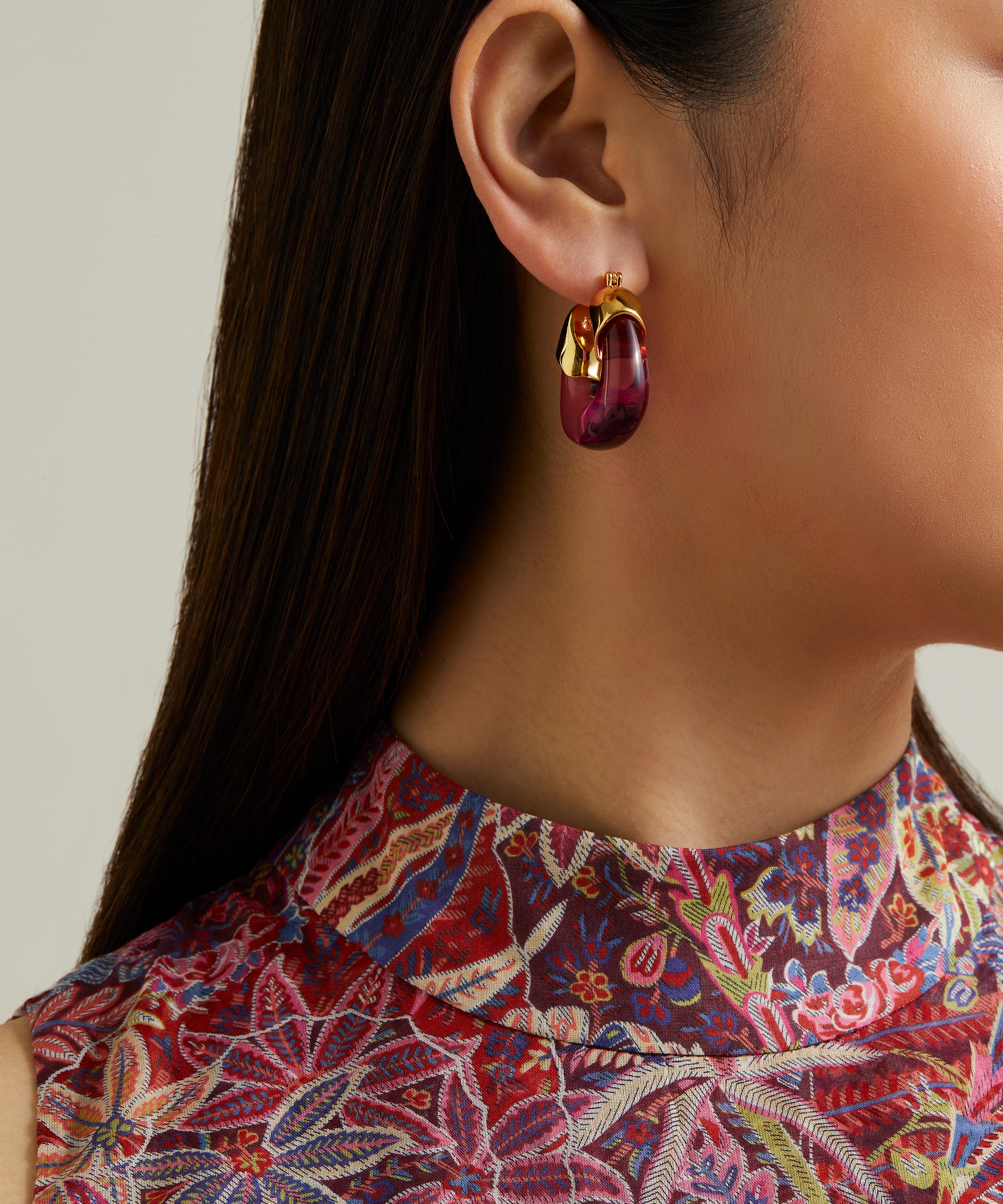 The Organic hoop earrings are part of Lizzie Fortunato`s artisanal jewellery collection – a triumph of innovative and vibrant designs that tell a story. Handcrafted from gold-plated brass, each earring features a sculpted pink resin hoop for a pop of colour, perfect for special occasions, or to add some dramatic flair to your everyday ensemble.