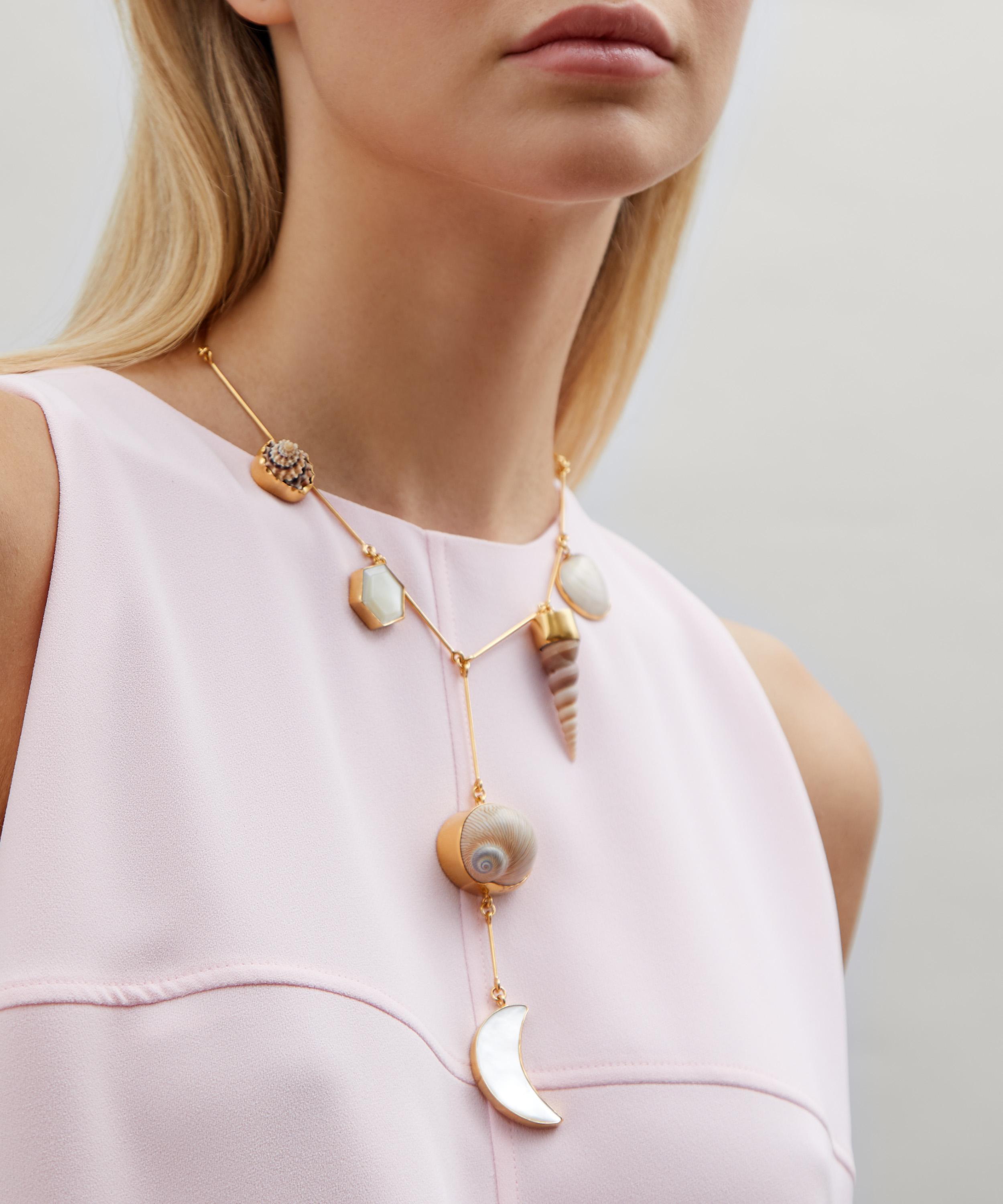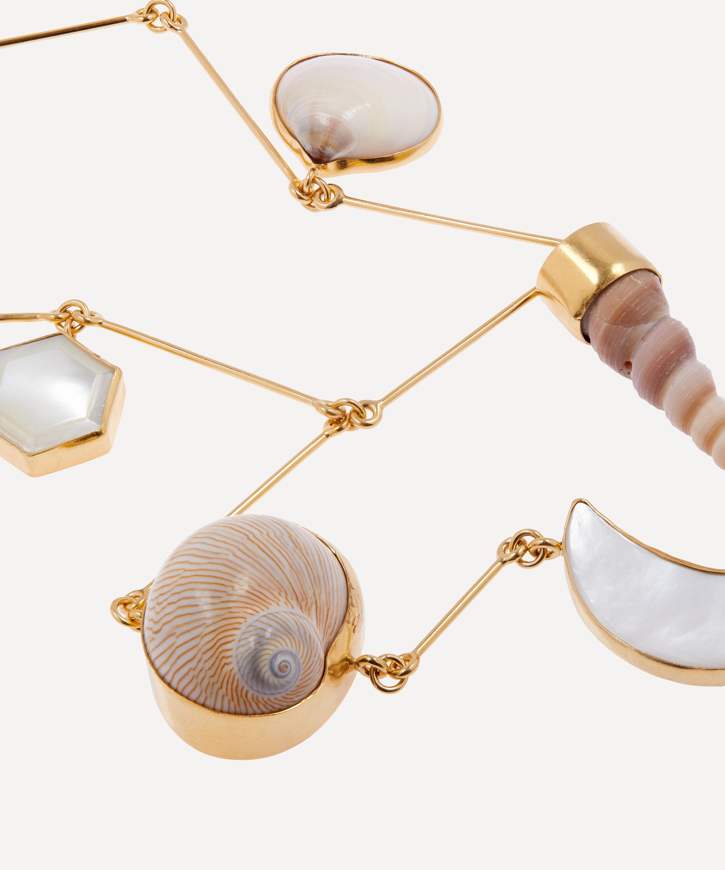 Handmade in Edinburgh, every Grainne Morton creation is formed of a wonderfully unique curation of found objects, coloured gems and tiny trinkets. Crafted from 18 carat gold-plated sterling silver, this statement necklace is formed of a string of long bar links with a Y-shaped lariat drop and six large mother of pearl and shell charms. Finished with a simple hook clasp, the sculptural design is perfect for pairing with a plunging V-neckline for an artful evening look.
