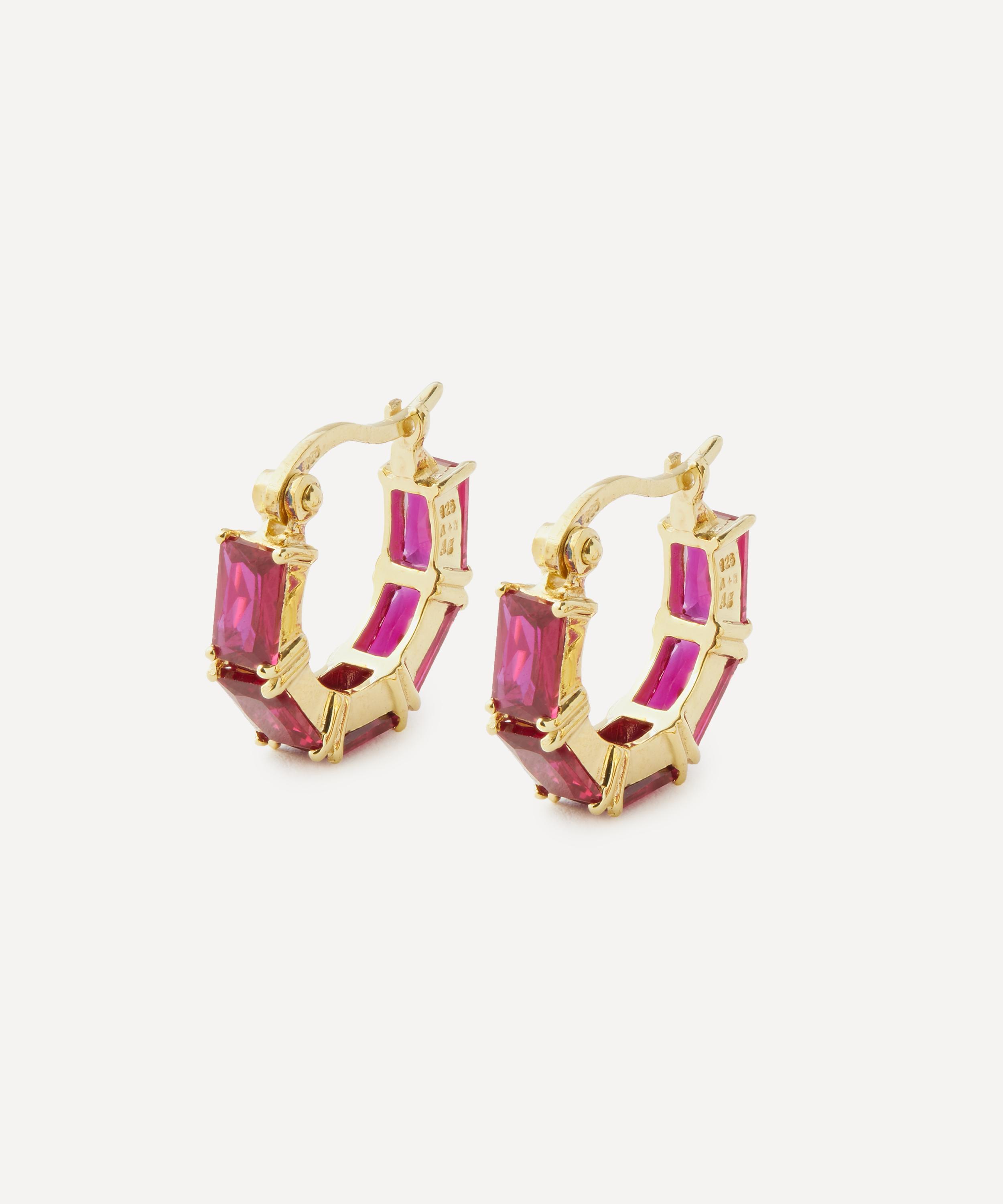 Crafted from gold-plated brass, these charming hoops are fitted with sparkling gemstones for an eye-catching aesthetic – incorporate them into a mixed ear stack with other hoops and studs for a vibrant, trend-led finish.