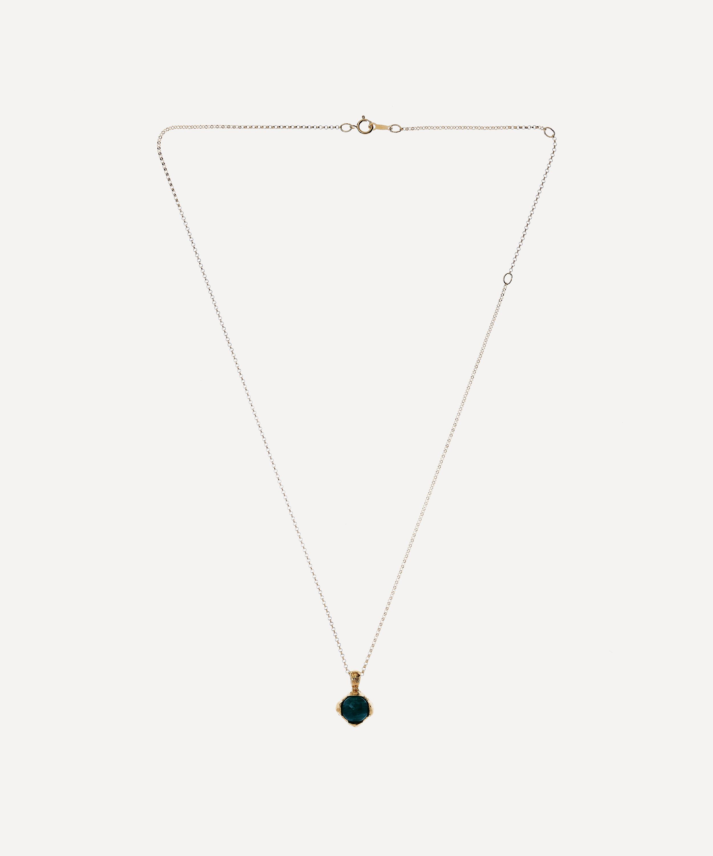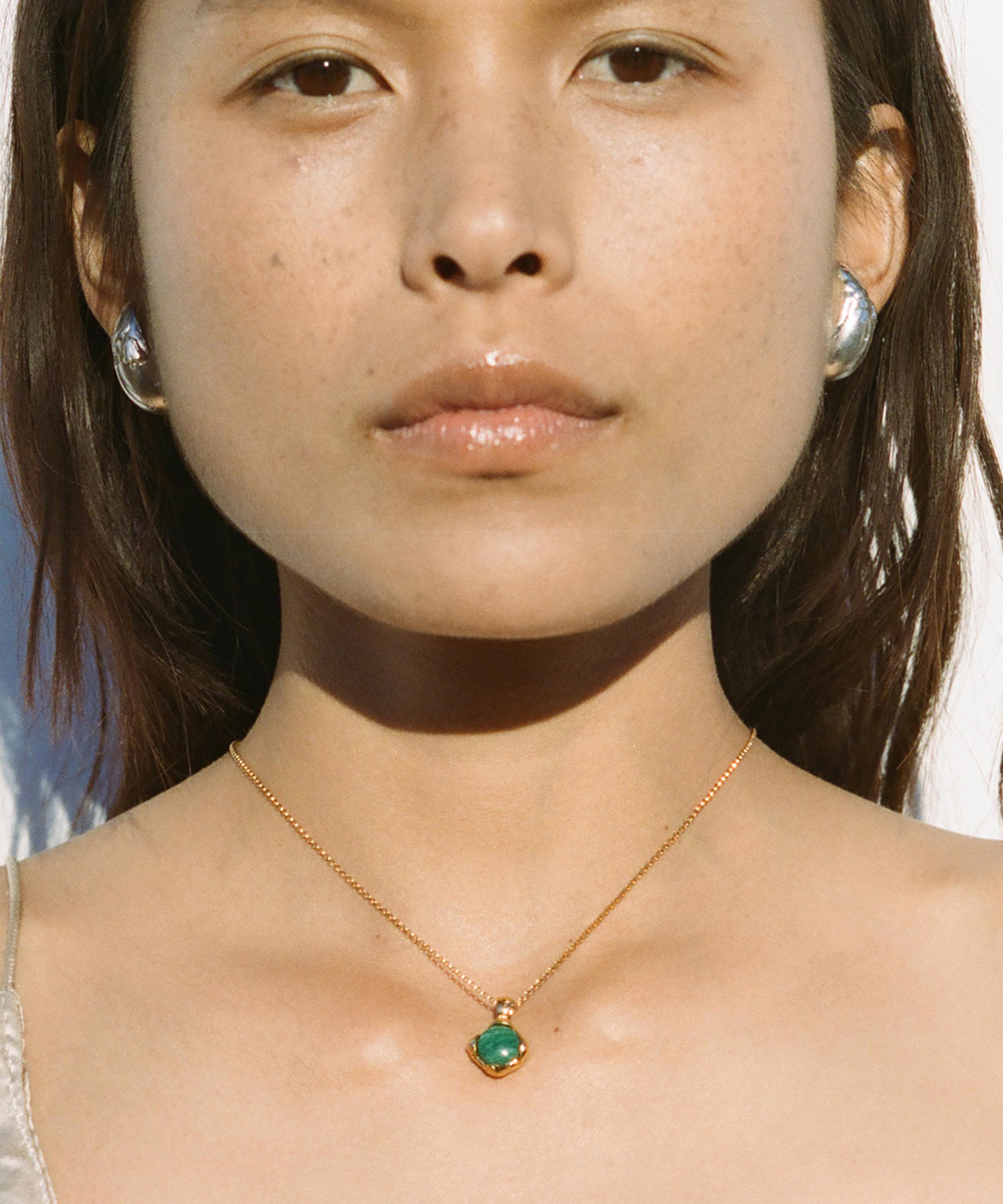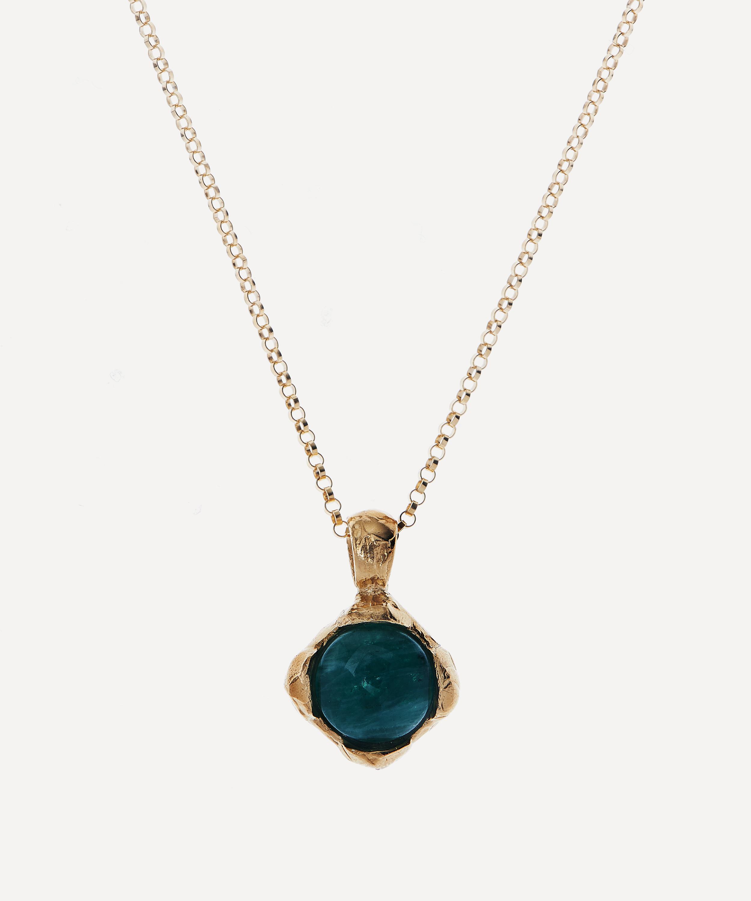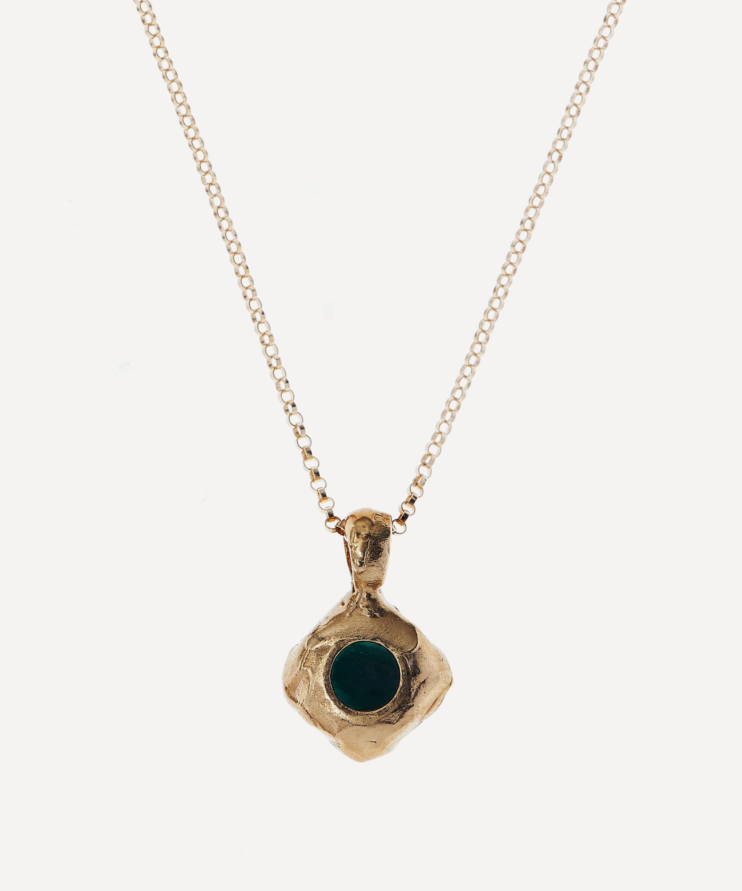 Crafted from 24 carat gold-plated bronze, this necklace features a gold-filled box chain and a textured drop pendant starring an emerald cobochon that recalls the moody colour summoned when you stare into the eye of the storm. Gift it to a loved one as a precious modern heirloom, or layer it with one of the brand's signature medallions for a talismanic evening look.