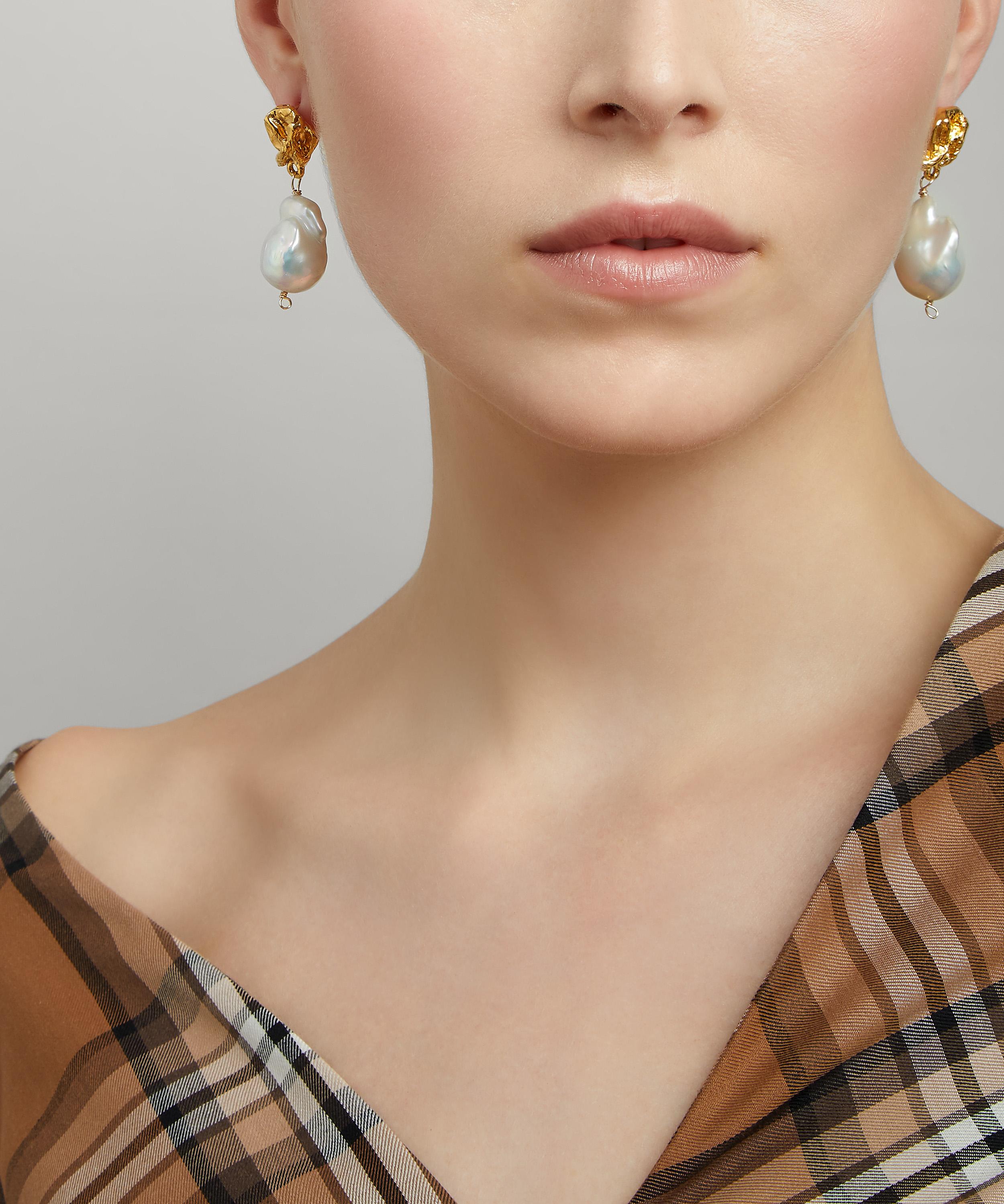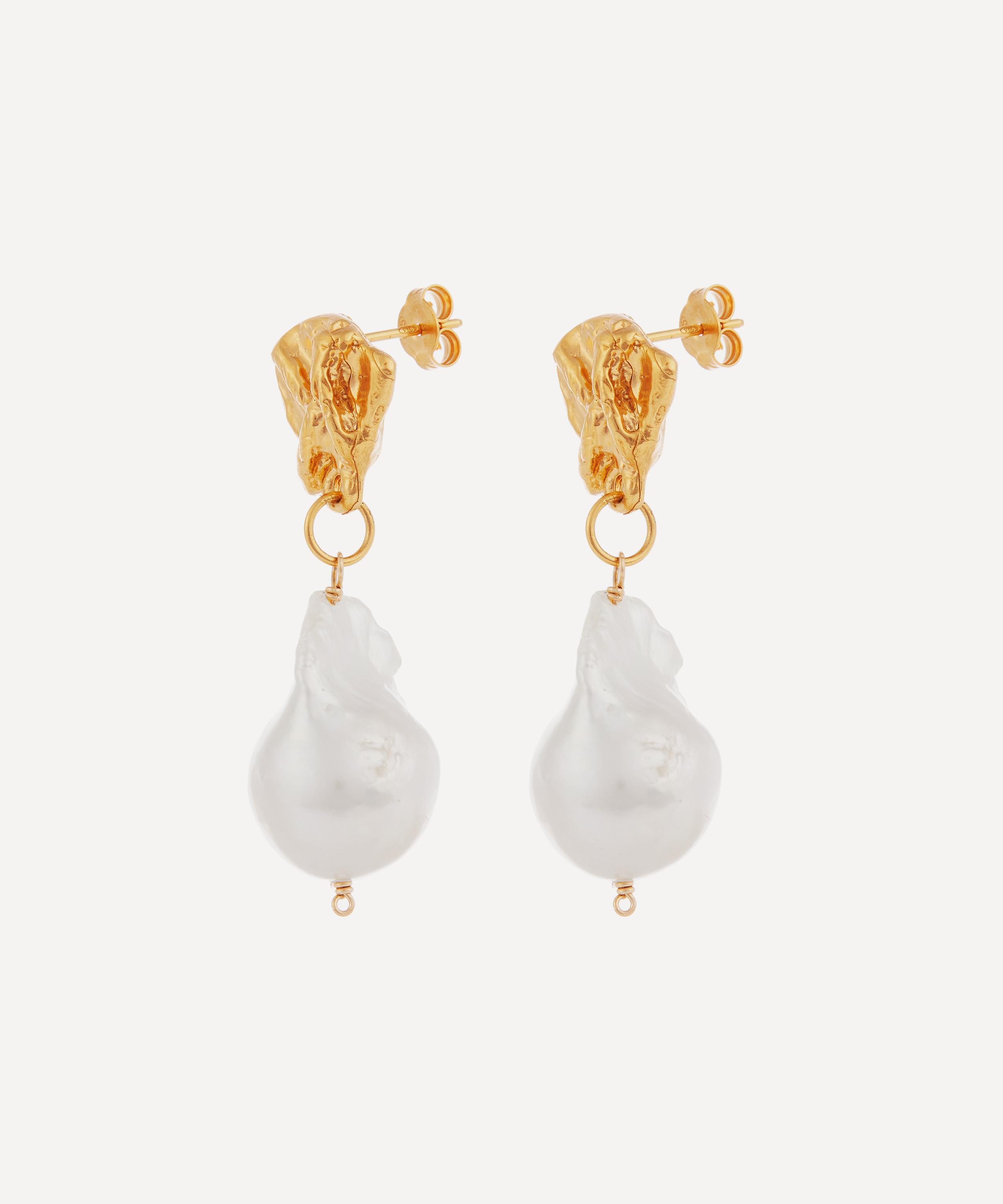 Alighieri's Home collection explores the ways in which we build homes and identities through pieces of jewellery, carrying them as daily reminders of the people we love and the places we've visited. Showcasing the brand's signature 24 carat gold-plating, each of these earrings features a small, textured stud with a large, subtly irregular baroque pearl drop. Style them alone with pulled-back hair or team them with a pair of the brand's small gold hoops for an off-beat, contemporary approach.