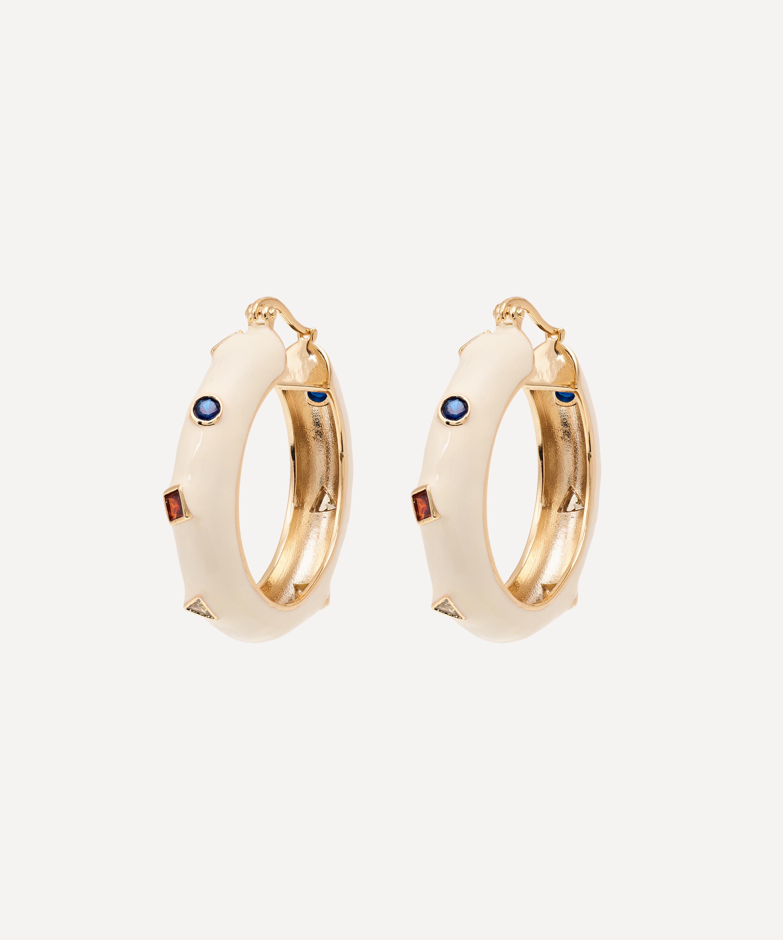 Smooth ivory enamel is scattered with faceted zirconia stones in rich sapphire blue and deep garnet hues, creating a subtle interplay of colour and light. Bold yet considered, their softly curved silhouette frames the face with effortless elegance. Wear them as a statement against pared-back tailoring or layered with treasured pieces for a look that feels both expressive and refined.