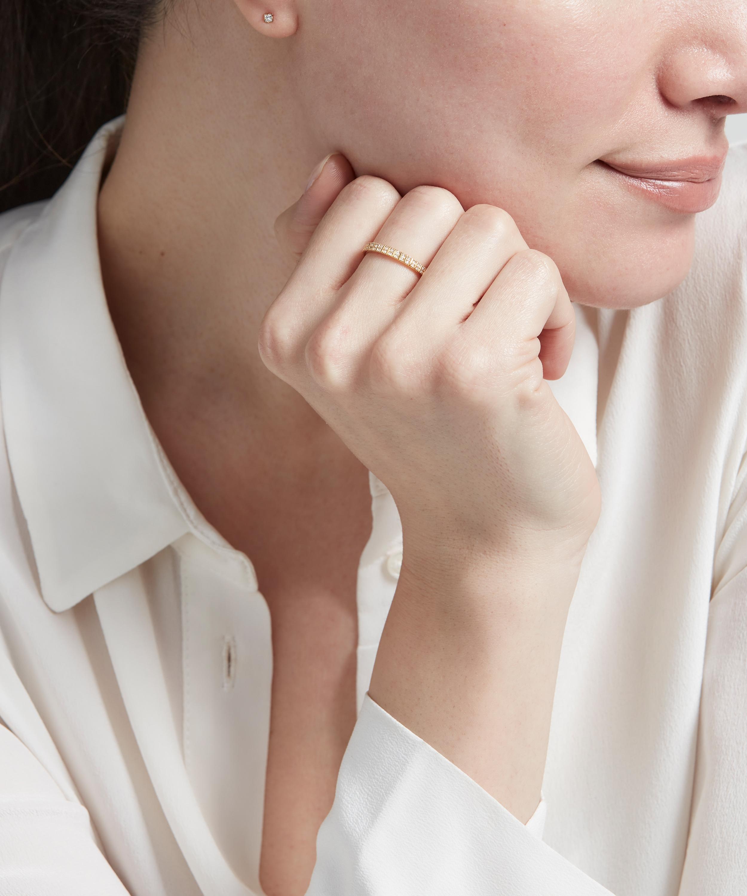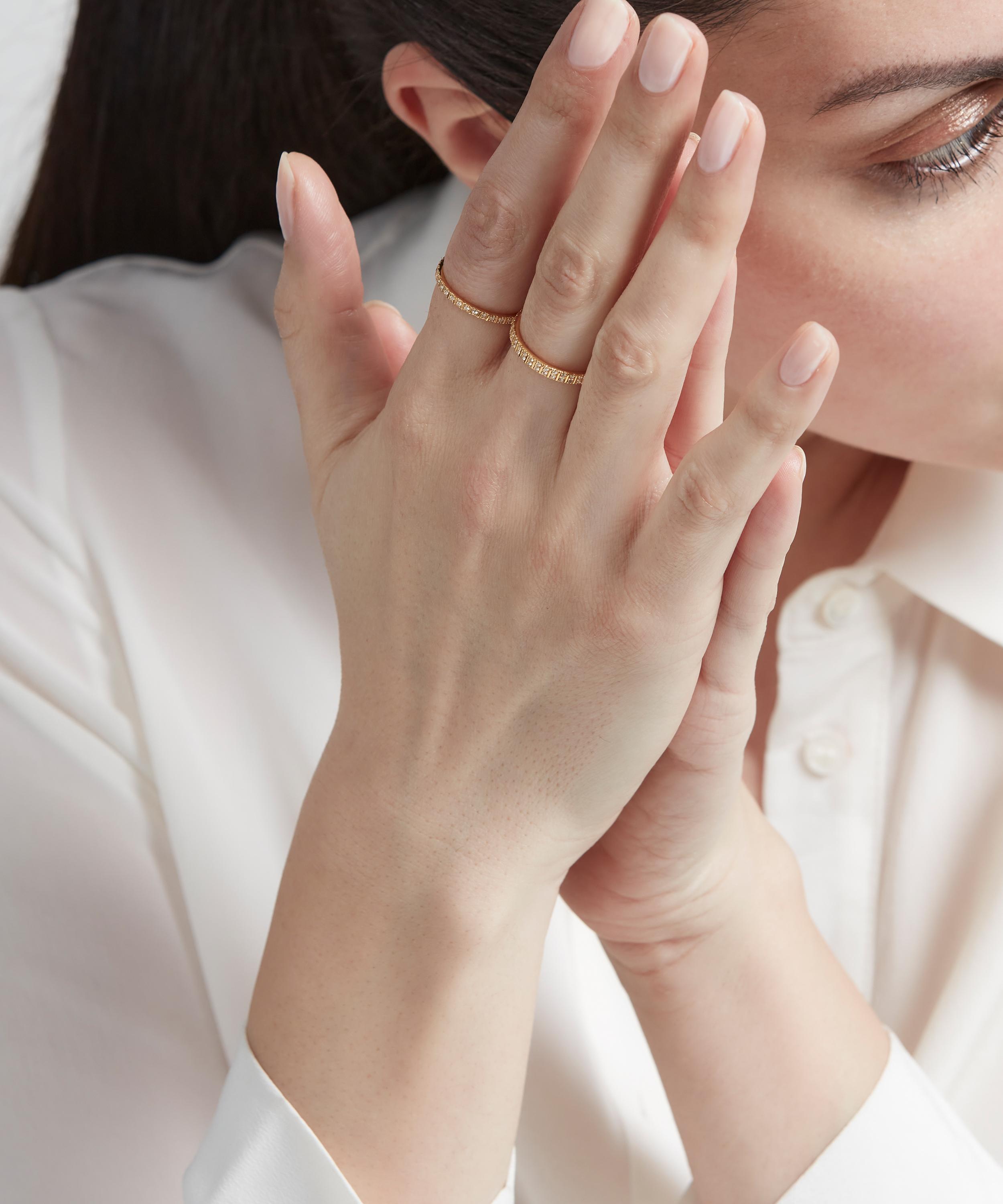 Designed with a slim band for seamless stacking, this high-polished eternity ring is studded with two rows of glittering white sapphires for a starry night sky effect. Perfect for gifting or adding to your own jewellery line-up, it can be worn alone, stacked with other bands or styled with several coordinating pieces from the collection for a dazzling, contemporary take on a classic celestial motif.