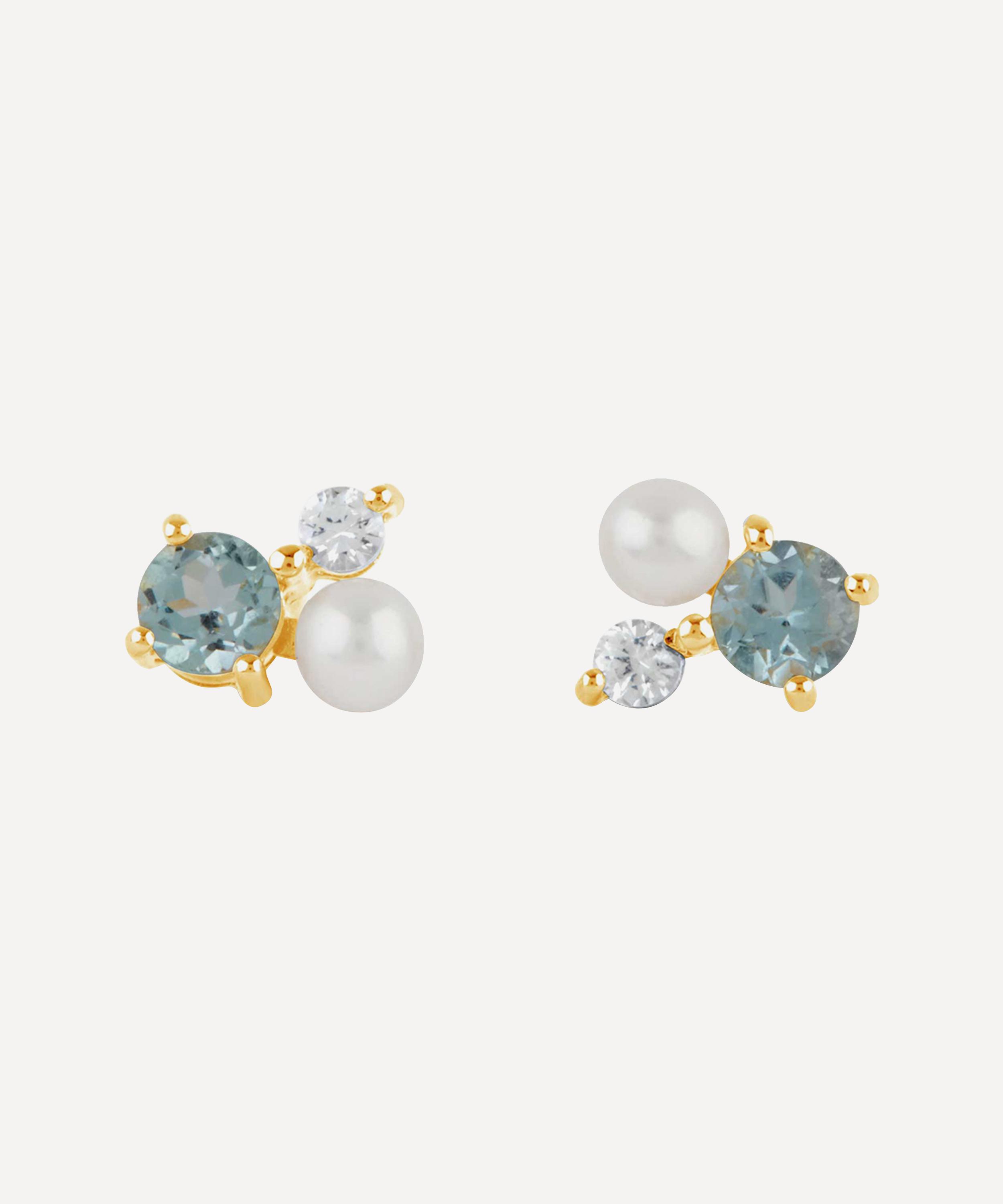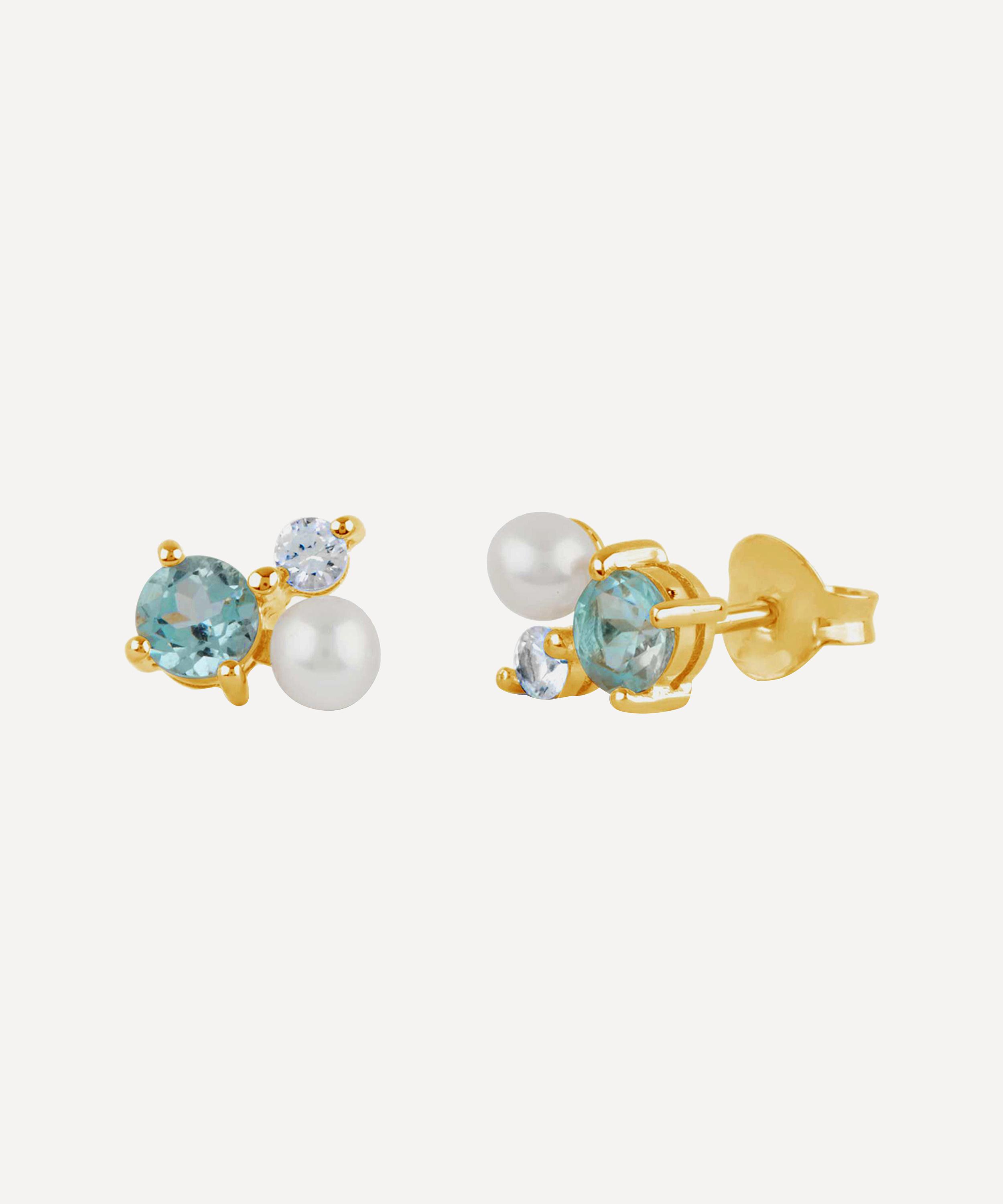 Dinny Hall's gold plated vermeil silver Gem Drop stud earrings are characterised by two trios of clustered pearl and topaz stones.