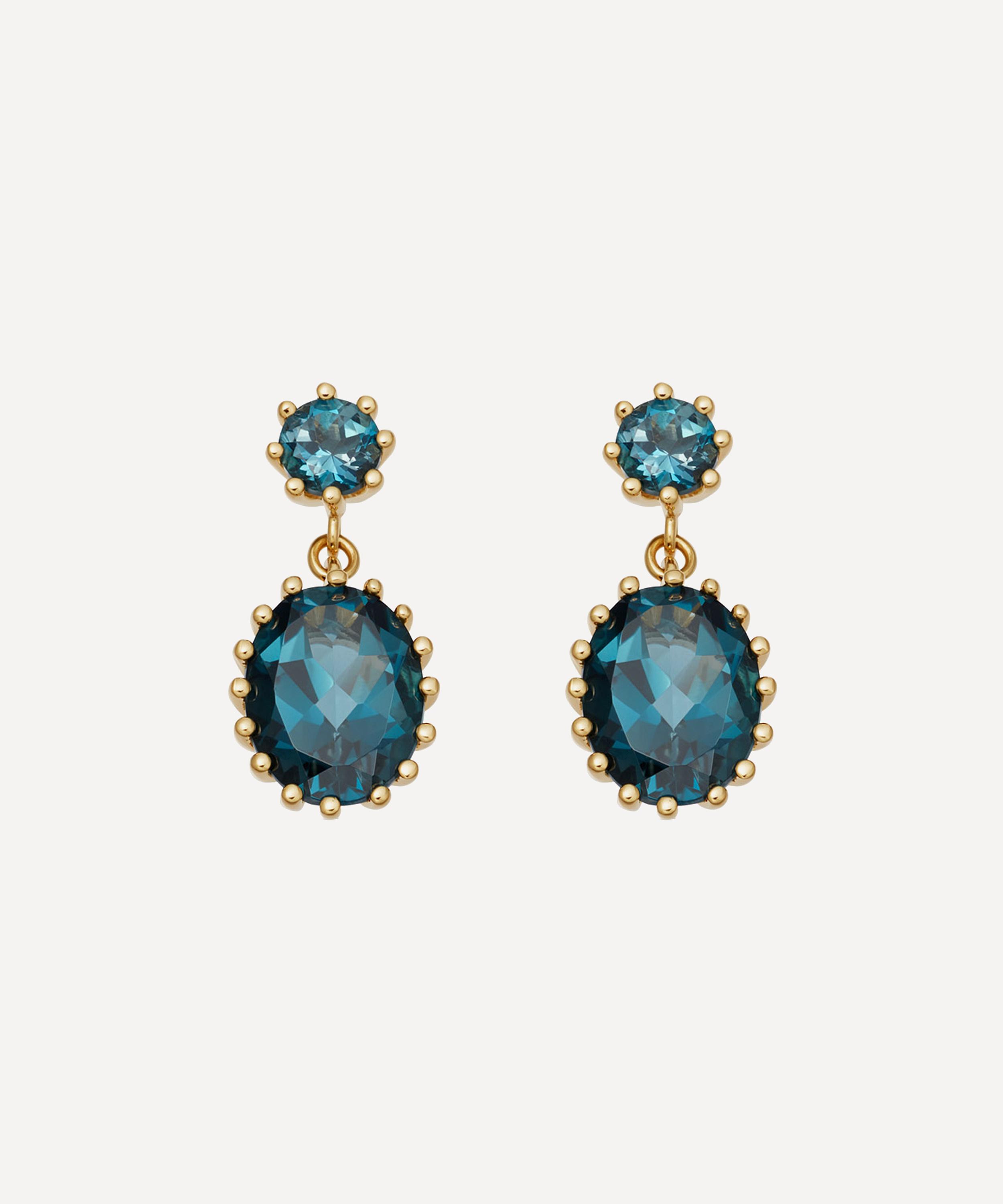 Characterised by a classic double drop design, each of these earrings features two faceted London blue topaz stones - a round cut stud and a larger oval cut drop - in decorative Linia basket prong settings. An elegant addition to any ear curation, they style beautifully with the brand's coordinating Linia studs for a vintage-inspired look with a colourful, complexion-illuminating finish.