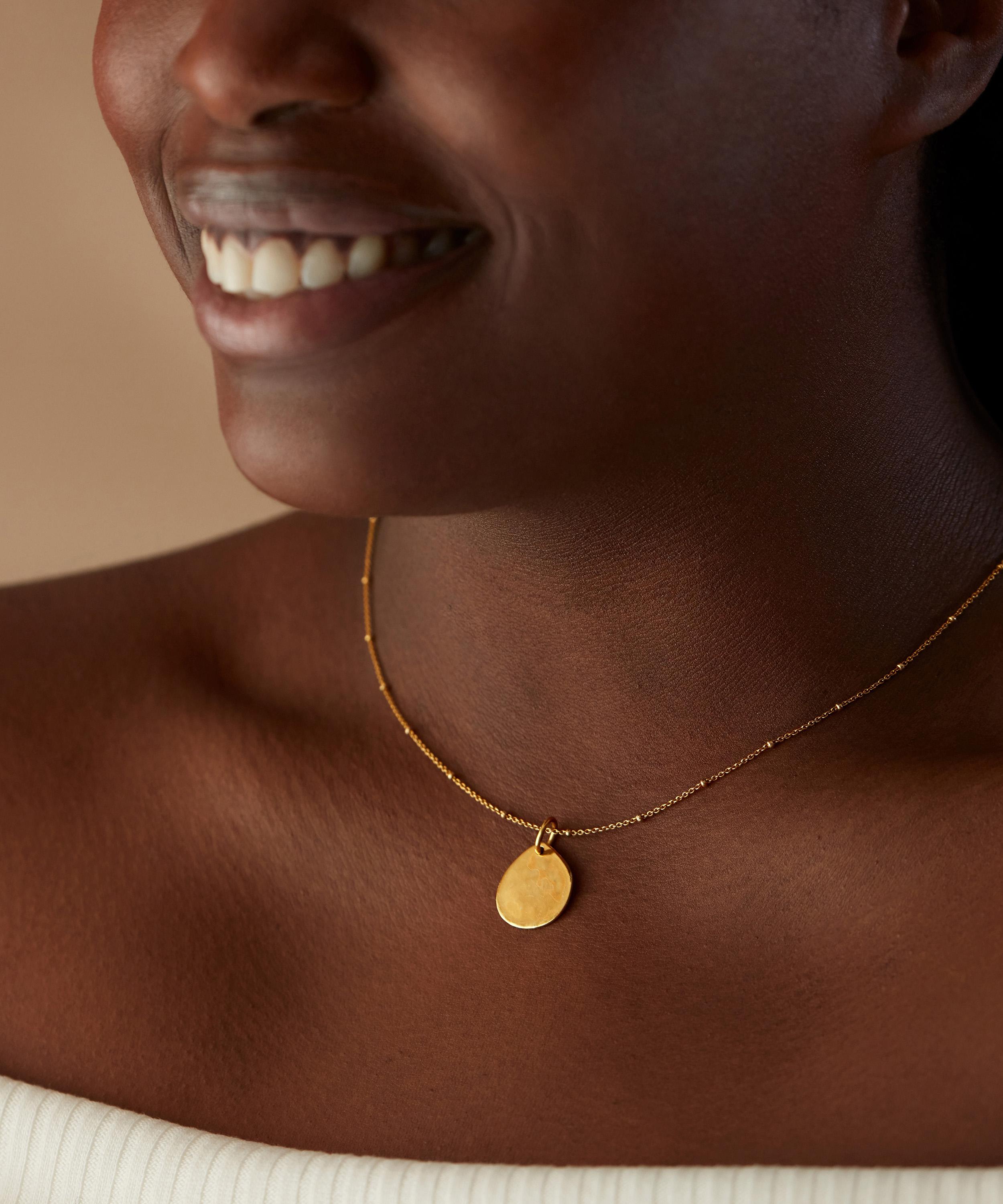 A blank canvas in 18 carat gold plated vermeil silver, this petite polished pendant takes on a subtly irregular, rounded shape with a lightly hammered surface for an organically-inspired touch. Perfectly suited to engraving, it is the ultimate in everyday versatility - style it solo on a fine gold chain or team it with a selection of other plain gold and gem-encrusted charms for an individual, contemporary feel.