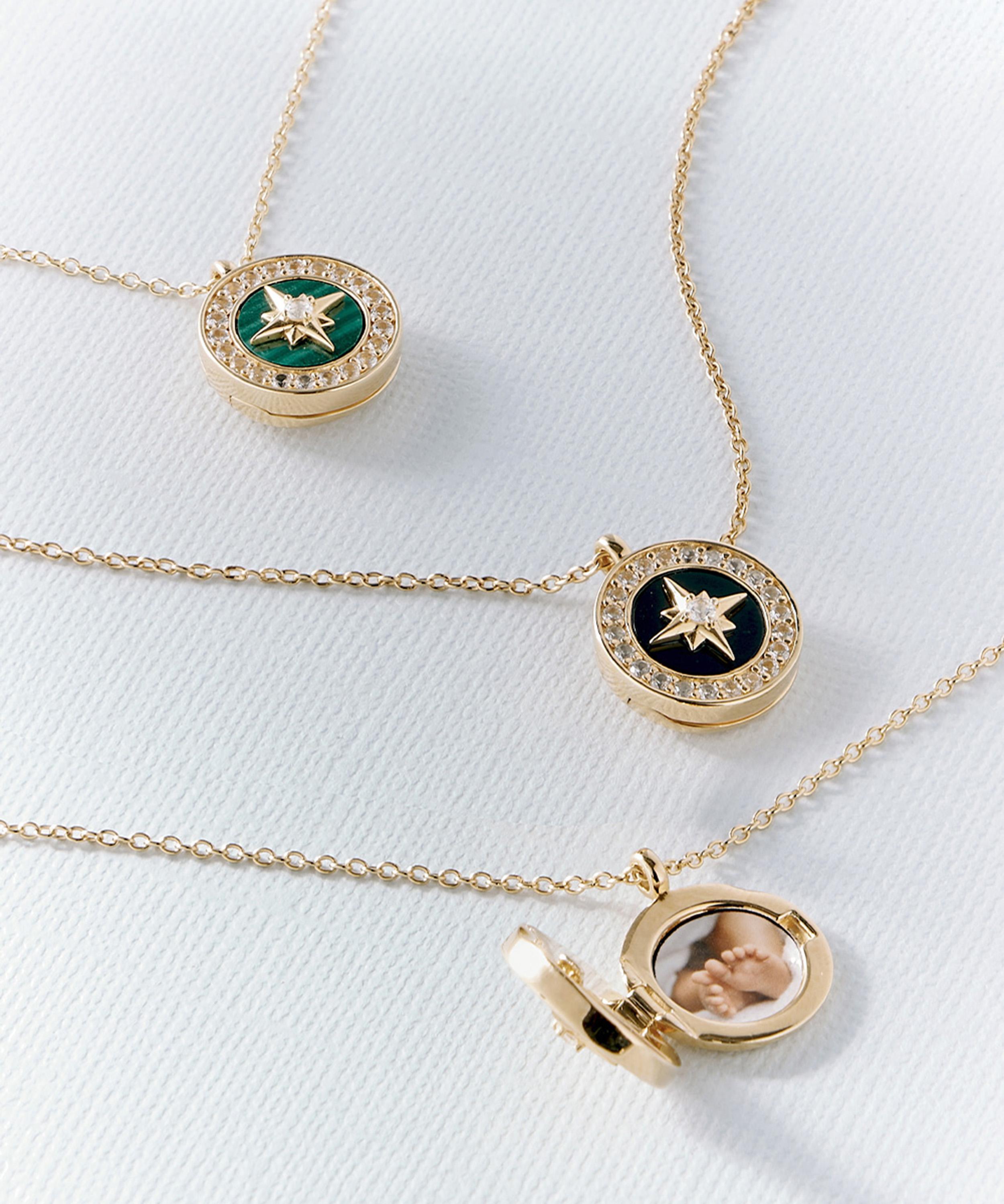 Inspired by the beauty of the North Star, this necklace features a small round locket pendant detailed with a central sapphire set star motif surrounded by black onyx and encircled with glittering white sapphires. Perfect for gifting or adding to your own jewellery line-up, it can be worn alone, layered with other chains or styled with several coordinating pieces from the collection for a bold, contemporary take on a classic celestial motif.