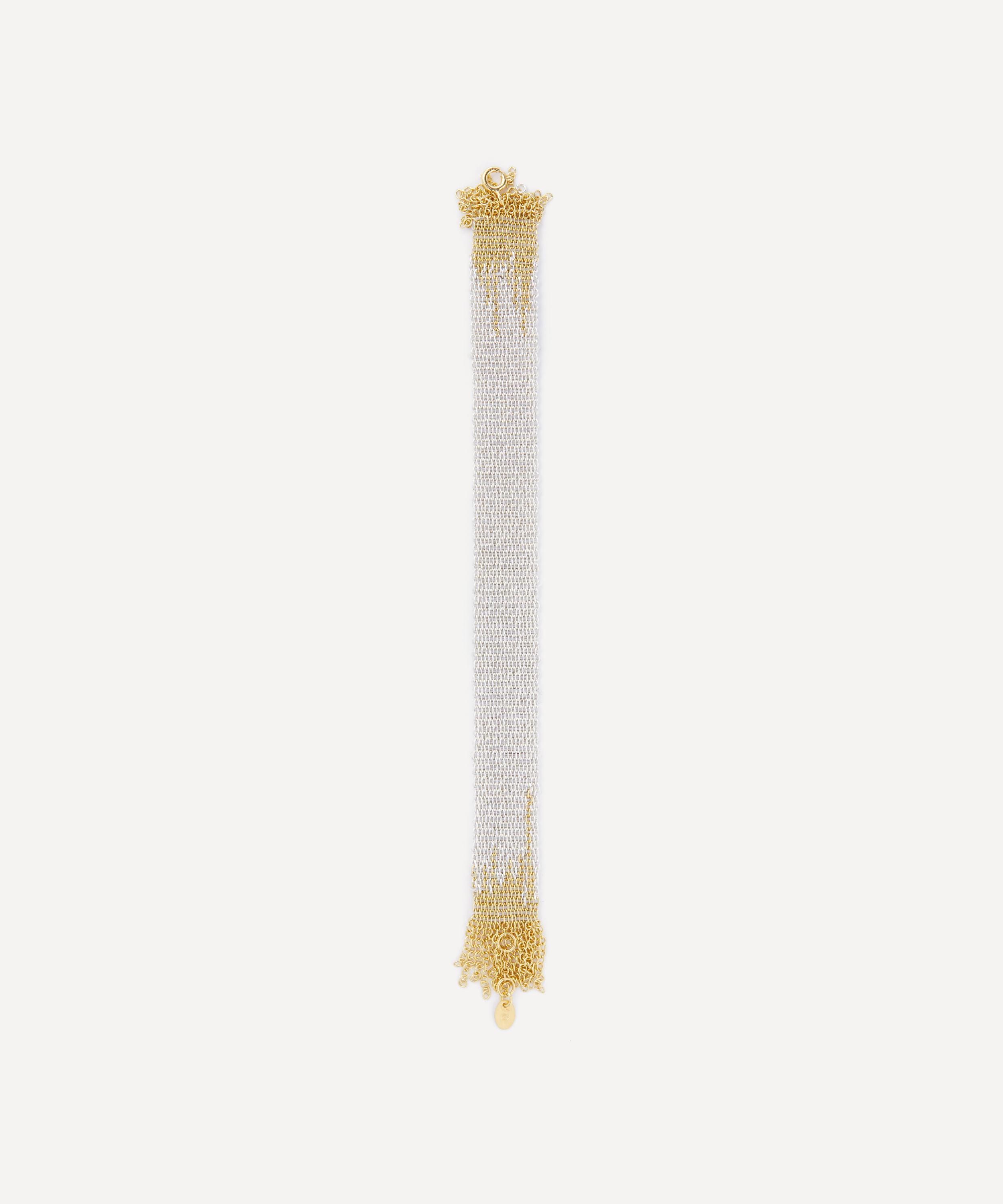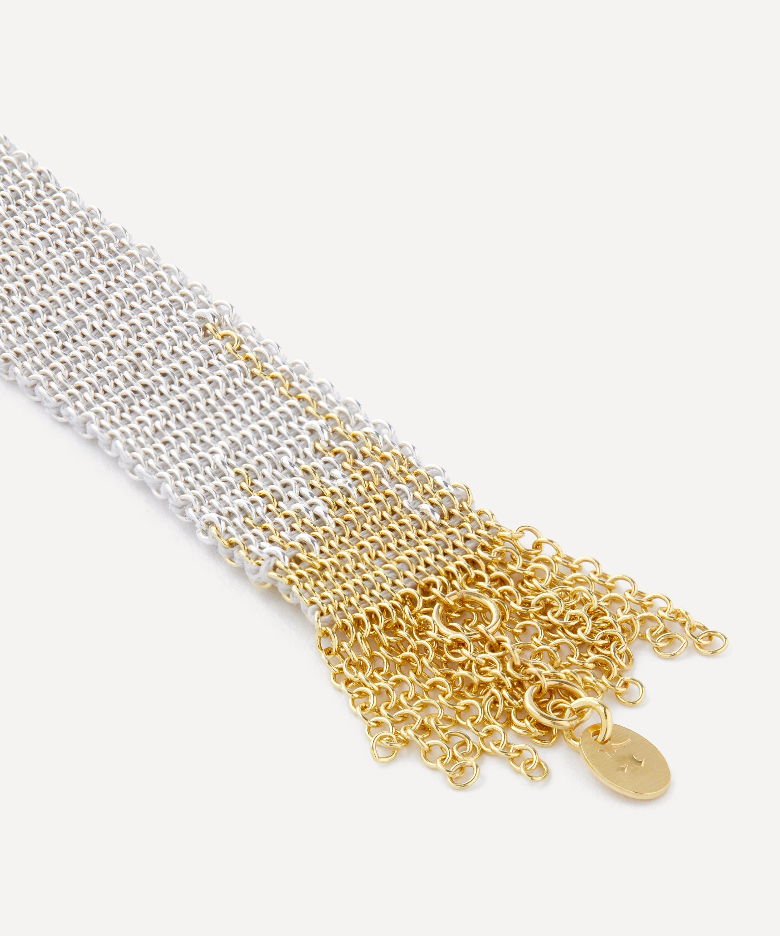 Boasting an edgy addition to your edit, this bracelet by Stephanie Schneider showcases the designer's distinctive chainwork. A cluster of fine trace chains in gold-plated silver and sterling silver are woven together to create a chainmail cuff with a degrade colour effect. Drawing on the designer's textile background, this piece is interwoven with silk thread for a tonal effect and finished with a double spring clasp. Wear it alone, or pair it with one of the brand’s matching necklaces and earrings for coordinating curation.