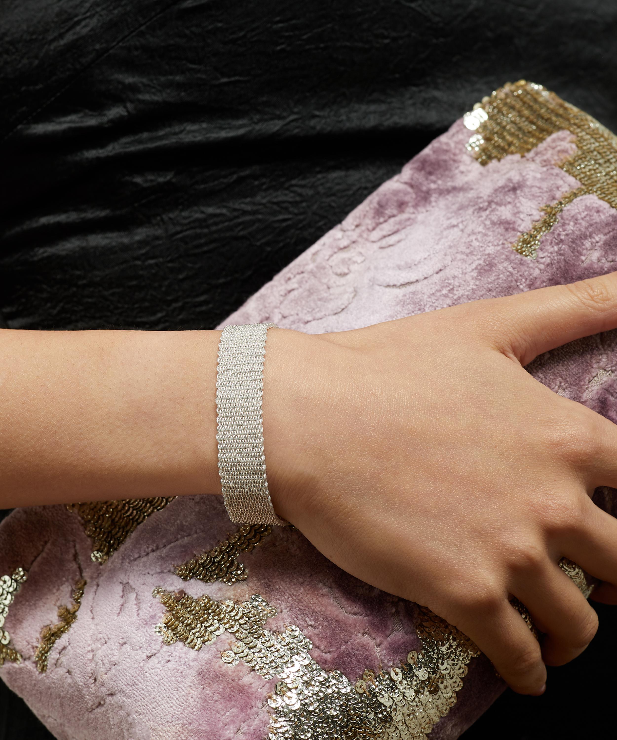 Employing her background in textiles as a catalyst for her work, Stephanie Schneider uses time-honoured handcrafting techniques and traditional jeweller’s materials to mimic the fibrous textures and weave structures of fabric. Using delicate chains as her device, Stephanie intricately arranges and interlinks each of her creations, hallmarking each piece with painstakingly hand-threaded silk, mohair or semi-precious stones. An enchanting collection of precious metal armour ensues, referencing textile trims and techniques including fringing, patchwork and weave. Stephanie Schneider is available exclusively in the UK at Liberty.