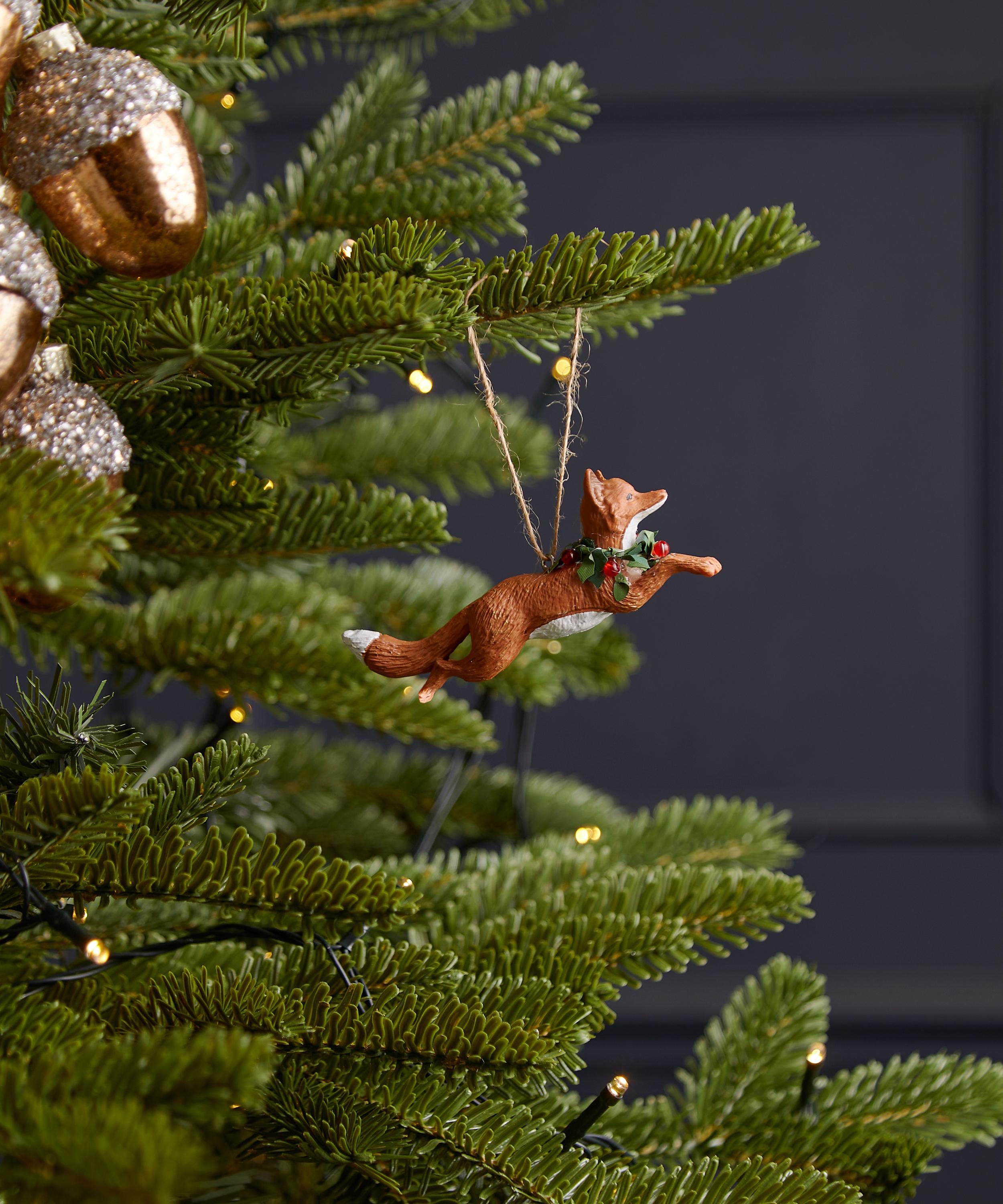 Adorned with glitter accents atop a cunning fox, this decoration pairs effortlessly with any frosty white baubles or animal-themed ornaments.