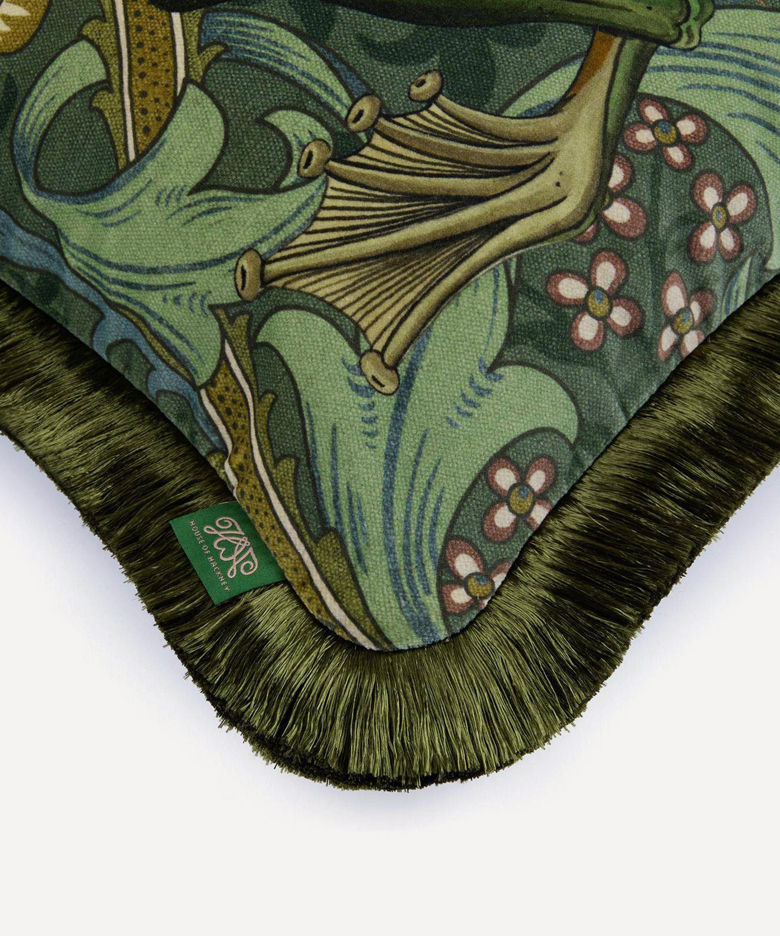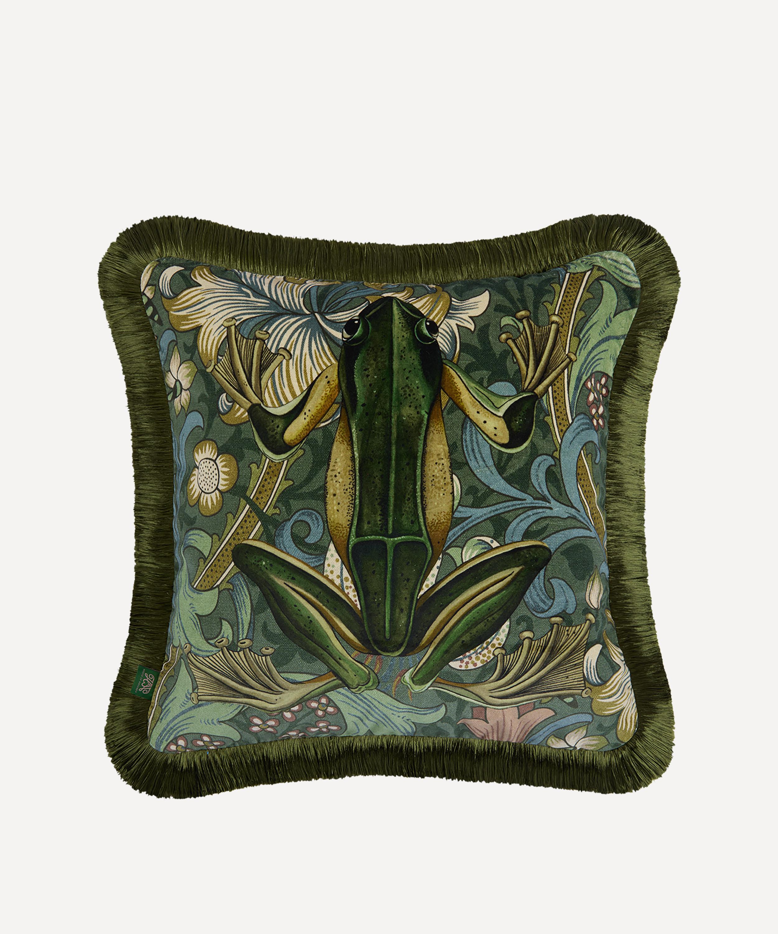 Expertly crafted by skilled artisans in Britain, this plush velvet cushion showcases the iconic Golden Lily print by William Morris – an alluring display defined by an amphibian resting atop verdant florals and acanthus leaves – in luscious tones of green, blue and gold. Complete with fringing and packed with British wool for optimal comfort, it brings a luxurious finishing touch to your seating arrangements or bedspreads.