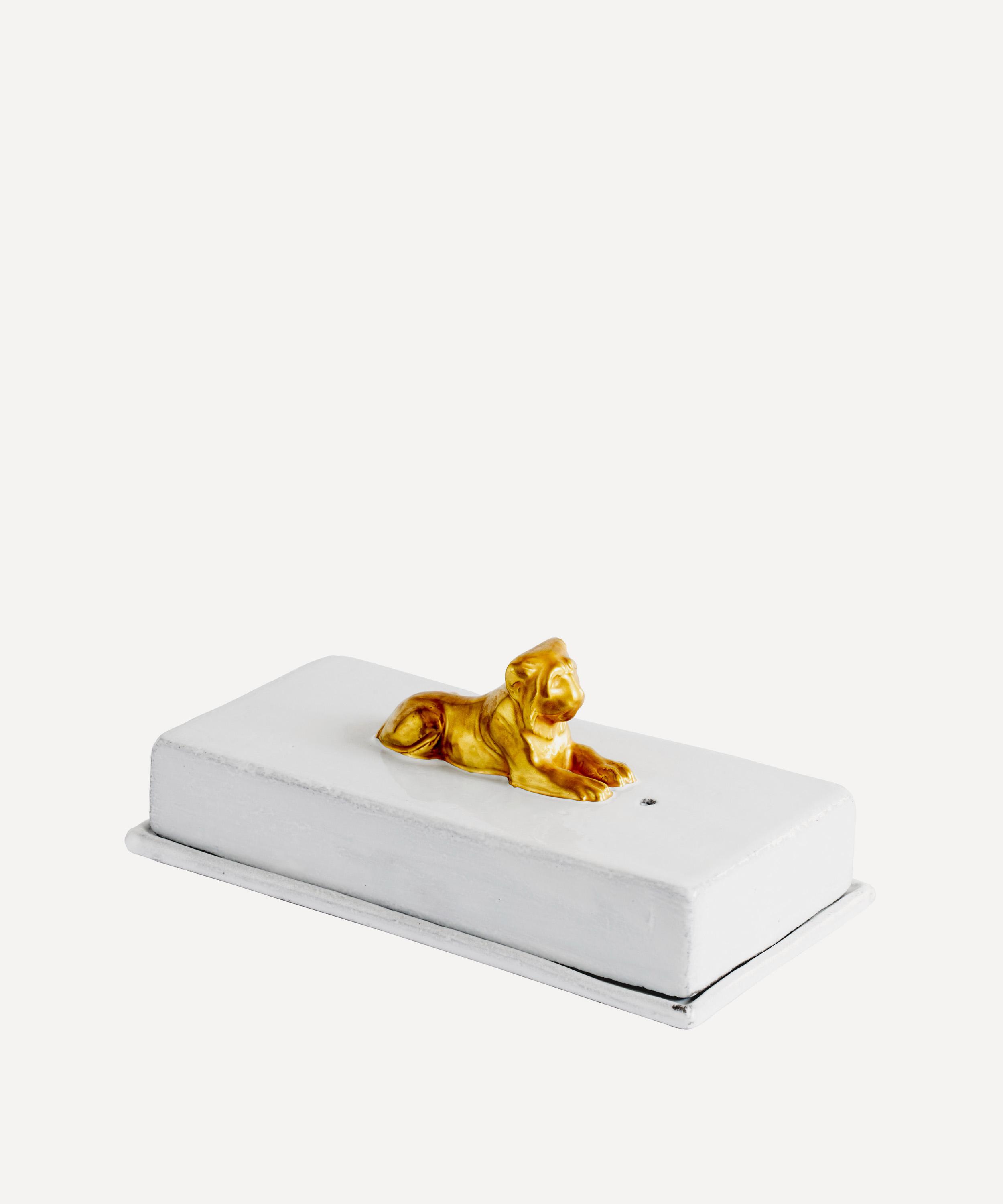 Votary of pre-industrial fabrication, Astier de Villatte is celebrated for being the one and only studio in Paris to hold and harbour the traditions of artisanal ceramic production. Restoring the ancestral systems of moulding and stamping, this incense box is made using handcrafting techniques from the Middle Ages which involve moulding a handmade sheet of clay, double firing the ‘biscuit’ piece and glazing the product in white enamel – a lengthy process that involves a drying time of up to one month. Characterised by elegant gold lion resplendent to the top, this incense box is engraved with the brand’s signature crest - depicting an interlacing A & V - alongside the initials of one of the 40 master artisans who created it. Each handmade piece tells a beautiful story, it romances and imparts a sense of nostalgia into its owner. Arrange on a shelf or mantle for an elegant locale for your favourite scent to smoulder.