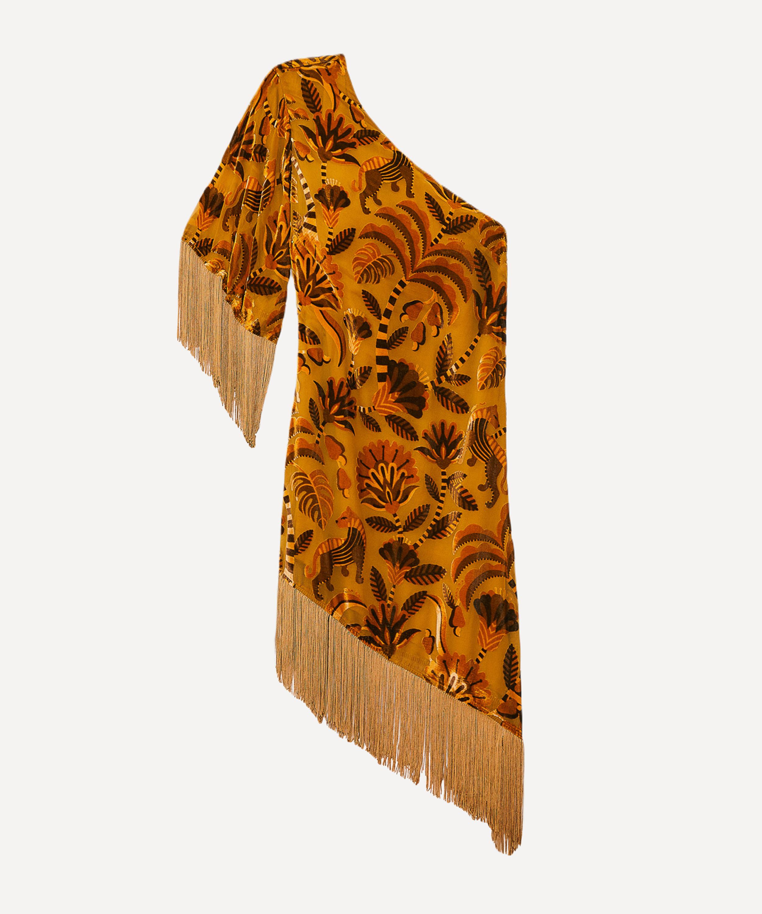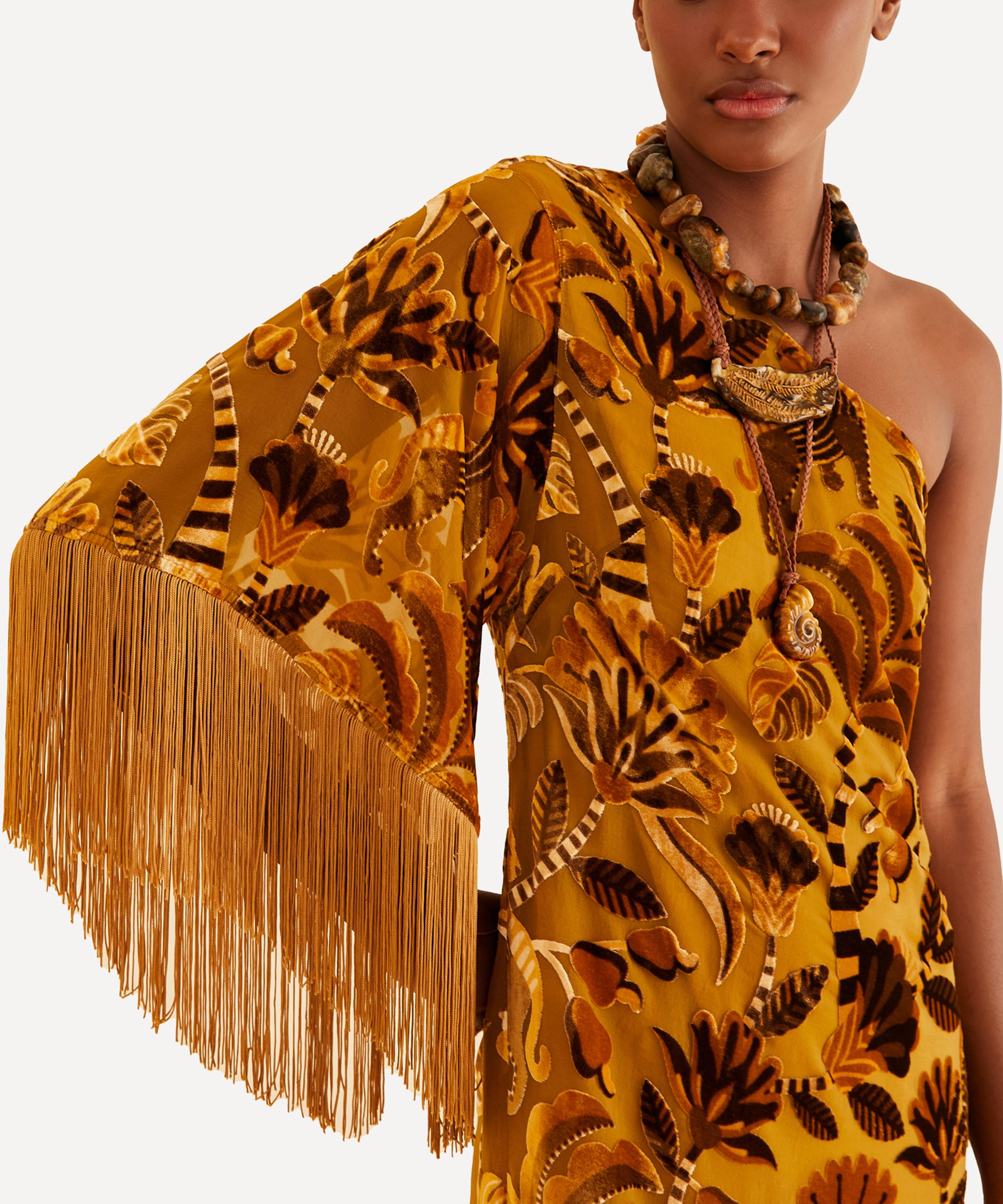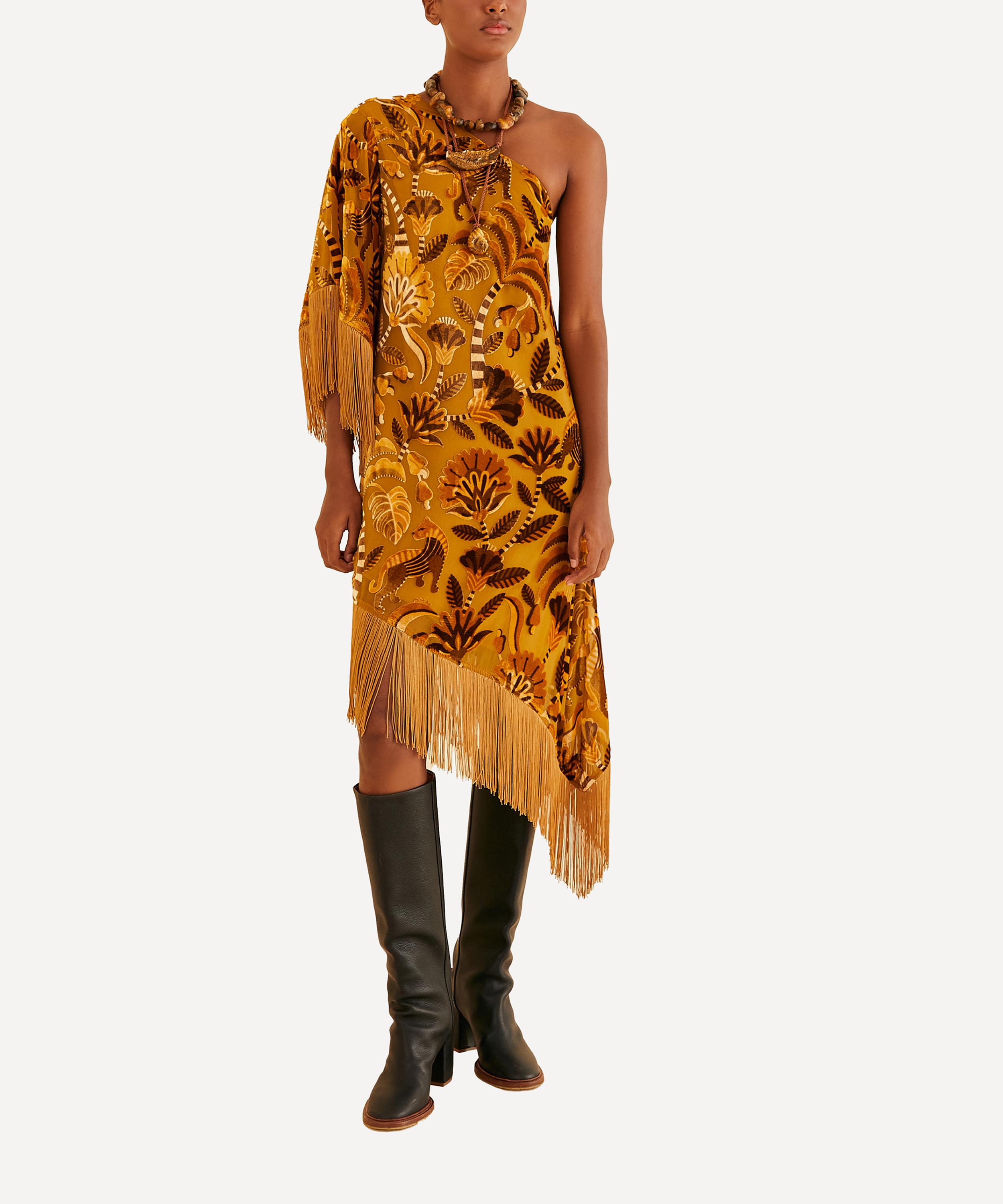 The Golden Yellow Velvet One-Shoulder Fringe Dress from Rio de Janeiro-based label FARM Rio brings some Brazilian vivacity to your new-season edit.