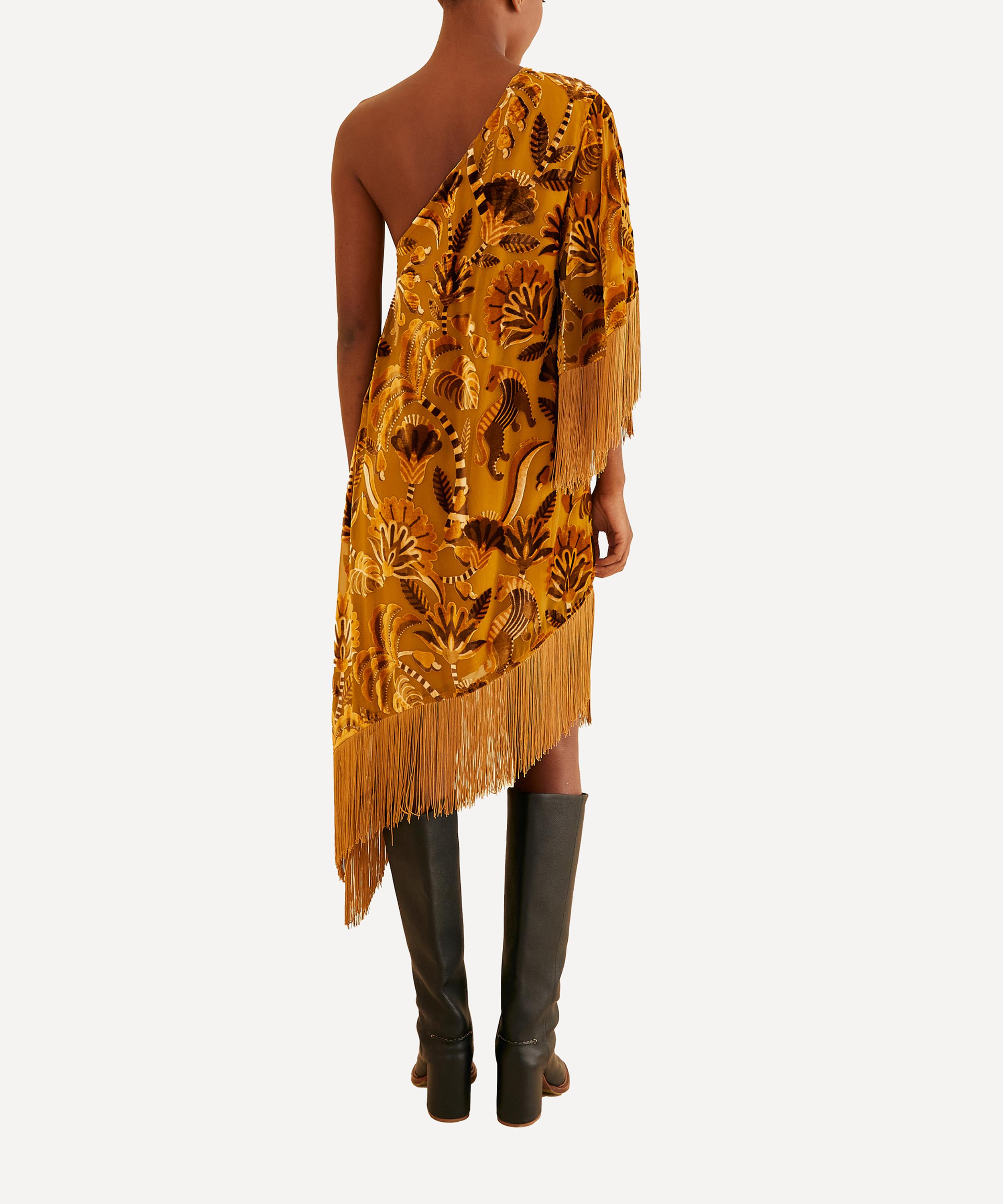 Crafted from golden-yellow velvet fabric embossed with a tropical flora and fauna design, this statement one-shoulder dress features fringe detailing along its single sleeve and asymmetric hem.