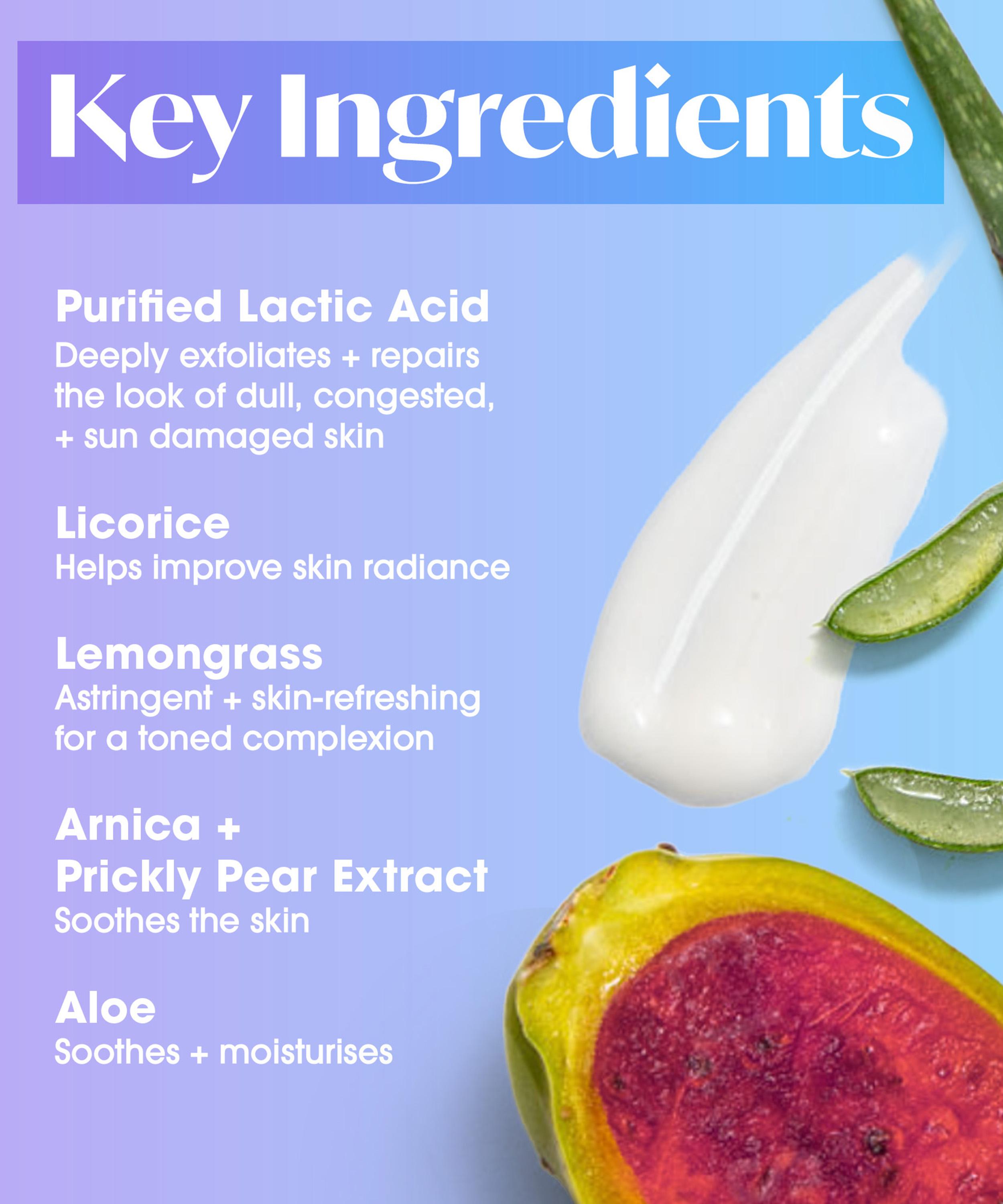 - Formulated with purified lactic acid, liquorice, lemongrass, arnica and prickly pear extract, aloe vera