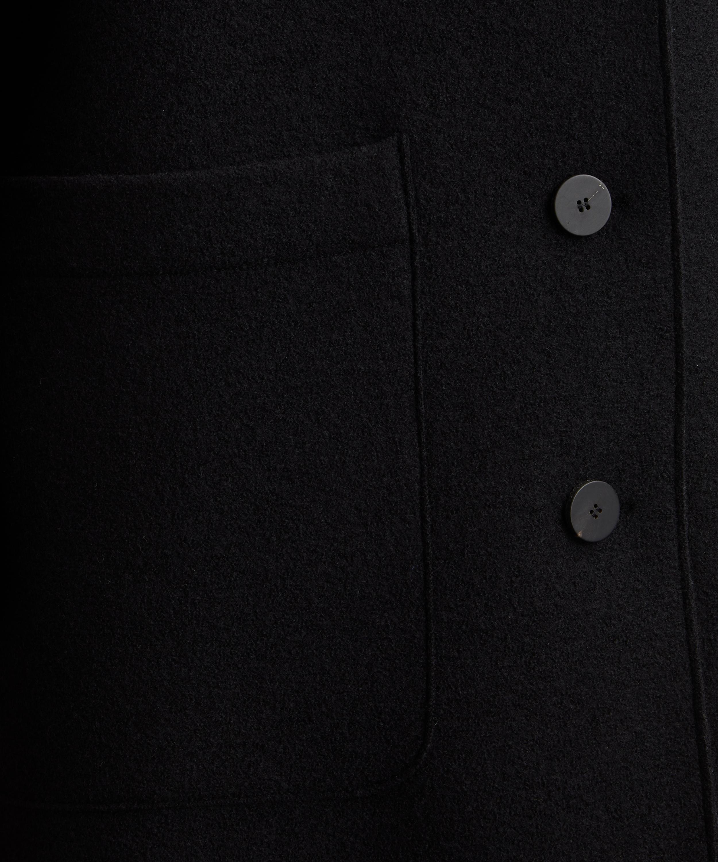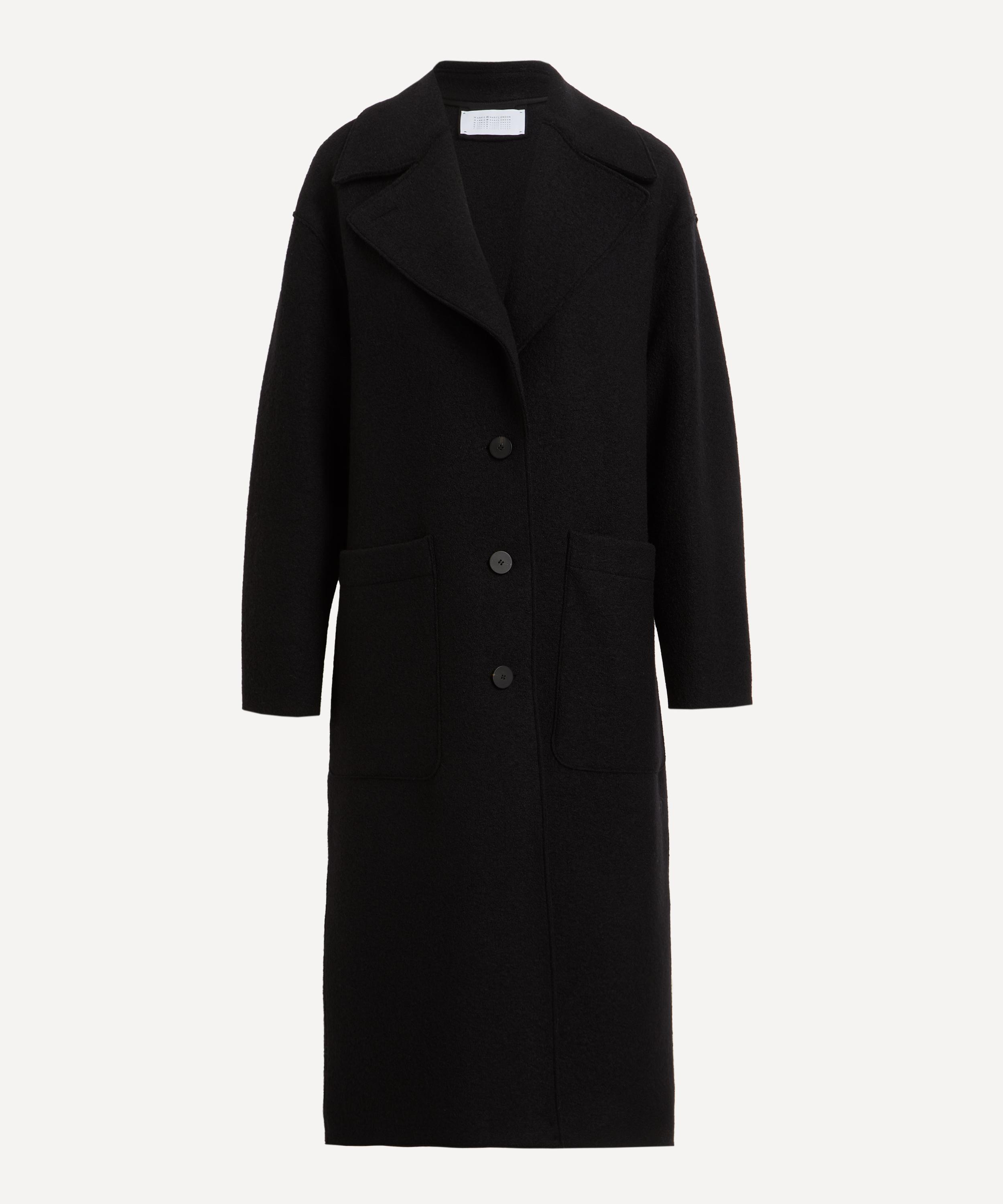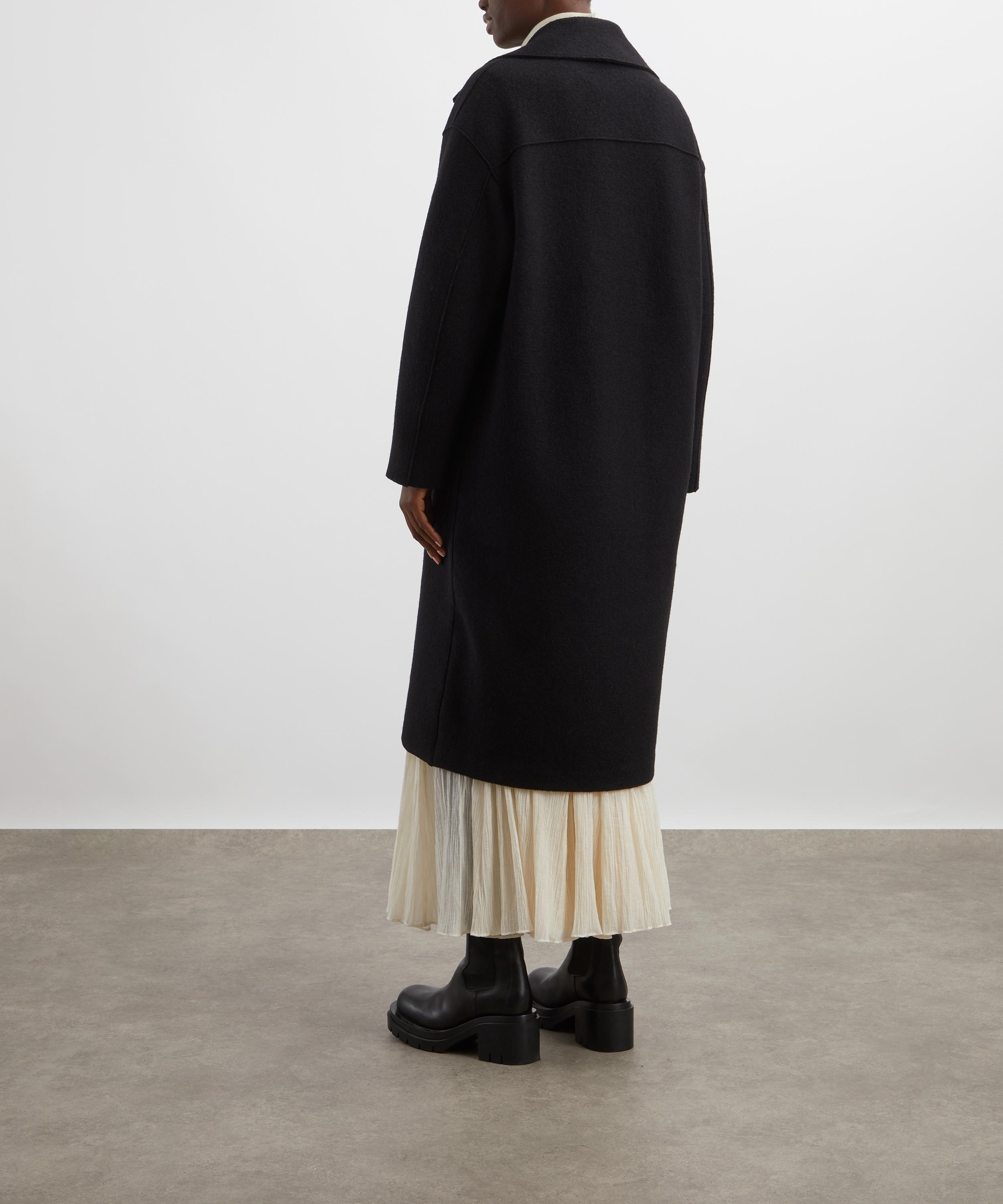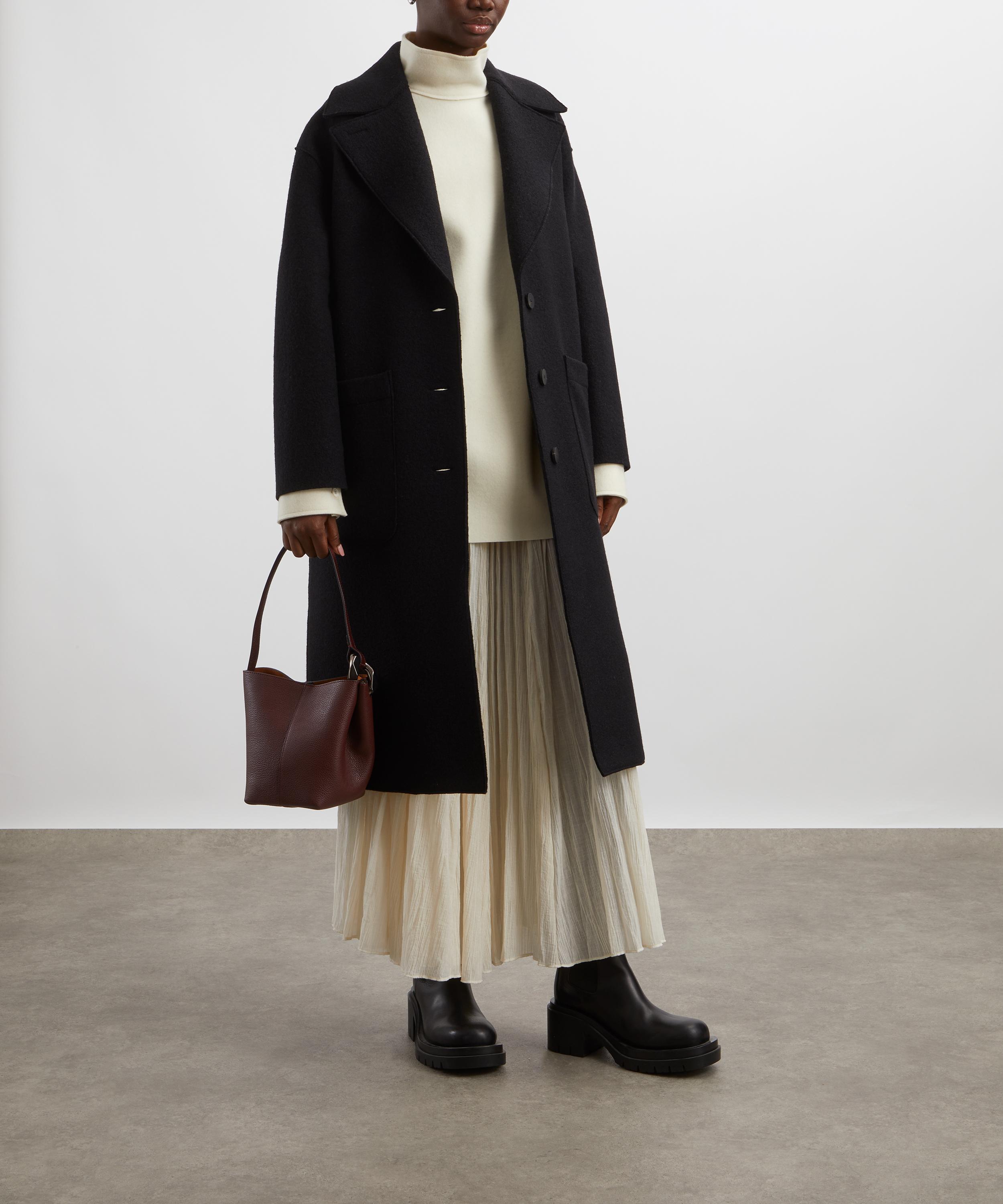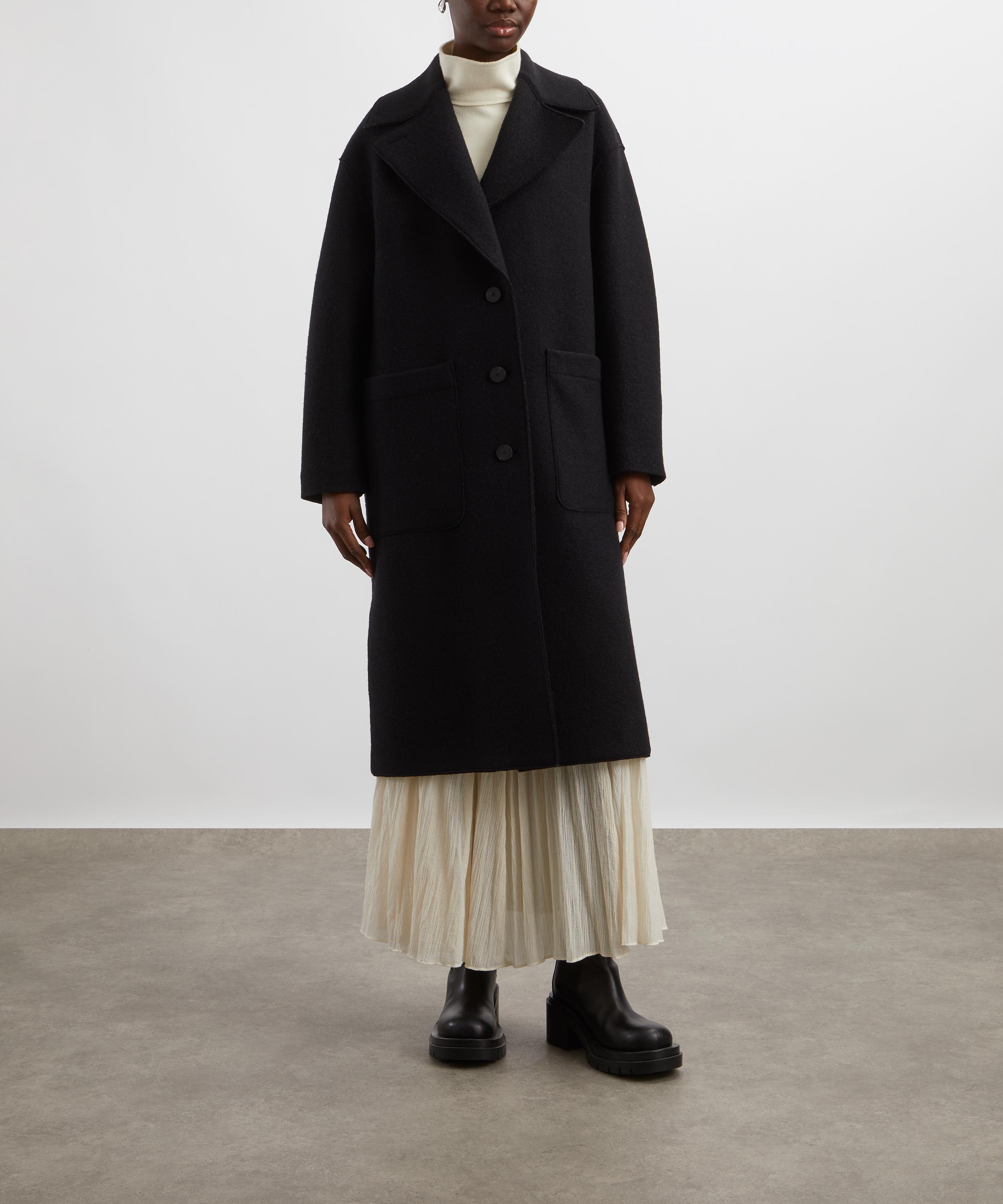 It’s meticulously crafted in Italy from boiled wool yarns – the boiling process shrinks the wool and creates a softer, tighter handle that locks in warmth. The coat is unlined and shaped to an oversized silhouette with wide notch lapels and generous patch pockets, reflecting the label’s flair for streamlined staples that stand the test of time.