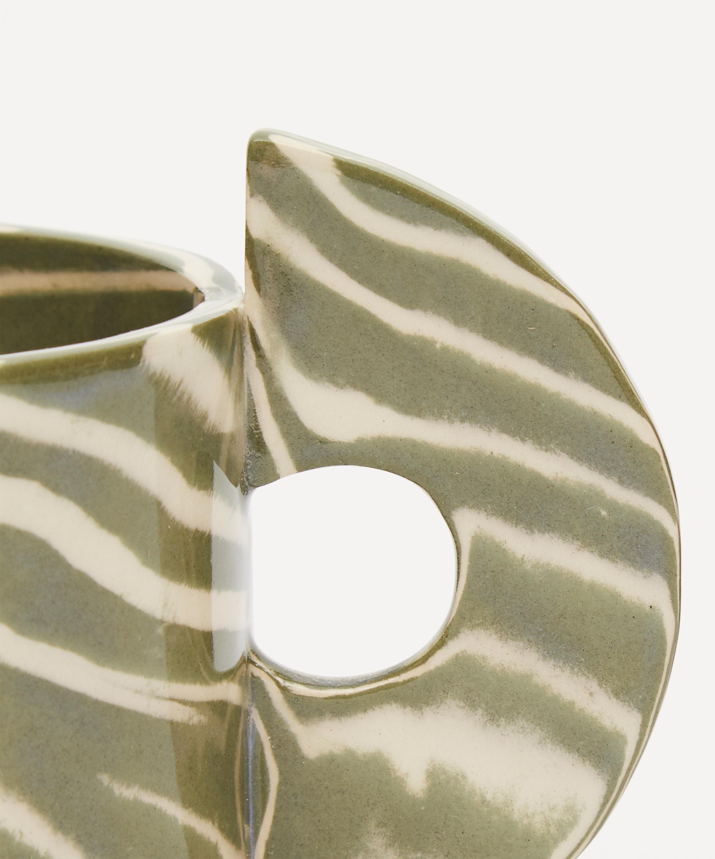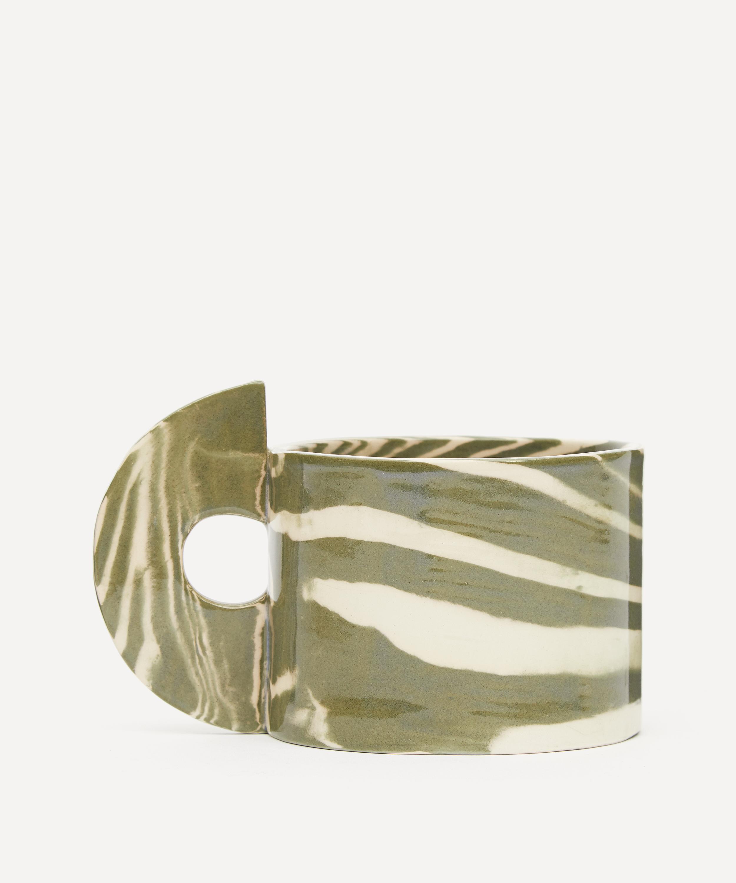 This signature Art Deco-inspired mug is made using a stylised version of the Japanese technique of Nerikomi, which involves hand-building with coloured earthenware clay. Finished with a transparent high-gloss glaze to reveal the unique pattern of green and white clay beneath, each mug is a statement piece in its own right. Sip your morning coffee from this striking vessel as you revel in its artistic beauty.