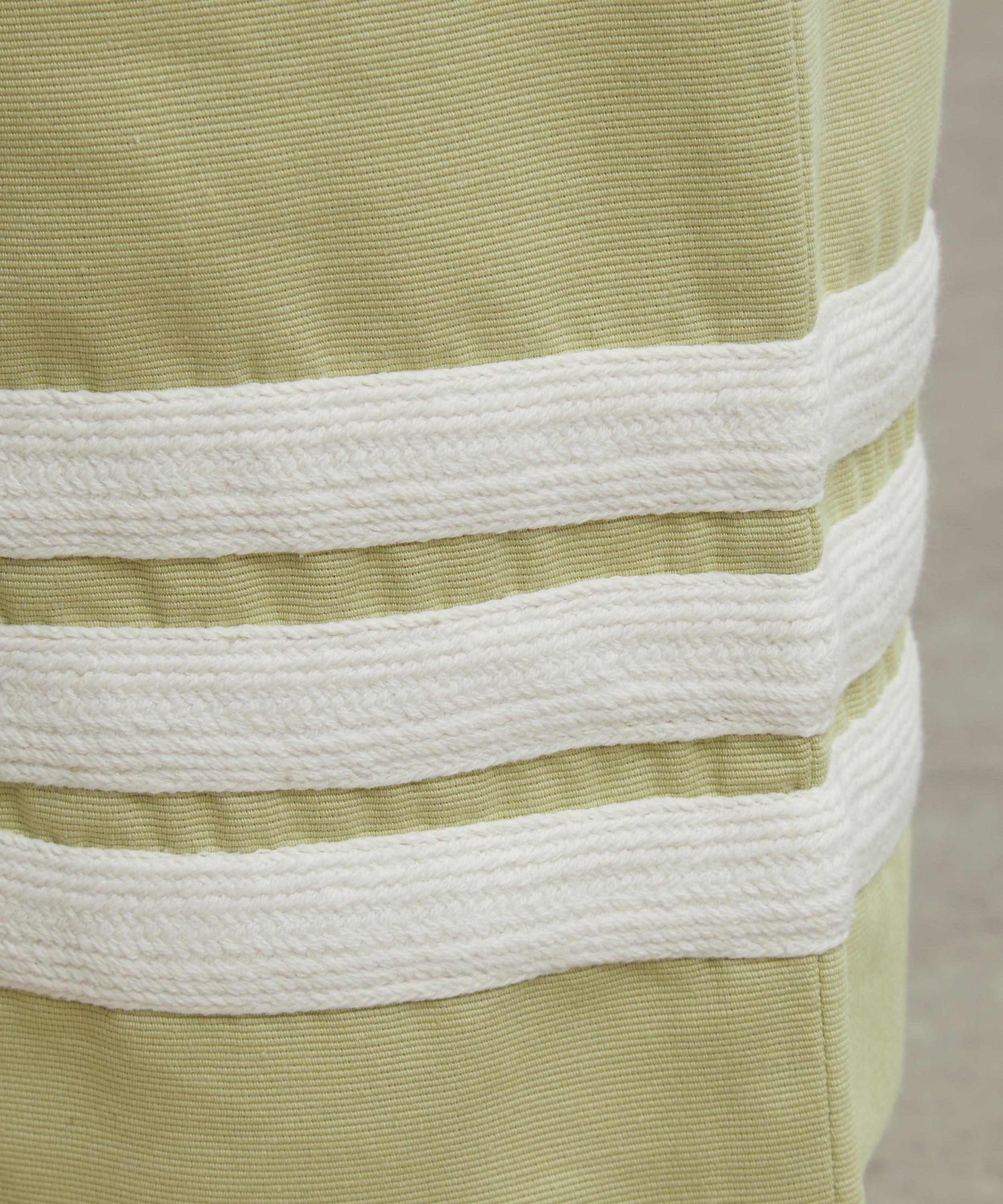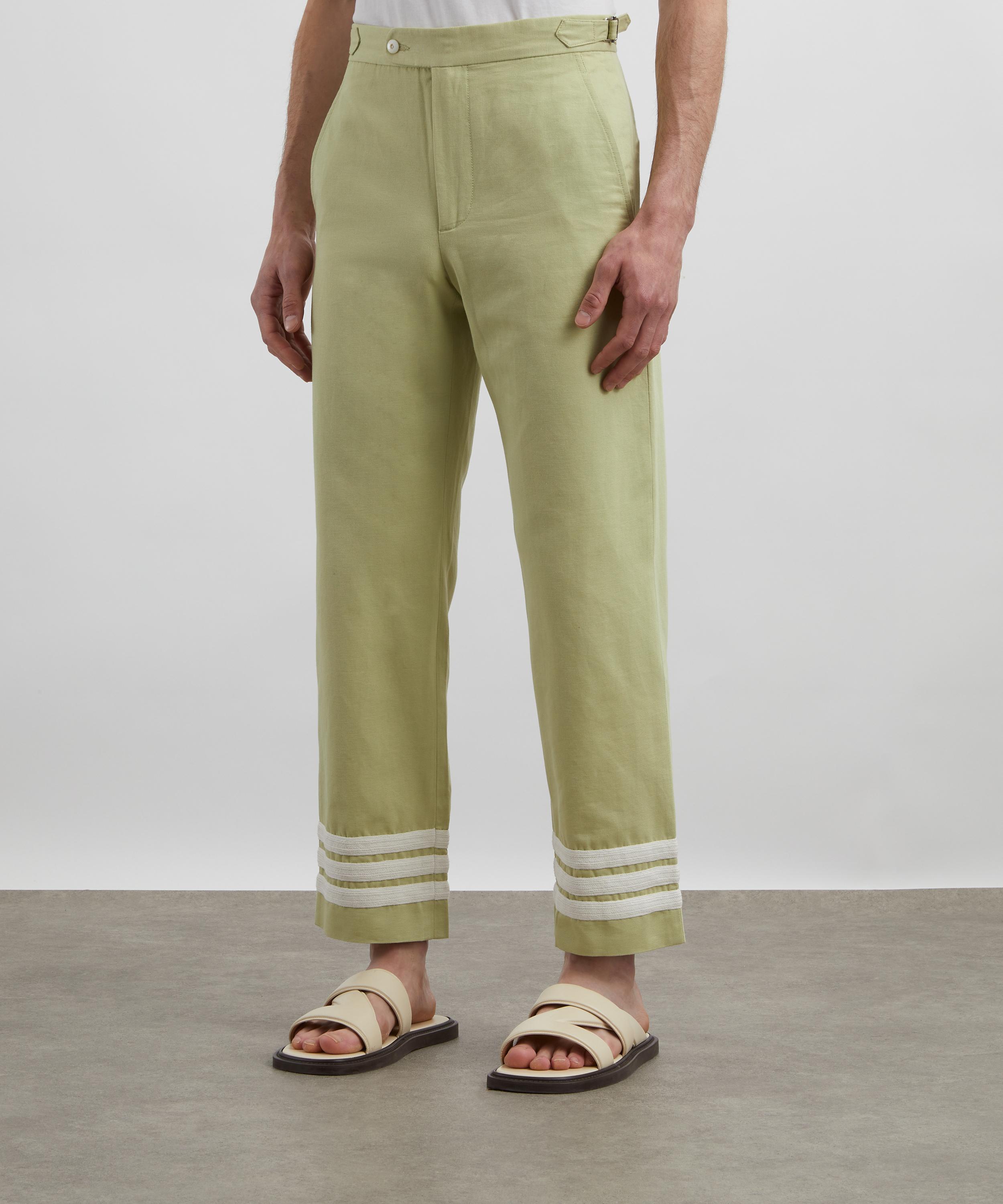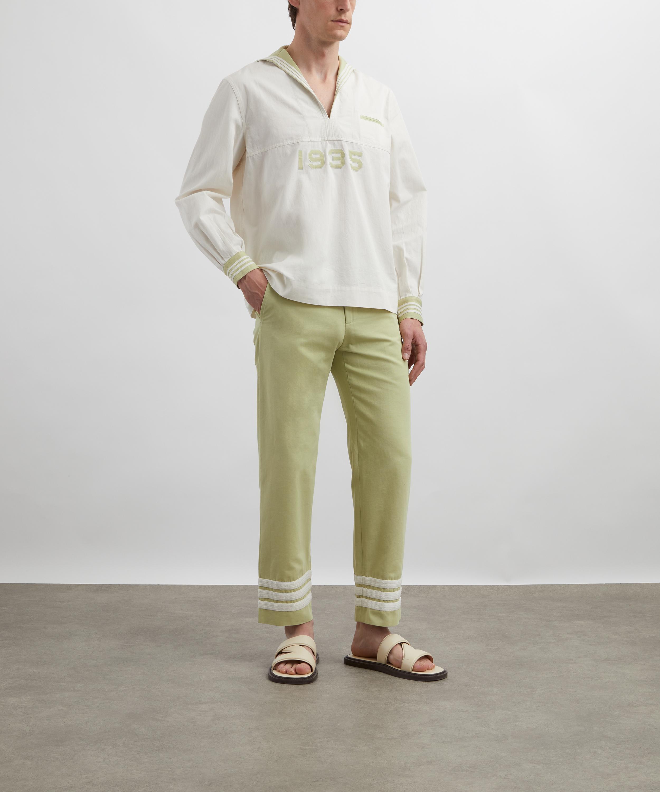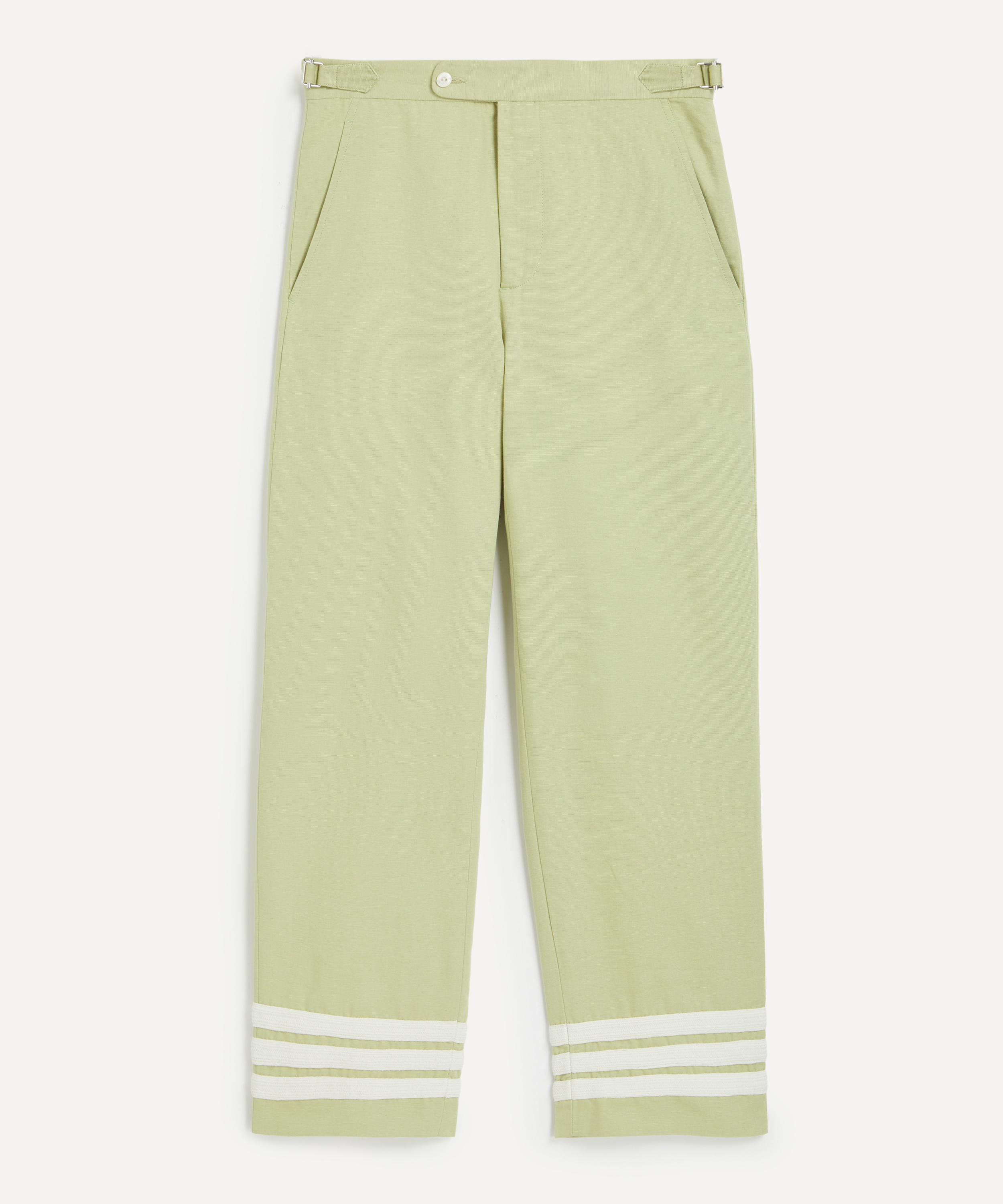 Inspired by a 1920s antique shirt, these straight-leg trousers are crafted from rich green twill and detailed with woven appliqué stripes, blending vintage character with modern craftsmanship.