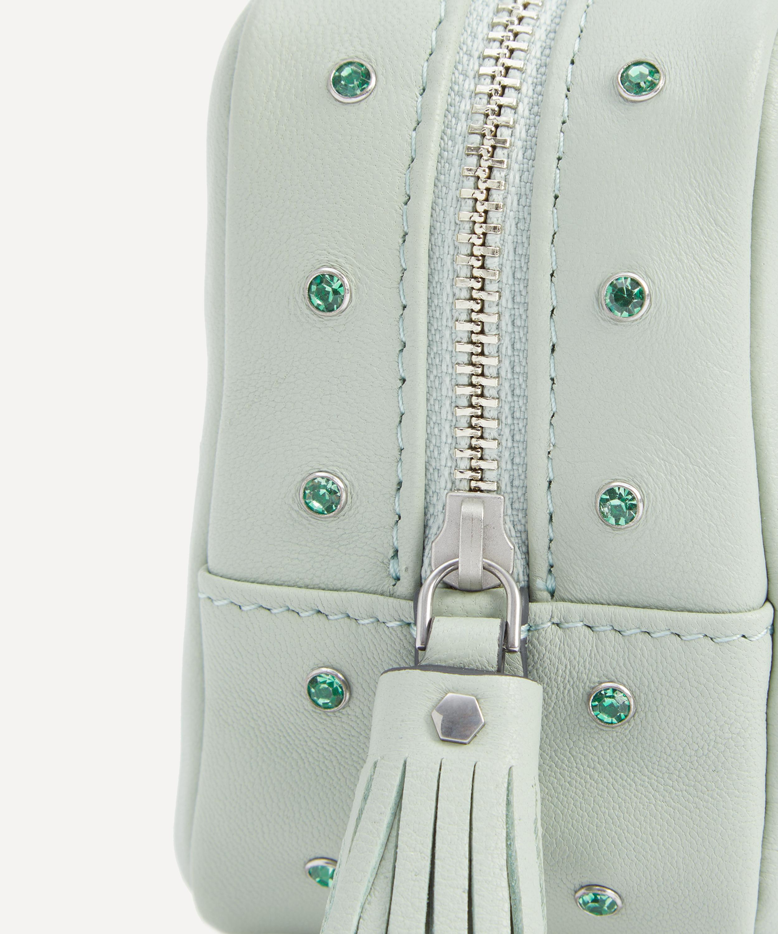 Made from soft nappa leather in a pale green hue, it’s adorned with spaced-out crystal embellishments, complementing the silver-tone hardware. The compact piece features an internal compartment, perfect for storing daily essentials, and is finished with a ‘AH’ logo fabric lining for an authentic touch.