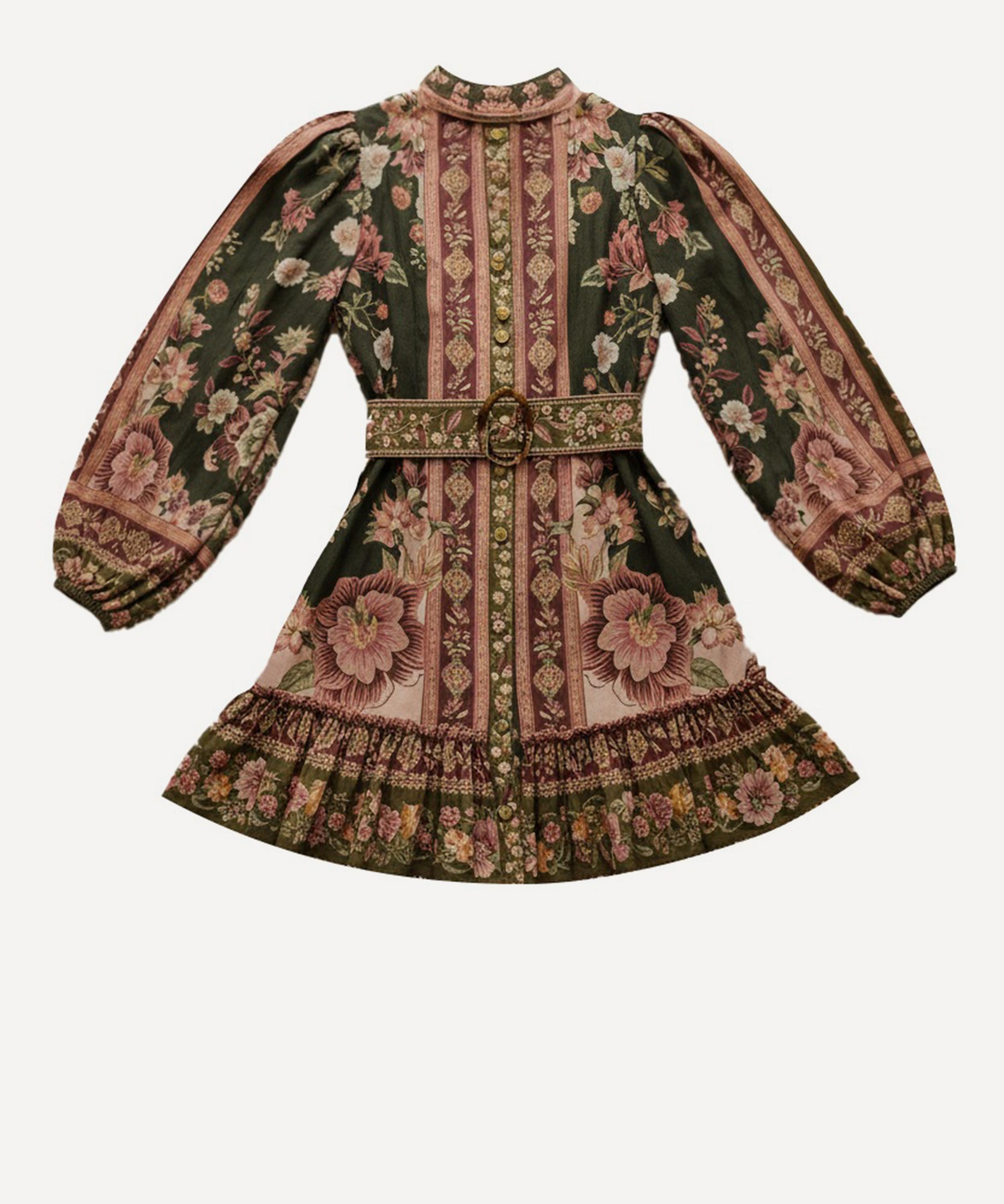 Step into a whimsical botanical world with this vibrant green mini dress, adorned with soft pink florals. A structured high neckline and voluminous puff sleeves bring elegance, while a cinched waist with a matching belt defines the playful silhouette. Finished with delicate ruffles at the hem for added charm and movement.