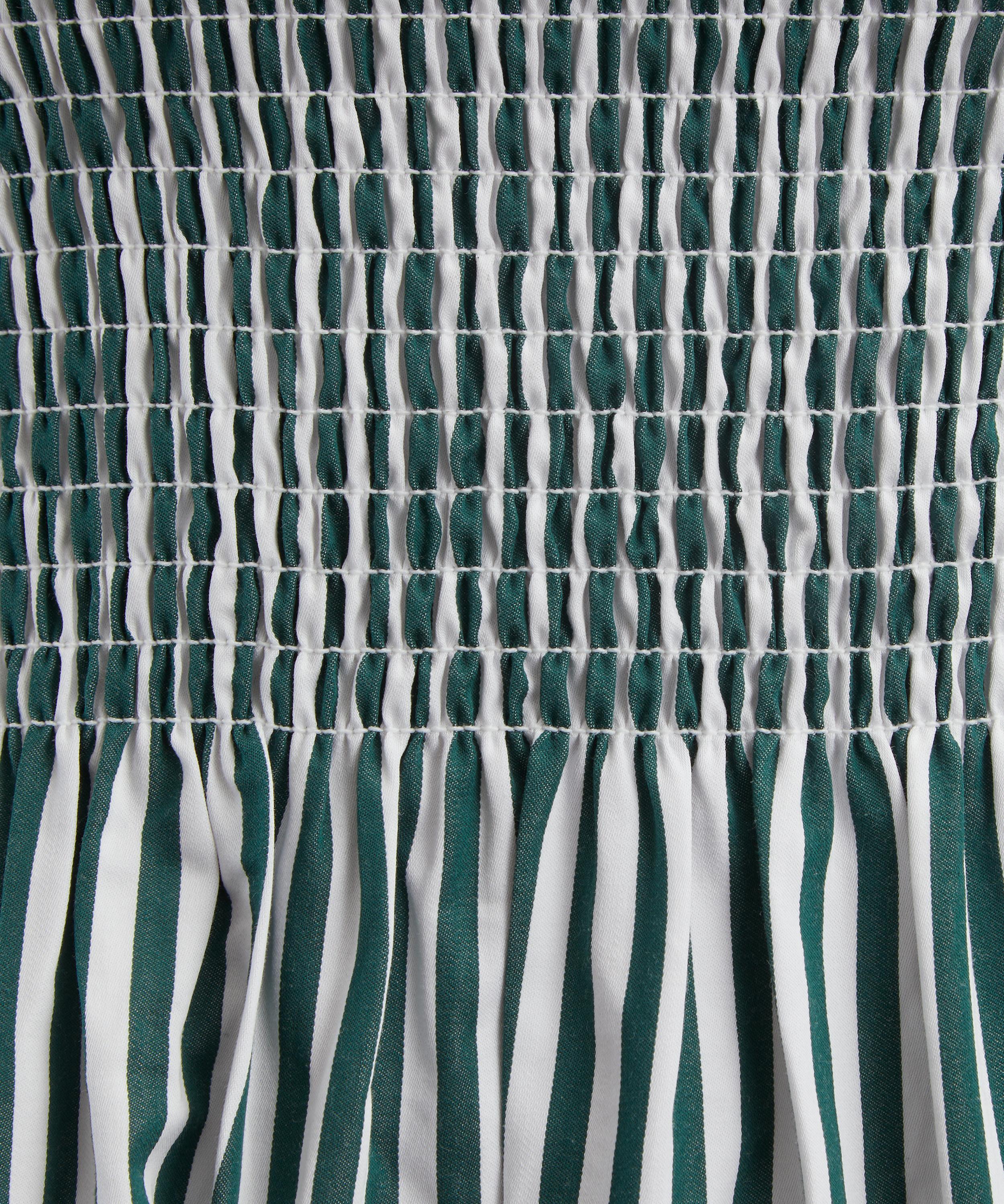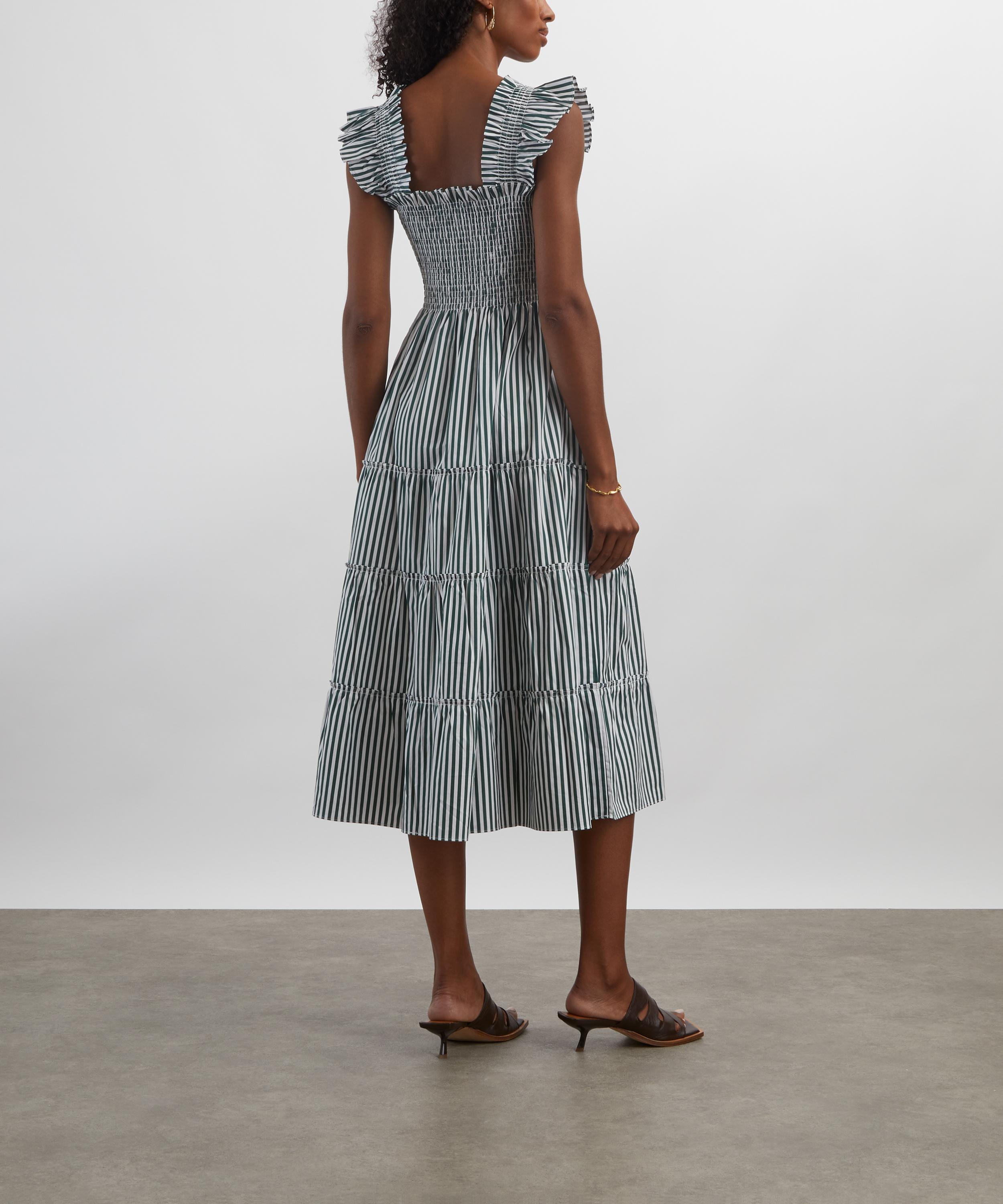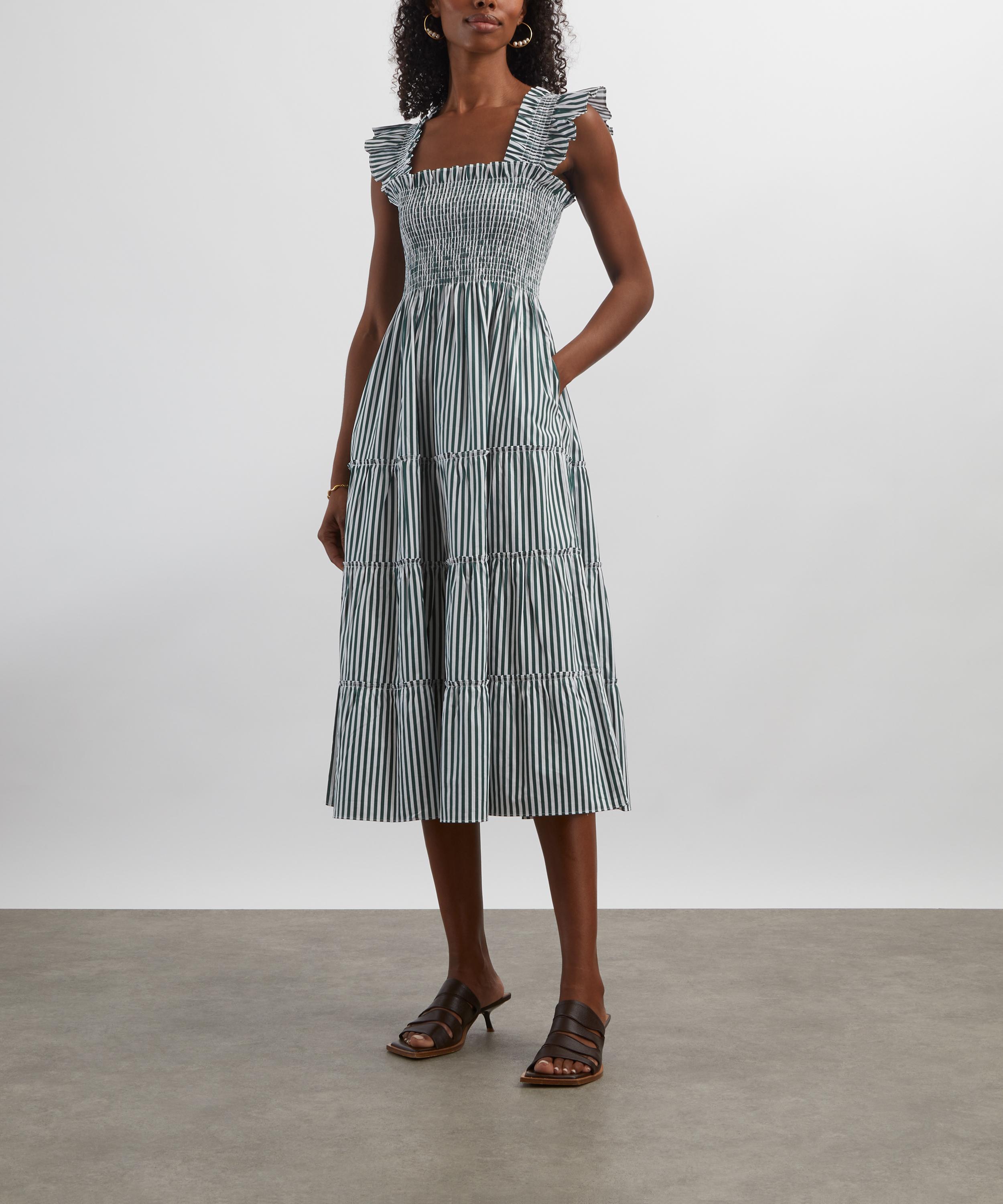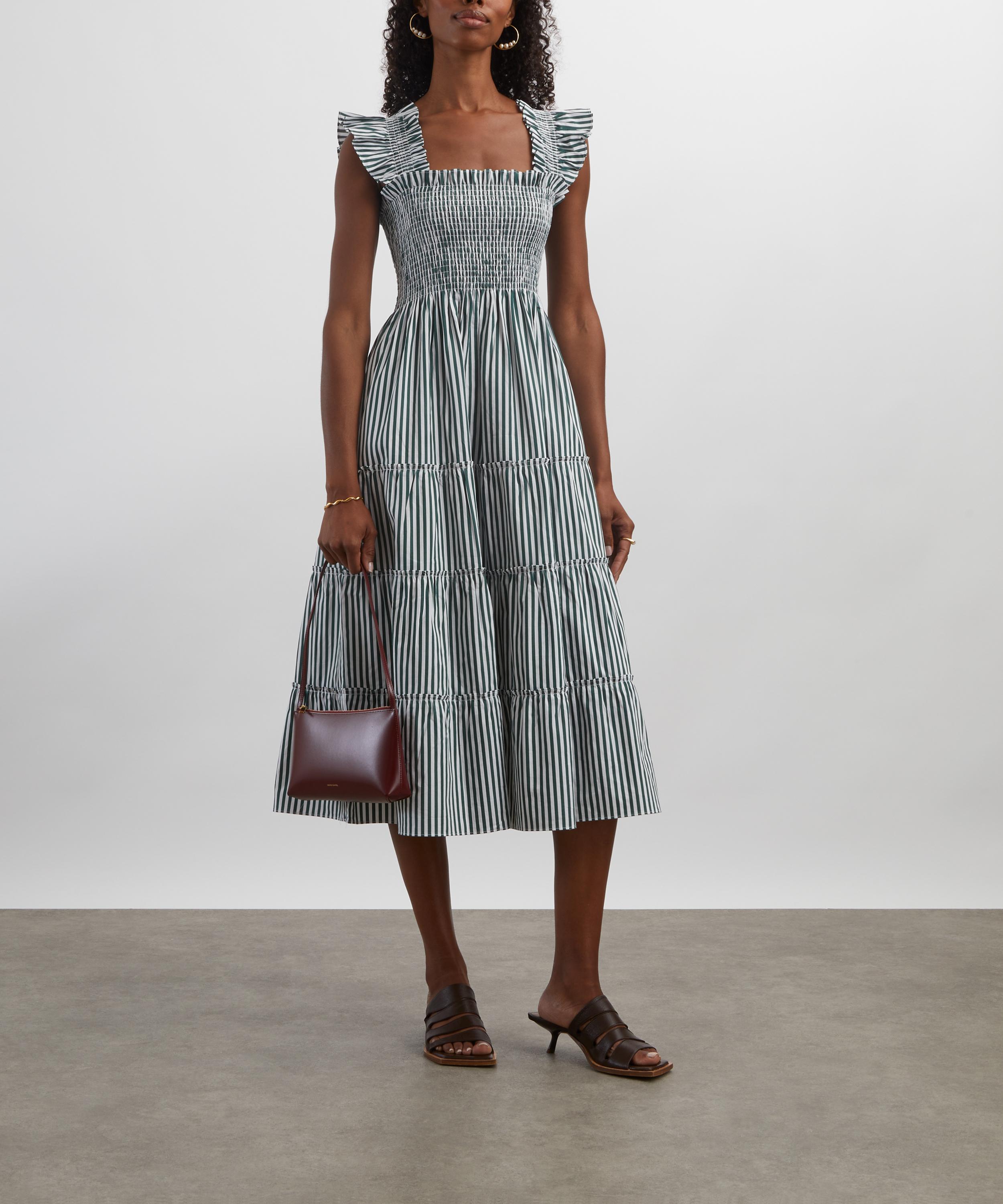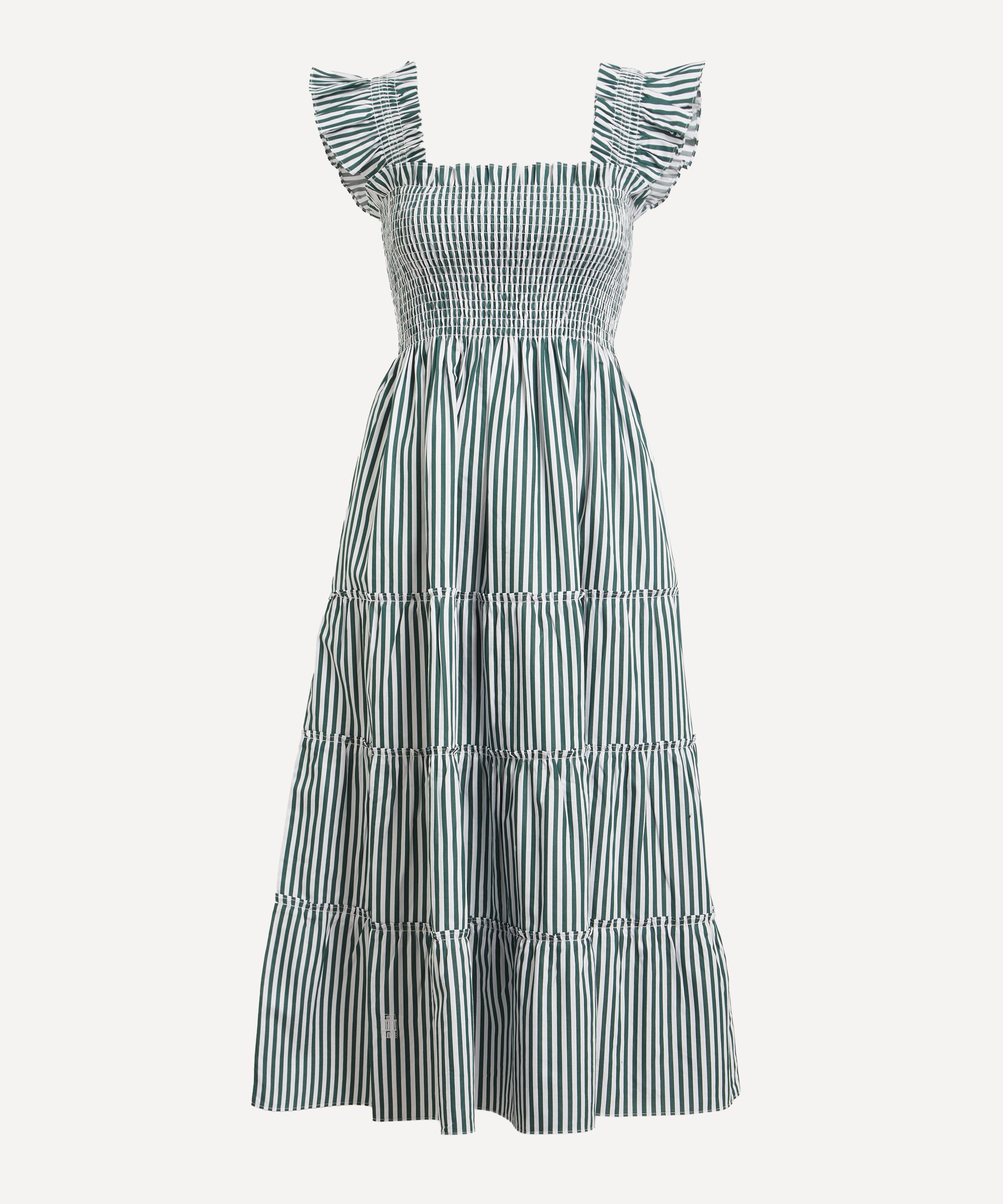Soft, comfortable and pretty enough to wear from day to night, this sundress is set to become a seasonal staple. Crafted from lightweight cotton adorned with green stripes, it features a fit-and-flare A-line silhouette consisting of a smocked bodice, ruffled shoulders and a tiered midi skirt. Elegant and easy to wear, it’s finished with a practical pair of pockets.
