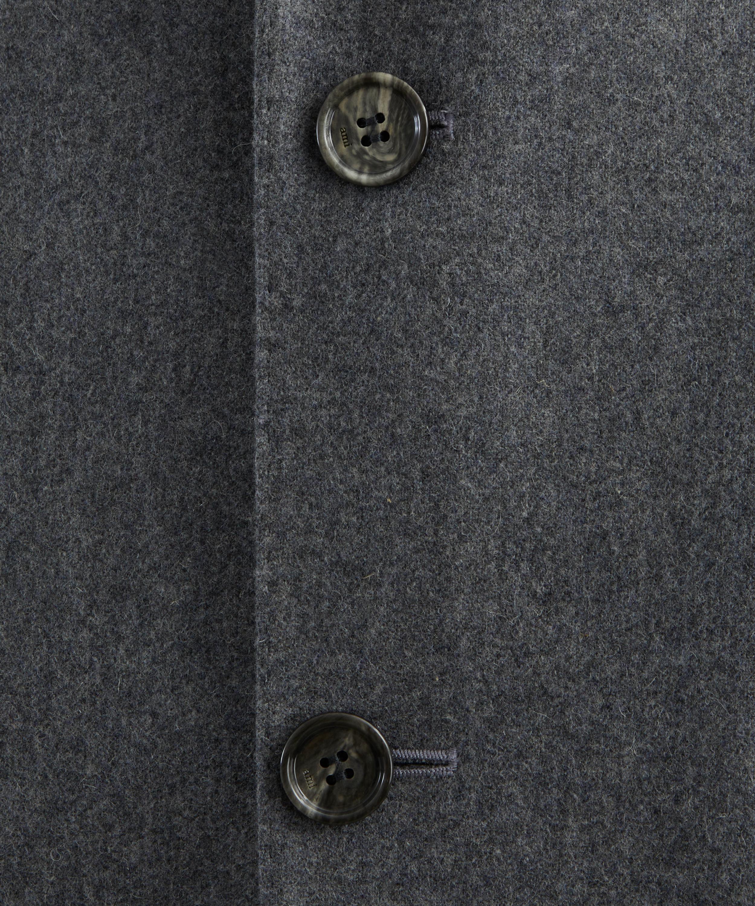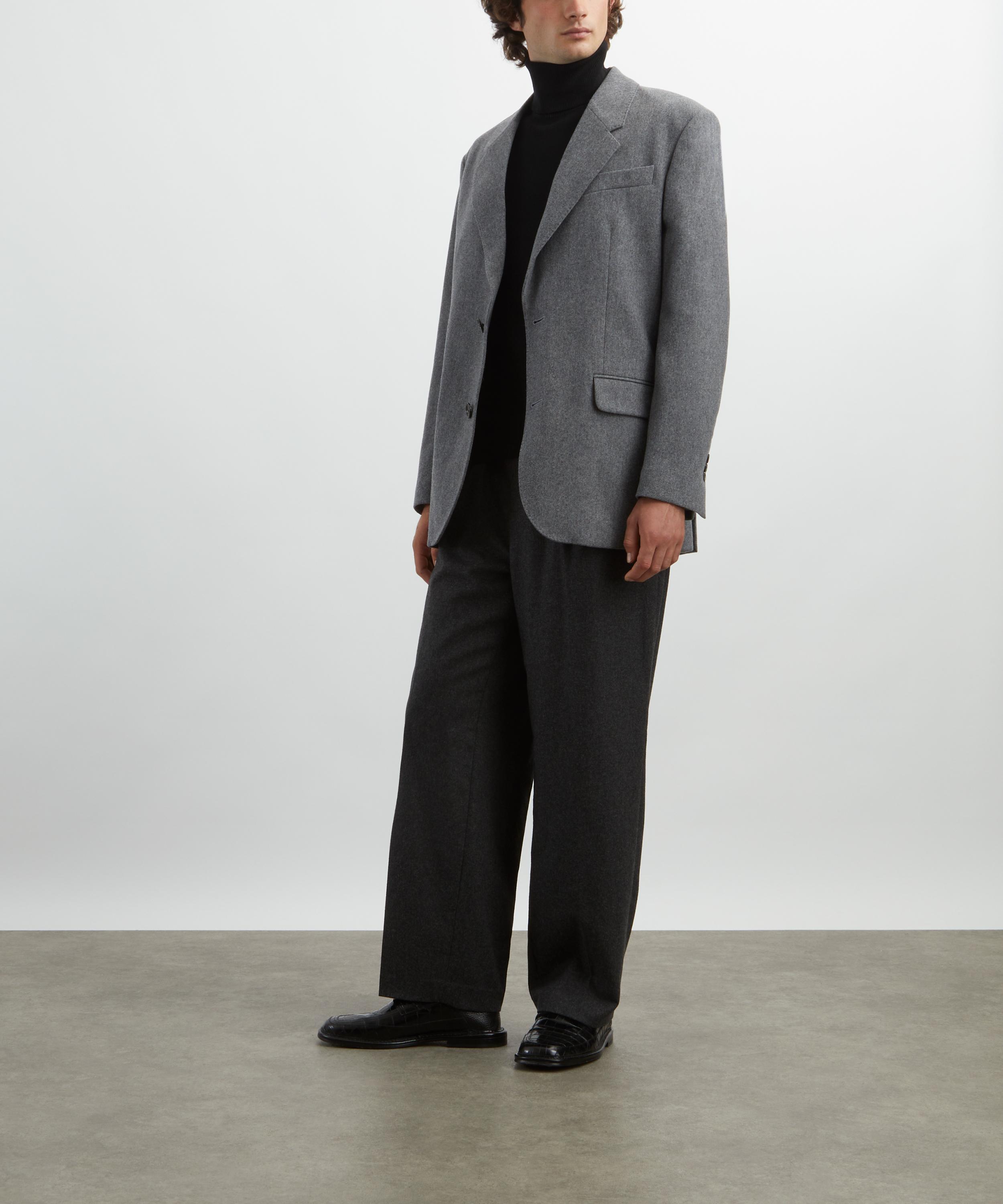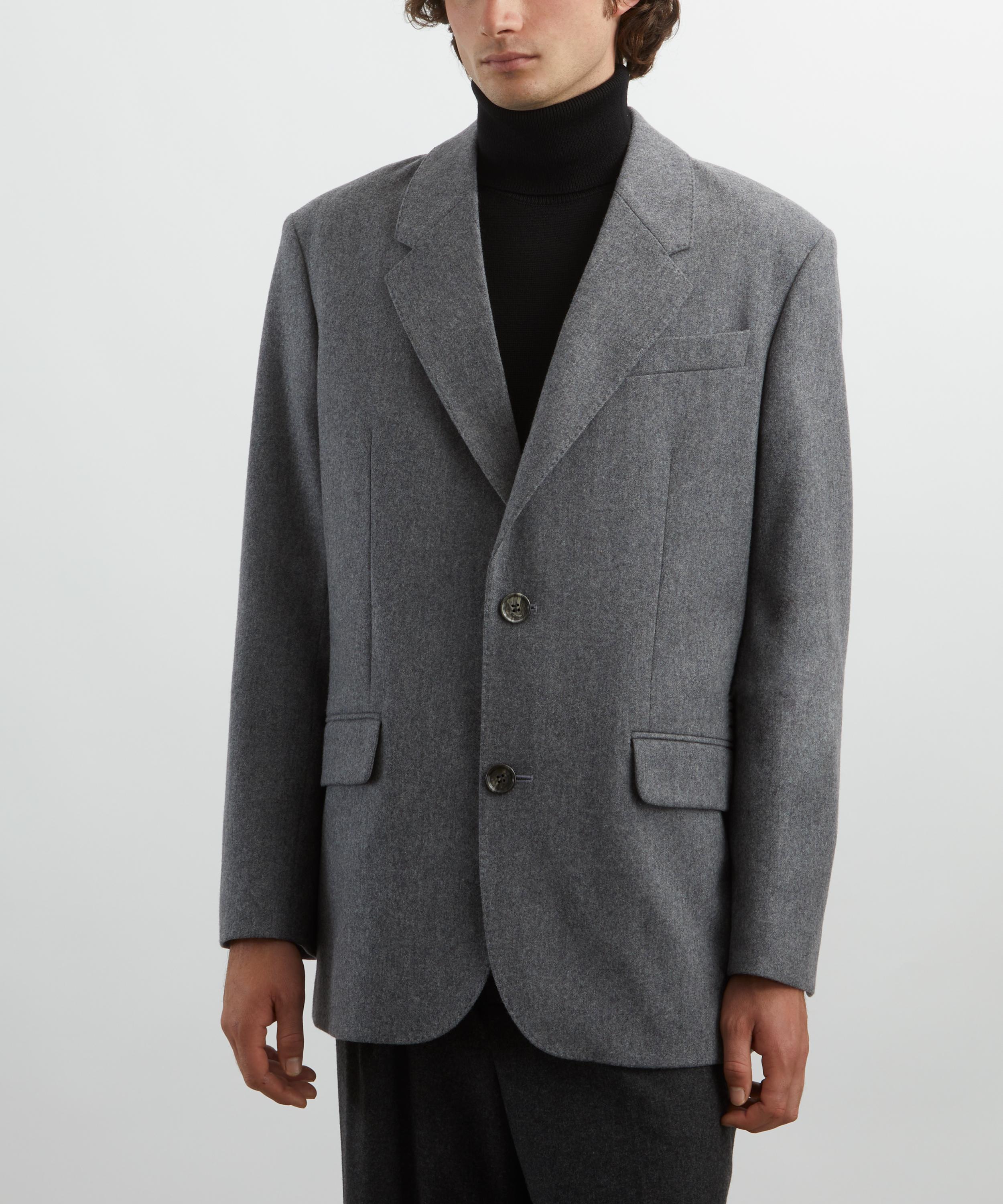 Crafted from wool flannel, this grey tailored blazer features a boxy, single-breasted silhouette with a notch collar, two-button front closure, and multiple interior and exterior pockets for a sharp yet practical finish.