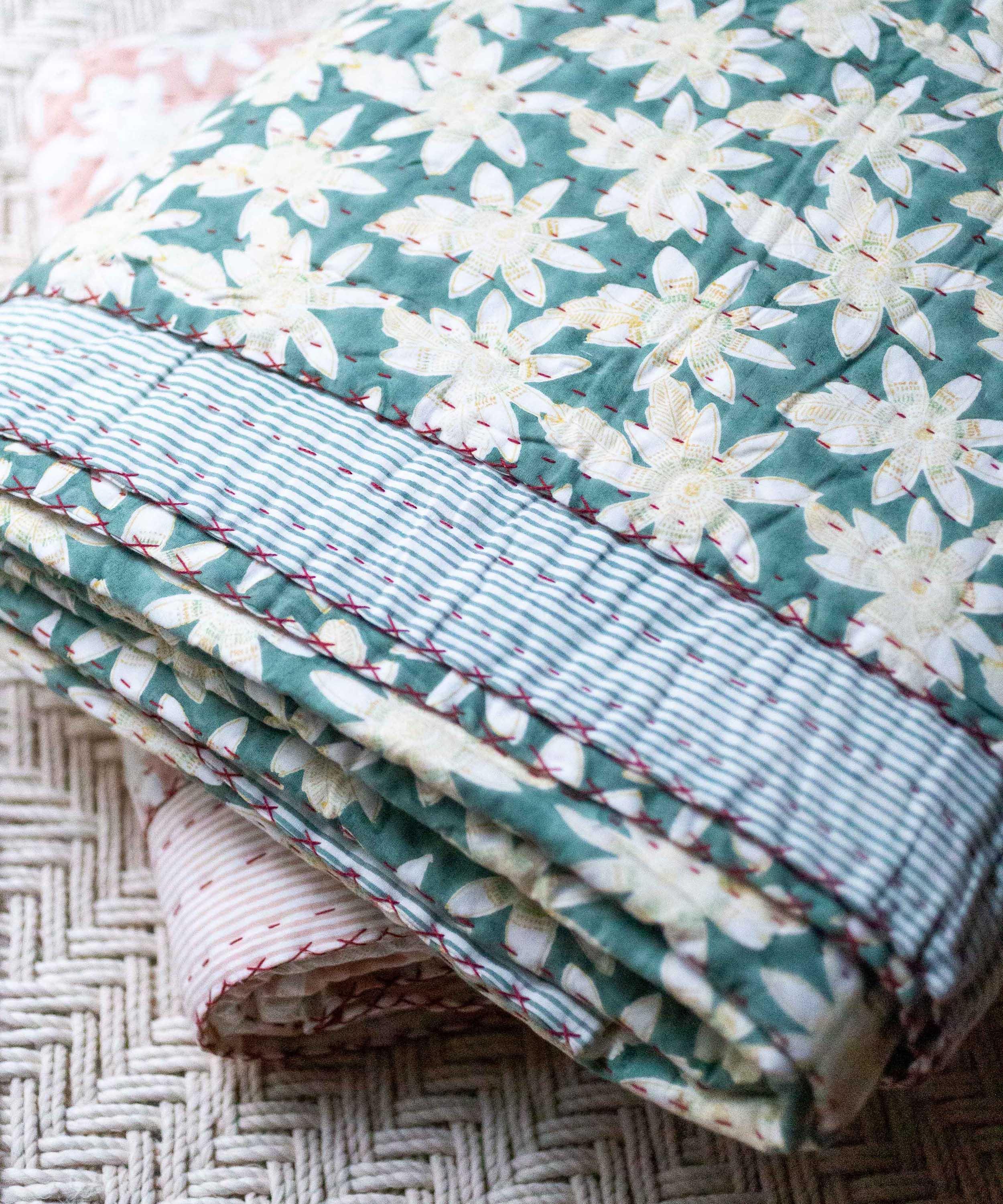 The Gujarat bedspread from Caravane is meticulously crafted – radiating thoughtful charm.