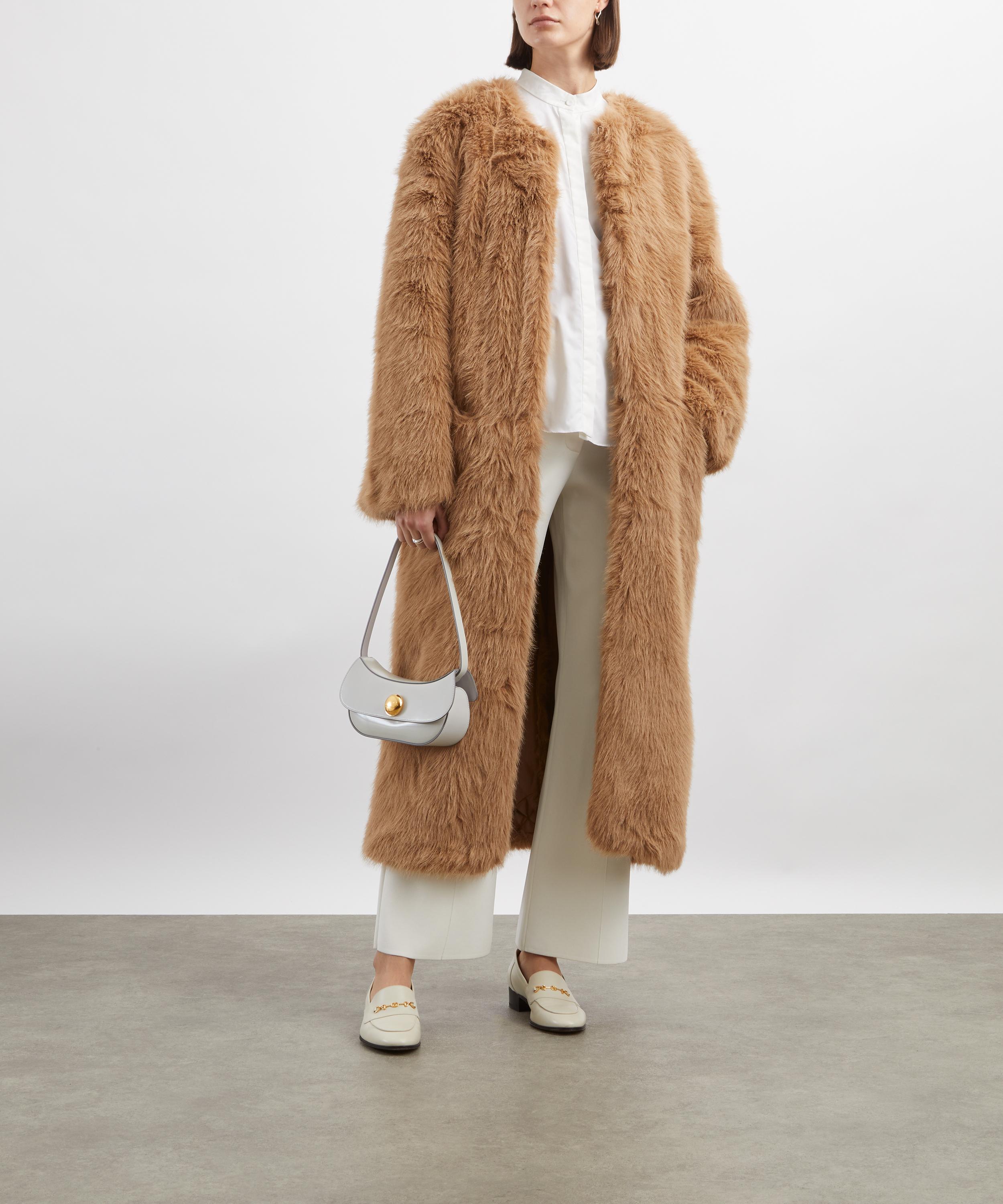 Crafted from a soft faux-fur, this longline coat features a clean, round neckline, full-length sleeves, and an elegant concealed closure that enhances its minimalist silhouette.