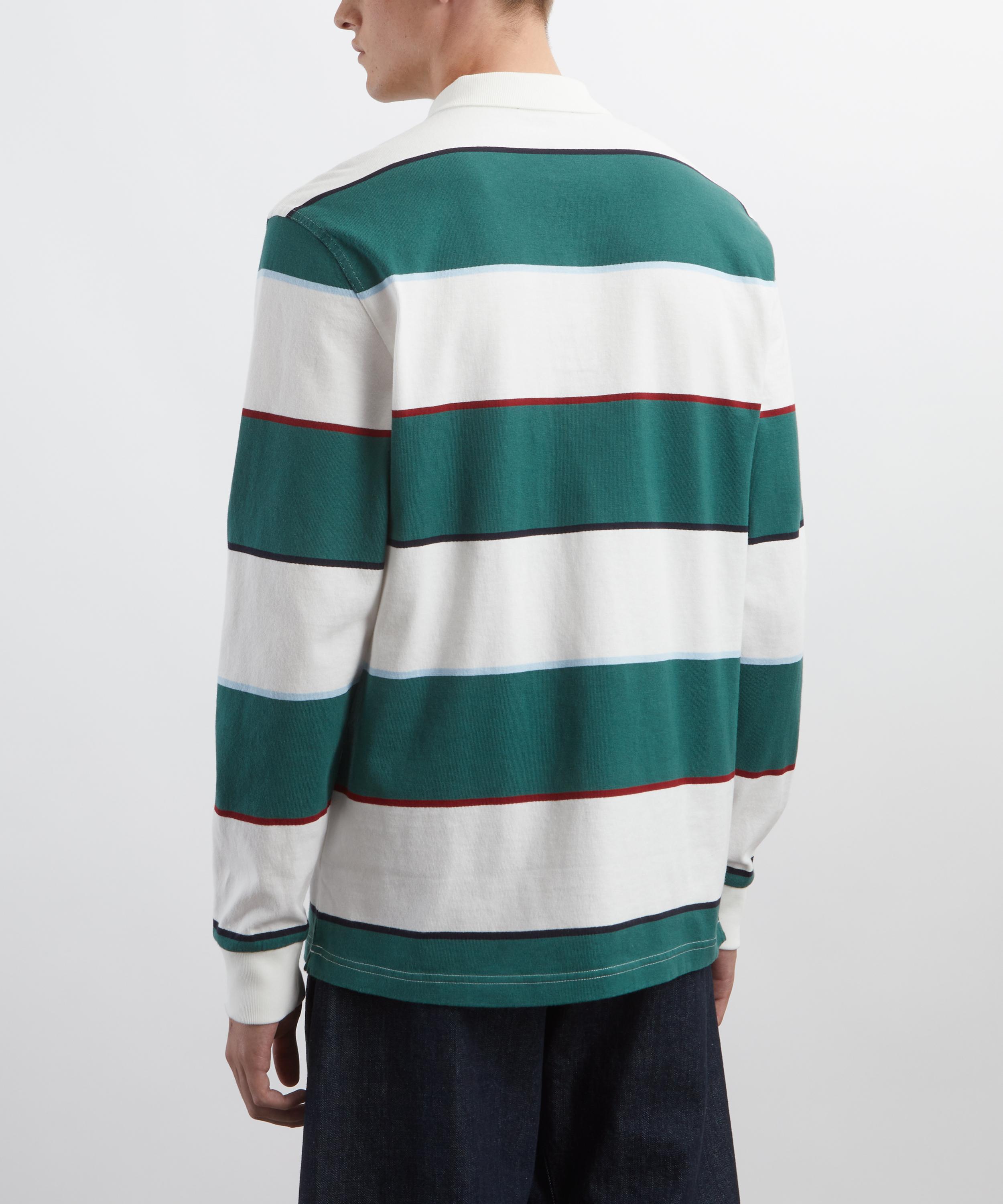 A contemporary, laid-back take on classic sporting styles, this striped cotton jersey polo features a relaxed fit, flat-knit collar, partial placket, and signature Laurel Wreath embroidery for a distinctive finish.