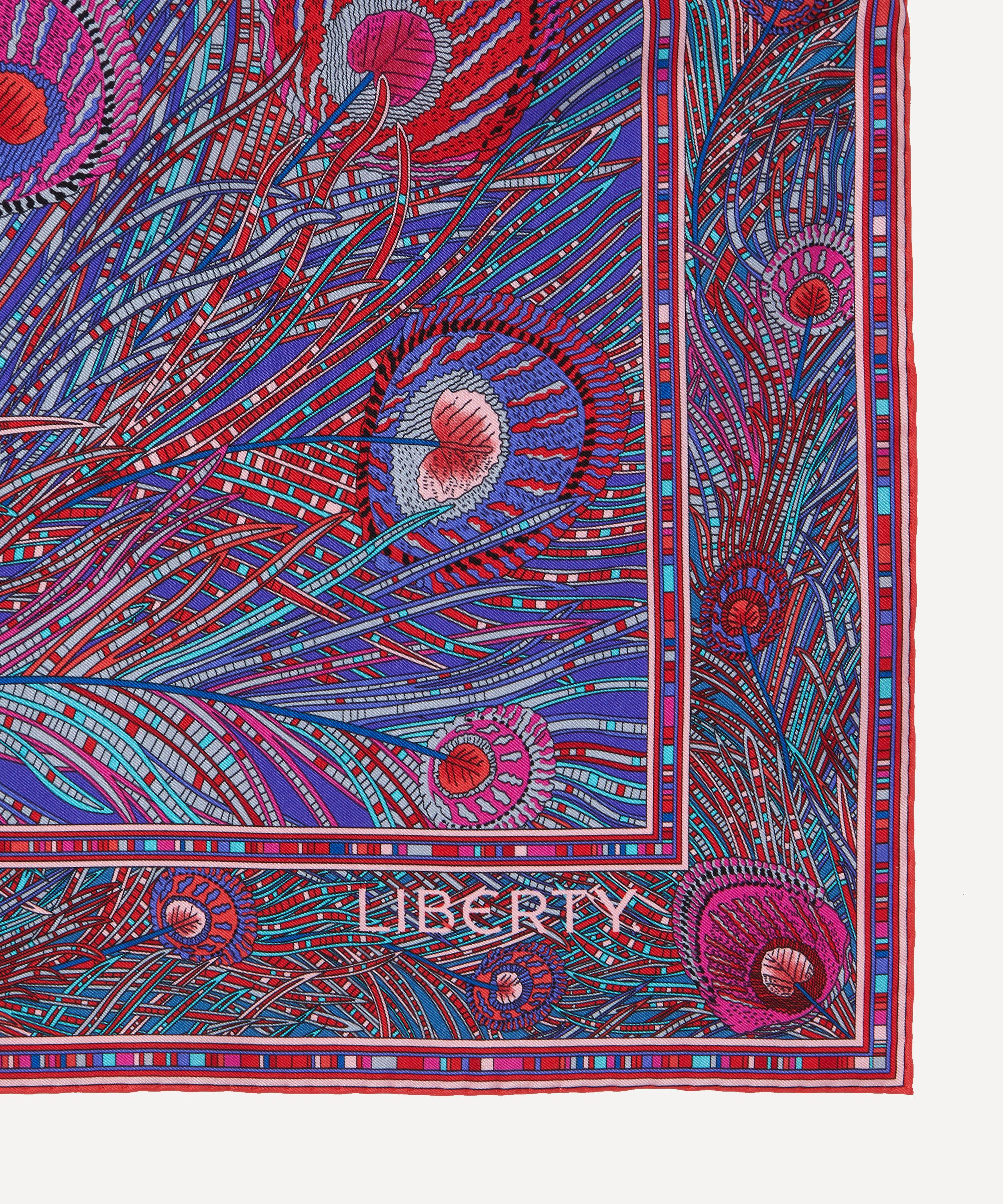 Give your ensemble a finishing flourish with this striking Liberty silk scarf. Credited to an 1887 design by Arthur Silver, founder of the Silver Studio, Hera has been a Liberty favourite since the mid 1890s when it was first printed onto Liberty furnishing fabrics. The peacock feather was a frequently used symbol during the Aesthetic Movement of the 1880s. Pair it with statement earrings and voluminous tailoring for maximalist daytime glamour.