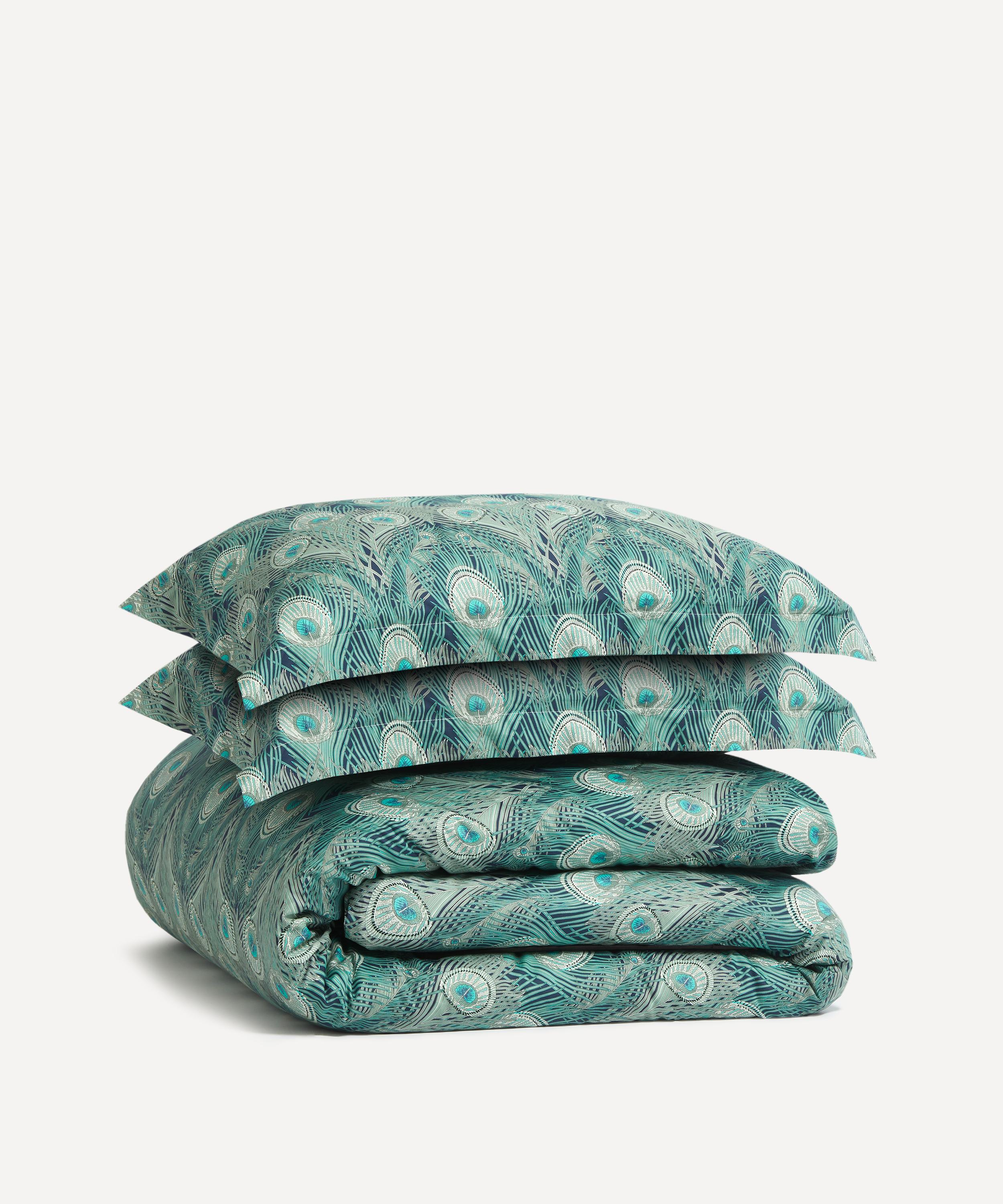 Liberty’s Hera duvet set features two standard pillowcases and a double duvet cover, all crafted from luxurious 300-thread-count cotton sateen – a silky-smooth and soft material with a sheeny mercerised finish. Part of the Arts Club collection which pays homage to Liberty’s iconic eccentricity, this duvet set is expertly printed at our very own Italian fabric mill with Hera – an icon of Liberty print heritage, it features a sinuously intertwined arrangement of peacock feathers, a popular symbol during the Aesthetic Movement of the 1880s. Use the set as a pop of vibrancy within a pared-down bedroom set-up, or go all out with jewel-toned velvet lampshades and clashing curtains to embrace the trend for full-blown maximalism.