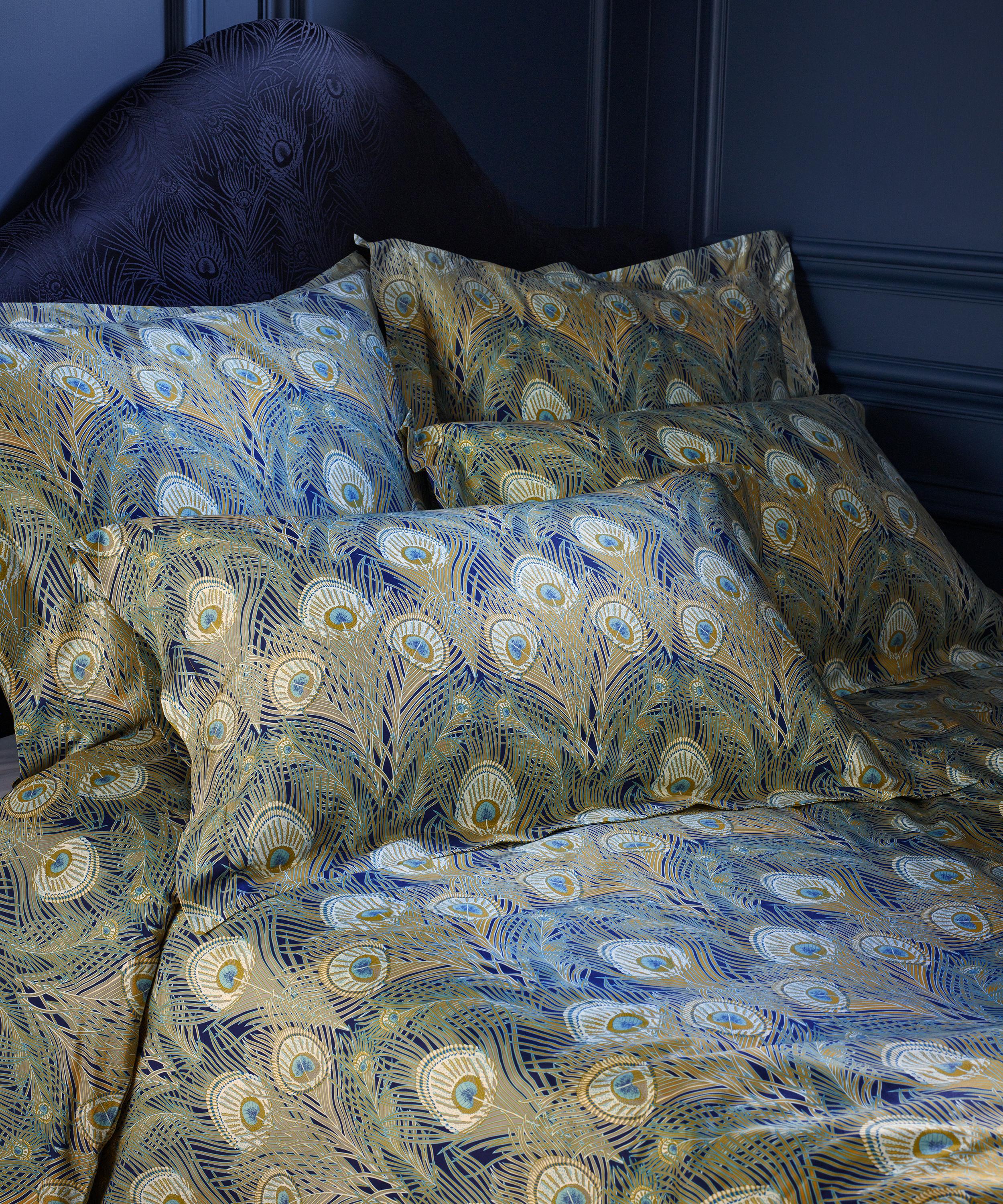 Liberty’s Hera duvet set features two standard pillowcases and a super king duvet cover, all crafted from luxurious 300-thread-count cotton sateen – a silky-smooth and soft material with a sheeny mercerised finish. Part of the Arts Club collection which pays homage to Liberty’s iconic eccentricity, this duvet set is expertly printed at our very own Italian fabric mill with Hera – an icon of Liberty print heritage, it features a sinuously intertwined arrangement of peacock feathers, a popular symbol during the Aesthetic Movement of the 1880s. Use the set as a pop of vibrancy within a pared-down bedroom set-up, or go all out with jewel-toned velvet lampshades and clashing curtains to embrace the trend for full-blown maximalism.