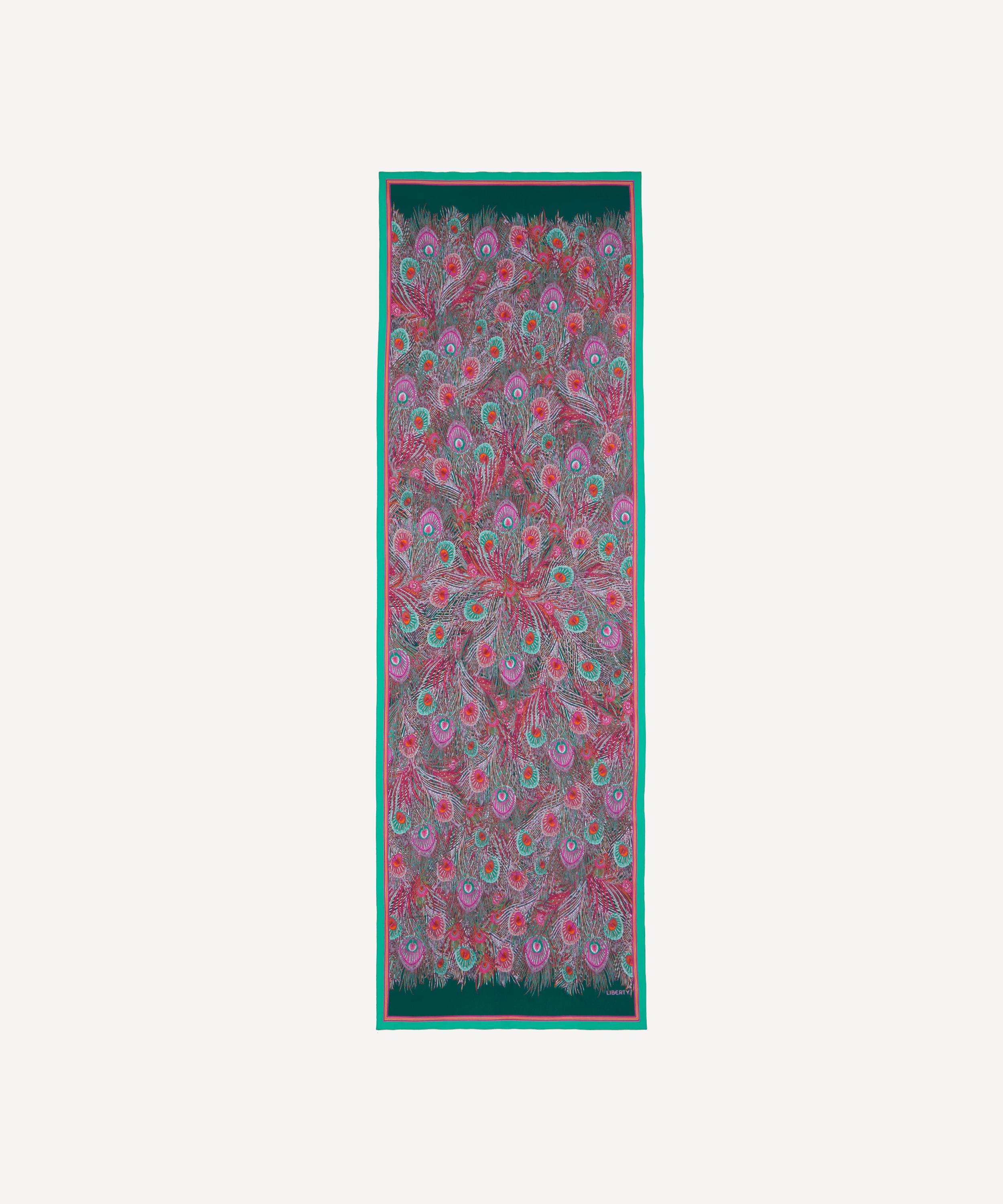 Embody classic elegance in this exquisite Liberty silk crepe de chine scarf. Credited to an 1887 design by Arthur Silver, founder of the Silver Studio, Hera has been a Liberty favourite since the mid 1890s when it was first printed onto Liberty furnishing fabrics. The peacock feather was a frequently used symbol during the Aesthetic Movement of the 1880s.