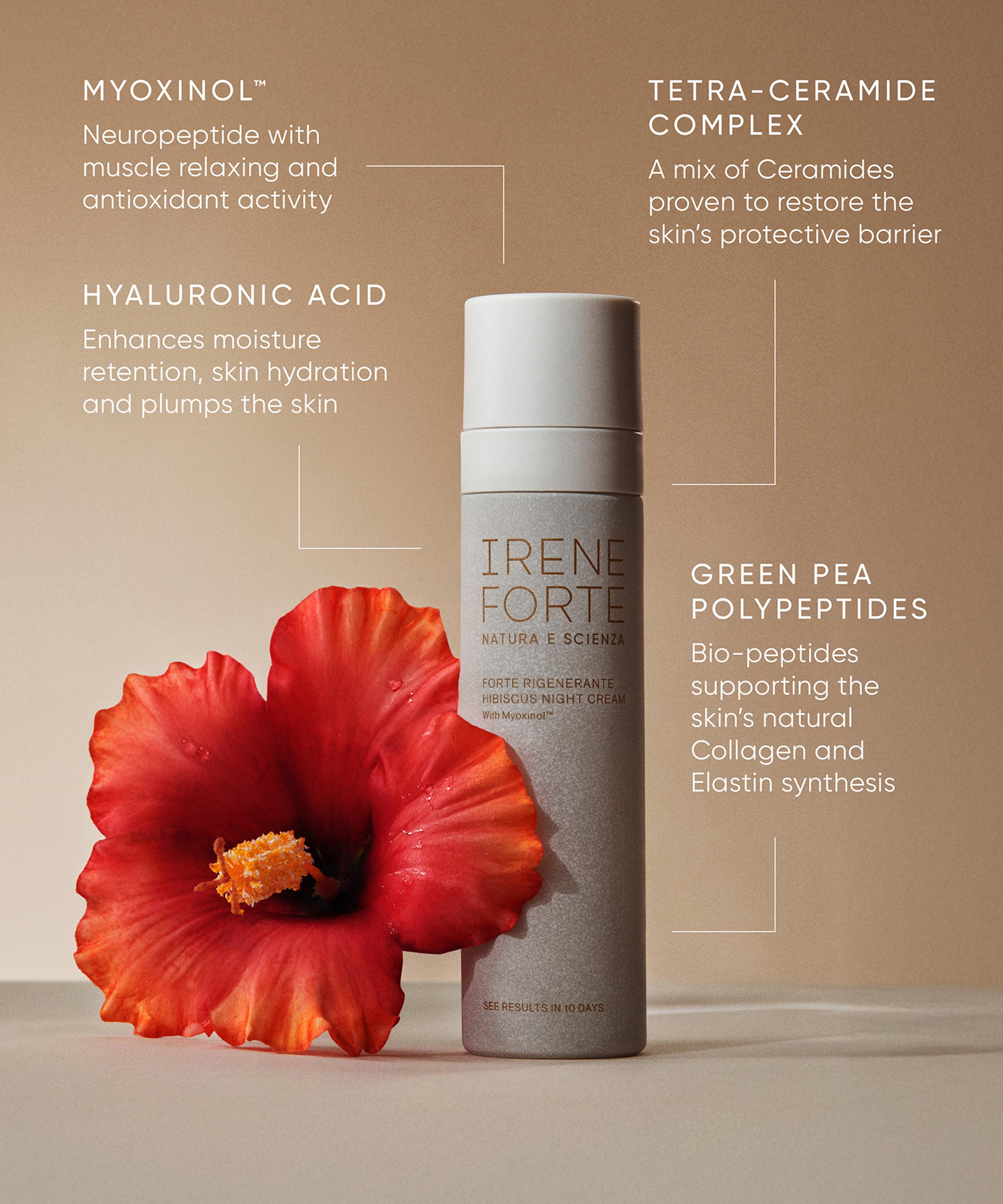 Hibiscus Night Cream with Myoxinol™ is Irene Forte's answer to overnight anti-ageing, formulated to help smooth, firm and replenish skin while you sleep.