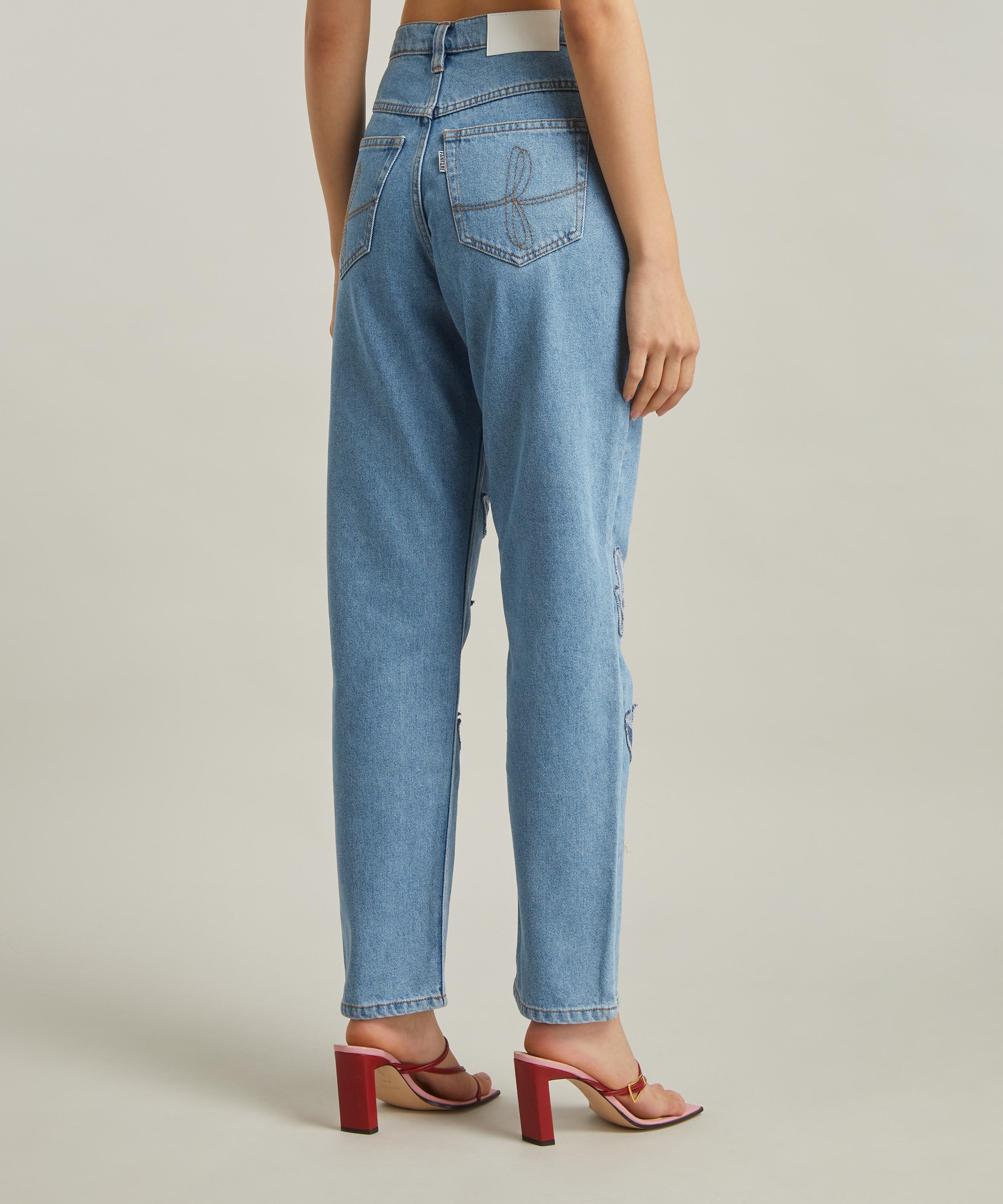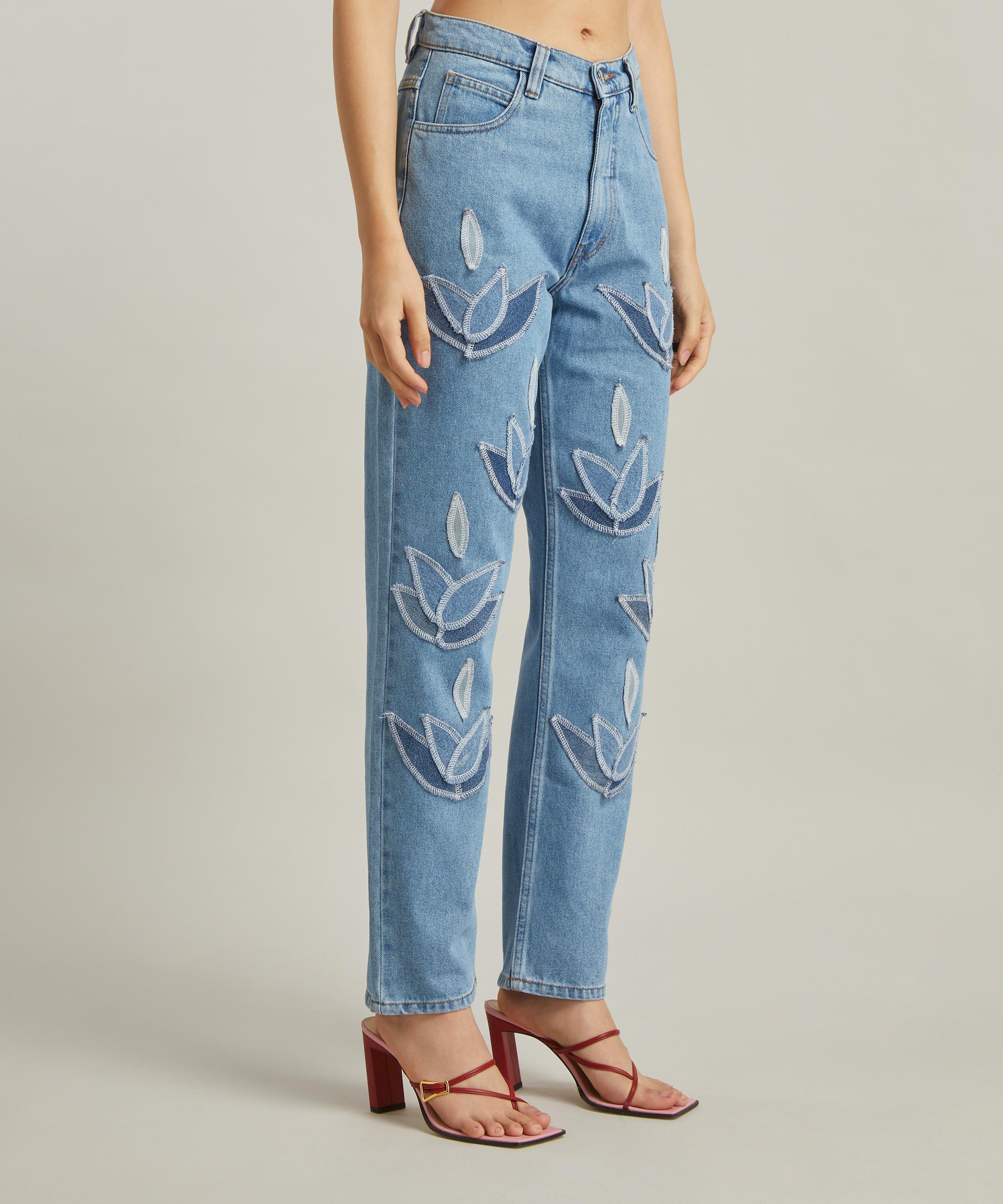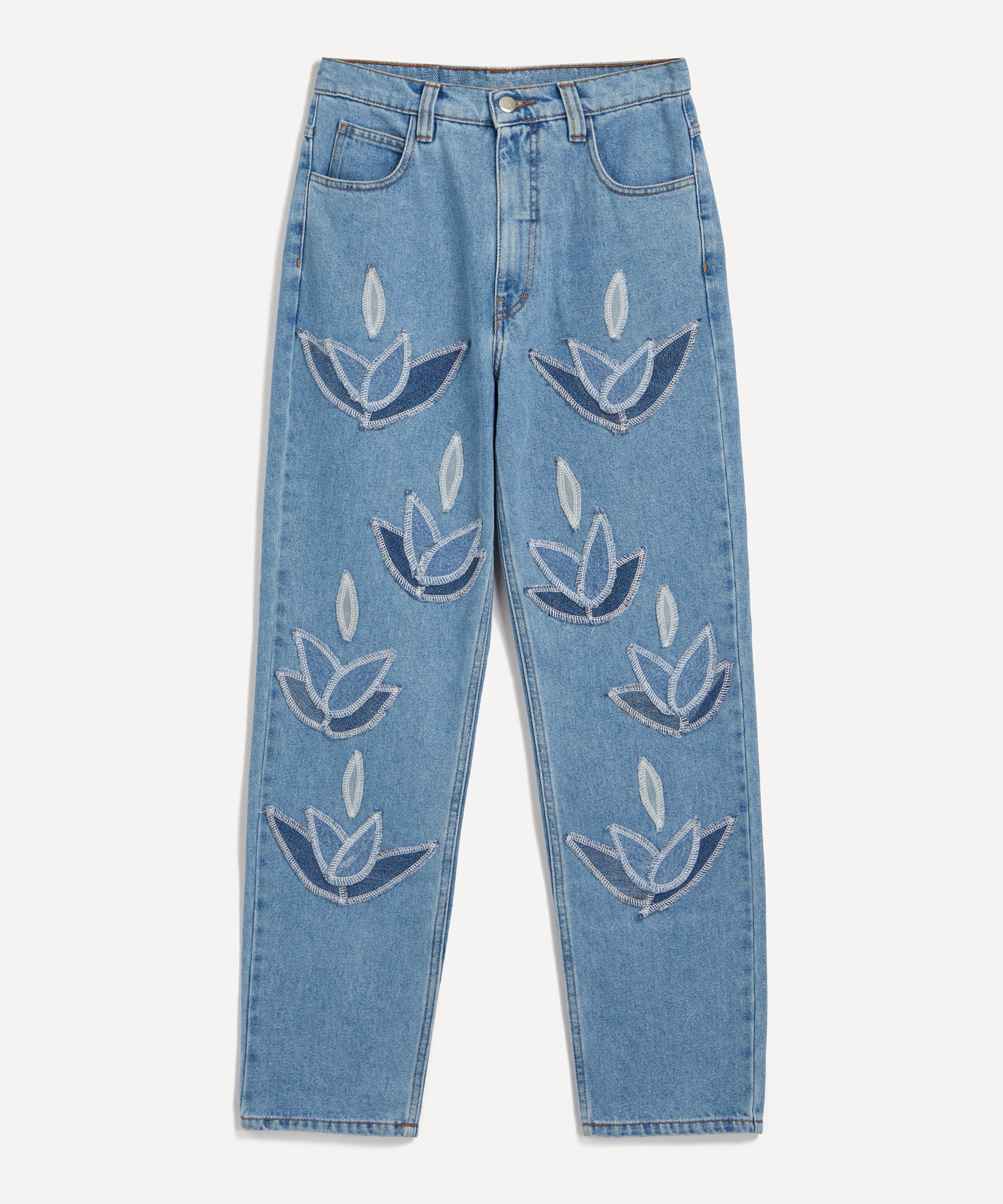 Cut from mid-wash blue denim, these high waisted ‘mom’ style jeans boast a relaxed fit with rolled hems and leaf decoration made from deadstock denim.