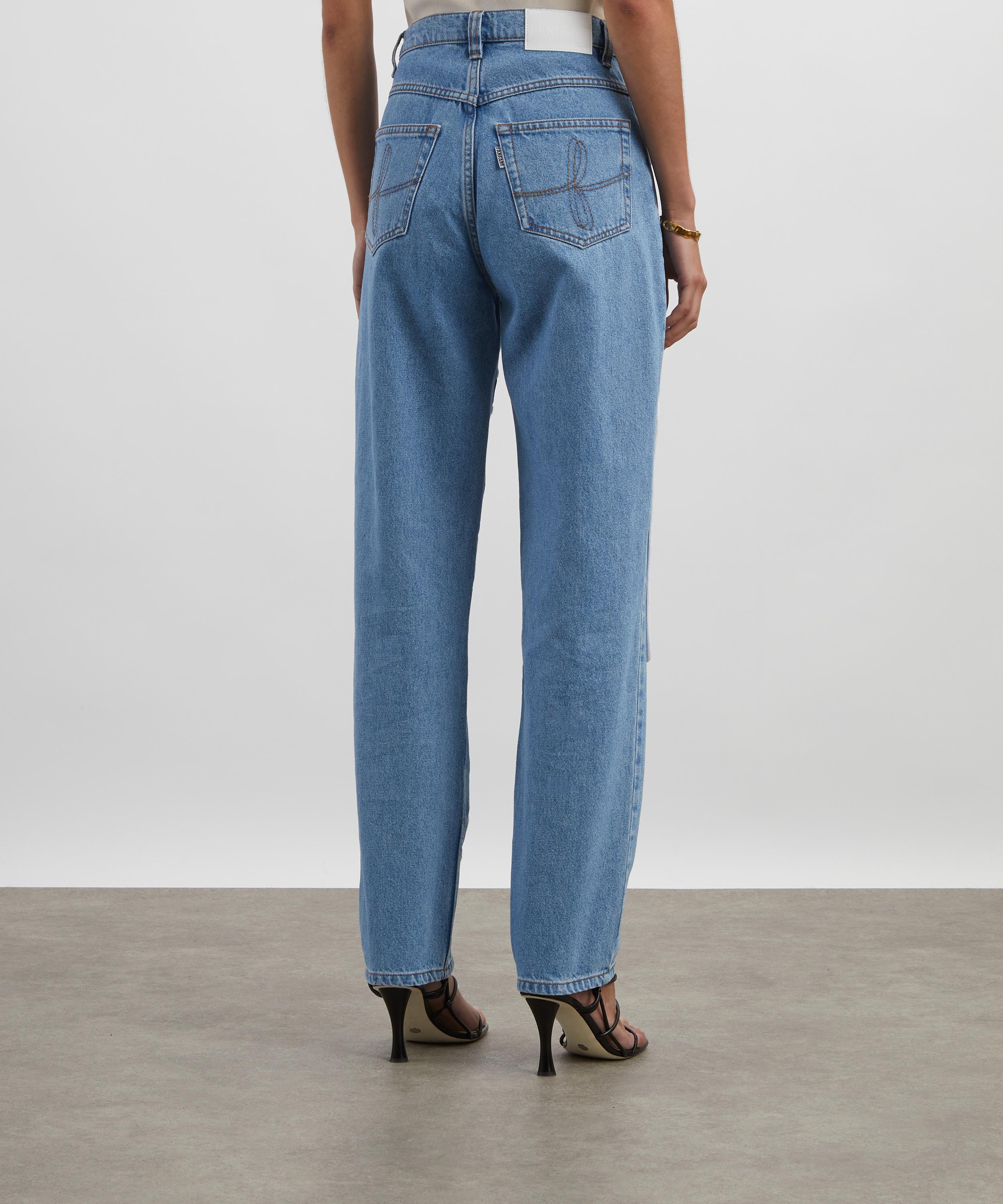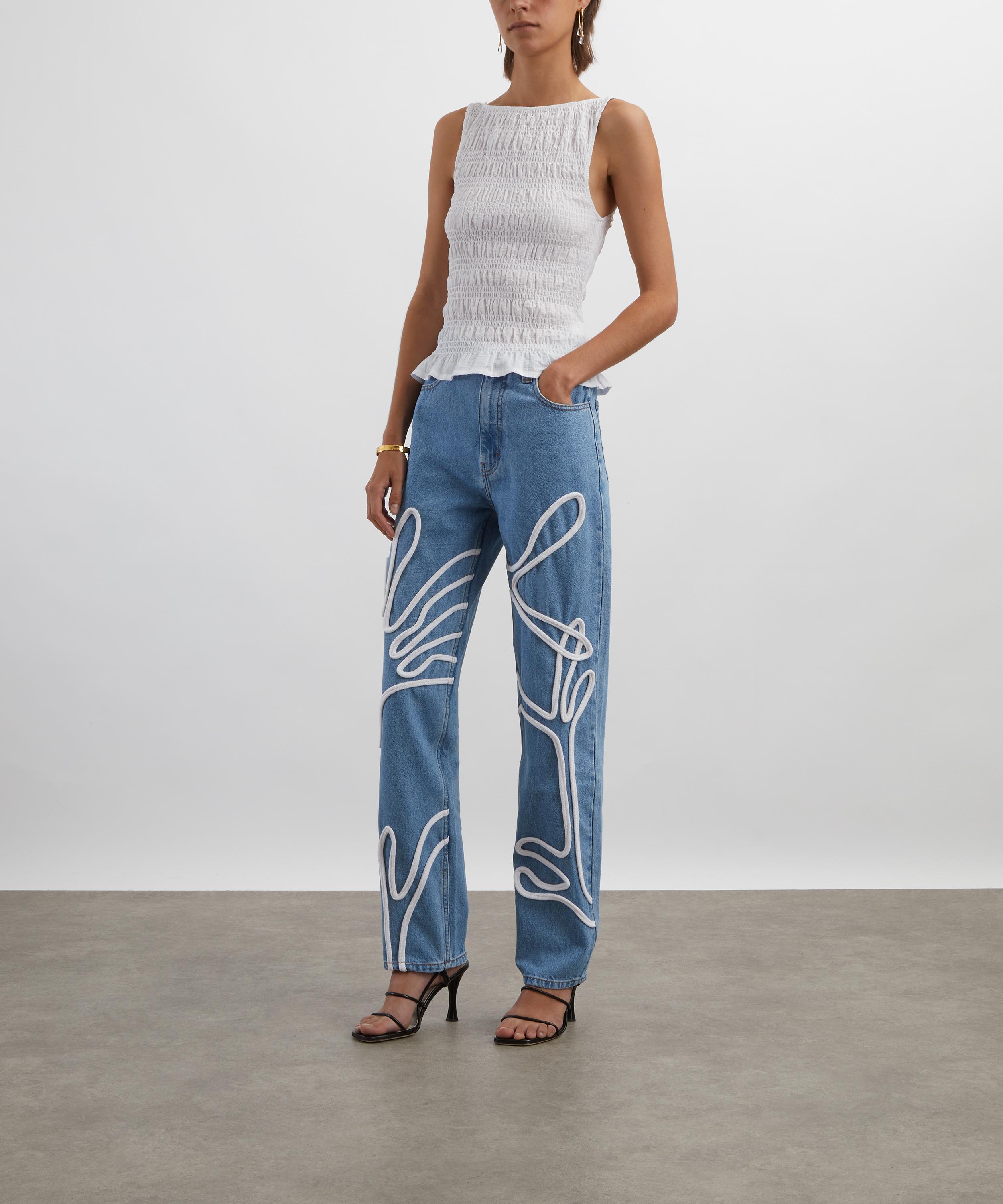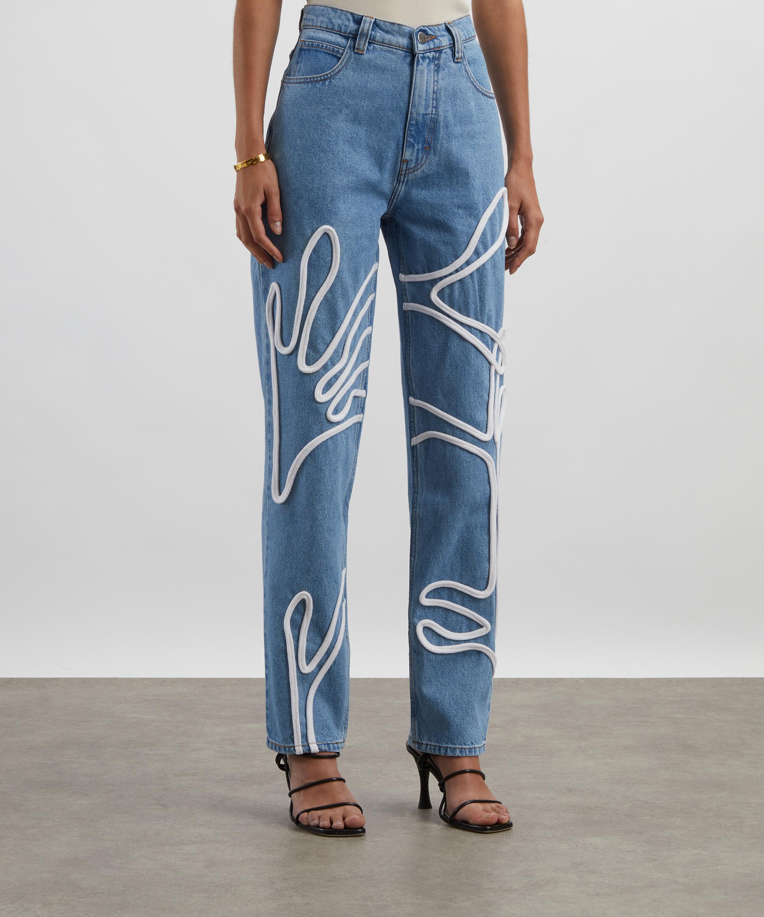 Cut from mid-wash blue denim, these jeans boast a high-waisted fit with an all-over 3D floral design and a classic five-pocket construction.