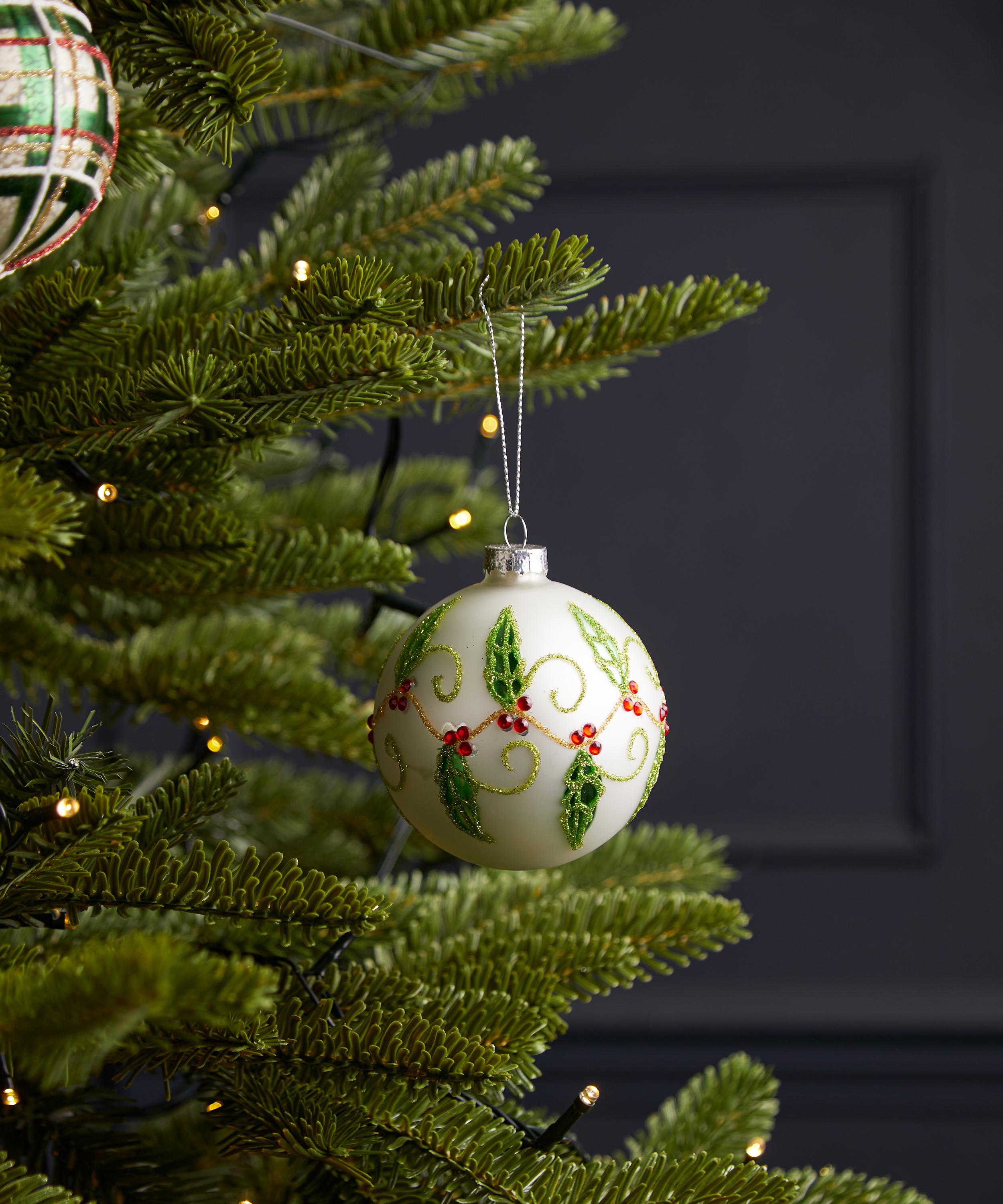 Elevate your festive décor with the whimsical Holly bauble, enriched with a matte silhouette adorned in glitter detailing and red jewels to add dimension, and exude eclectic taste.