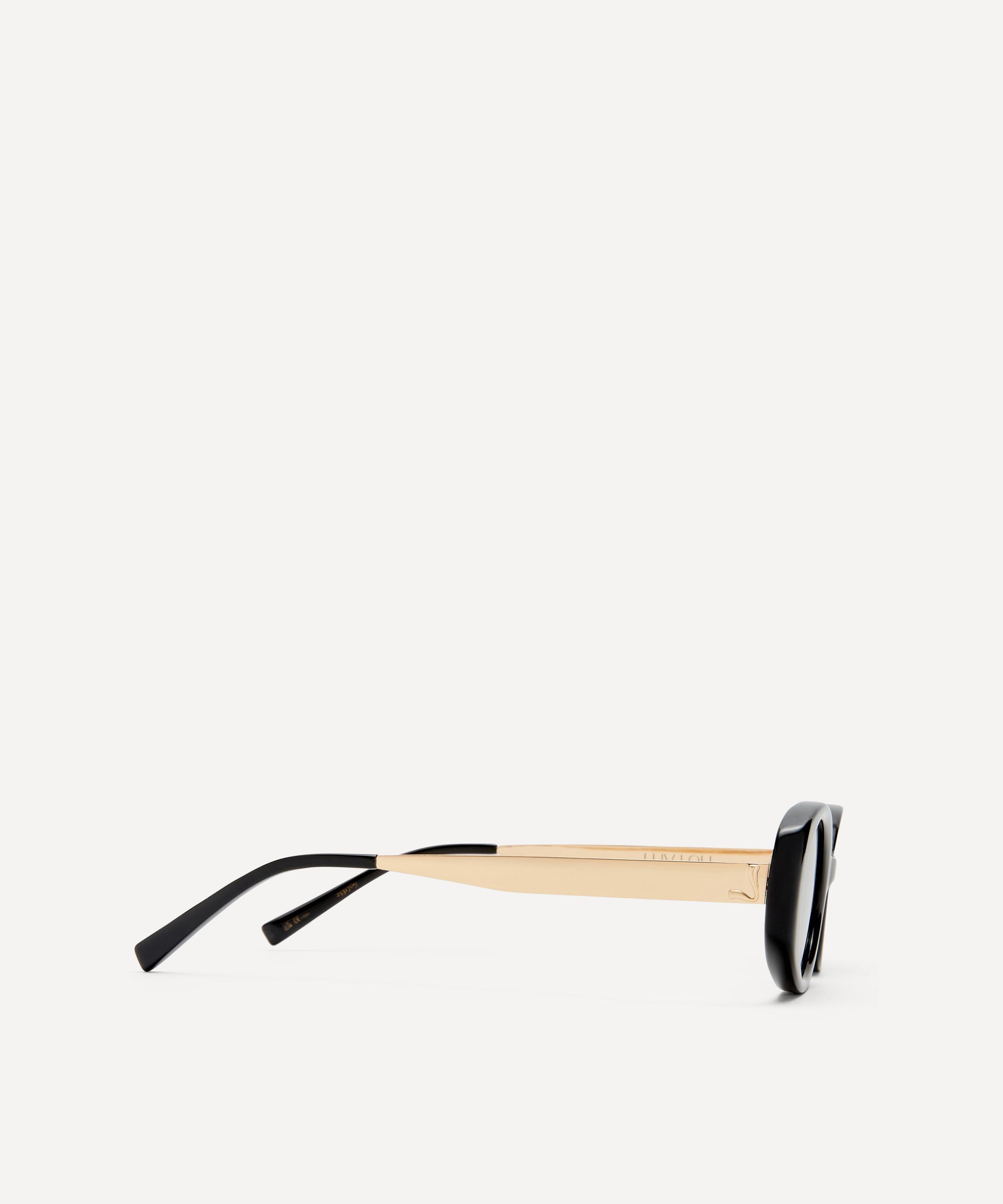 Crafted for the discerning eye, these sunglasses polish everyday looks with their sculptural silhouette and flawless finish. The petite oval frame in black acetate, meticulously engineered for comfort and durability, is paired with gold metal arms, the brand’s signature ‘L’ logo and premium smoke mono lenses, offering UV protection and optical clarity. Poised to create an air of intrigue, this is eyewear for those who value quiet confidence and effortless style, designed to transcend seasons and trends.