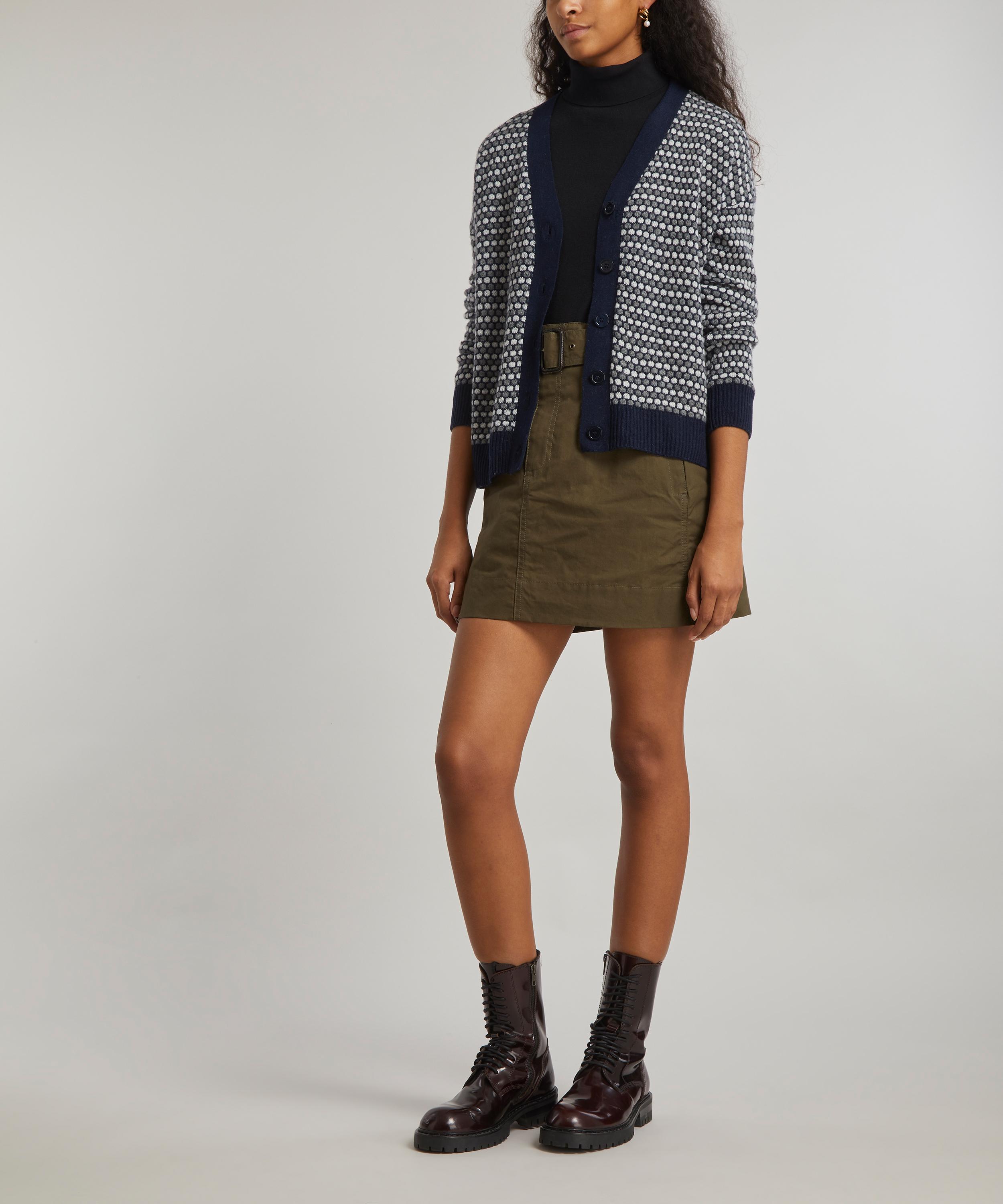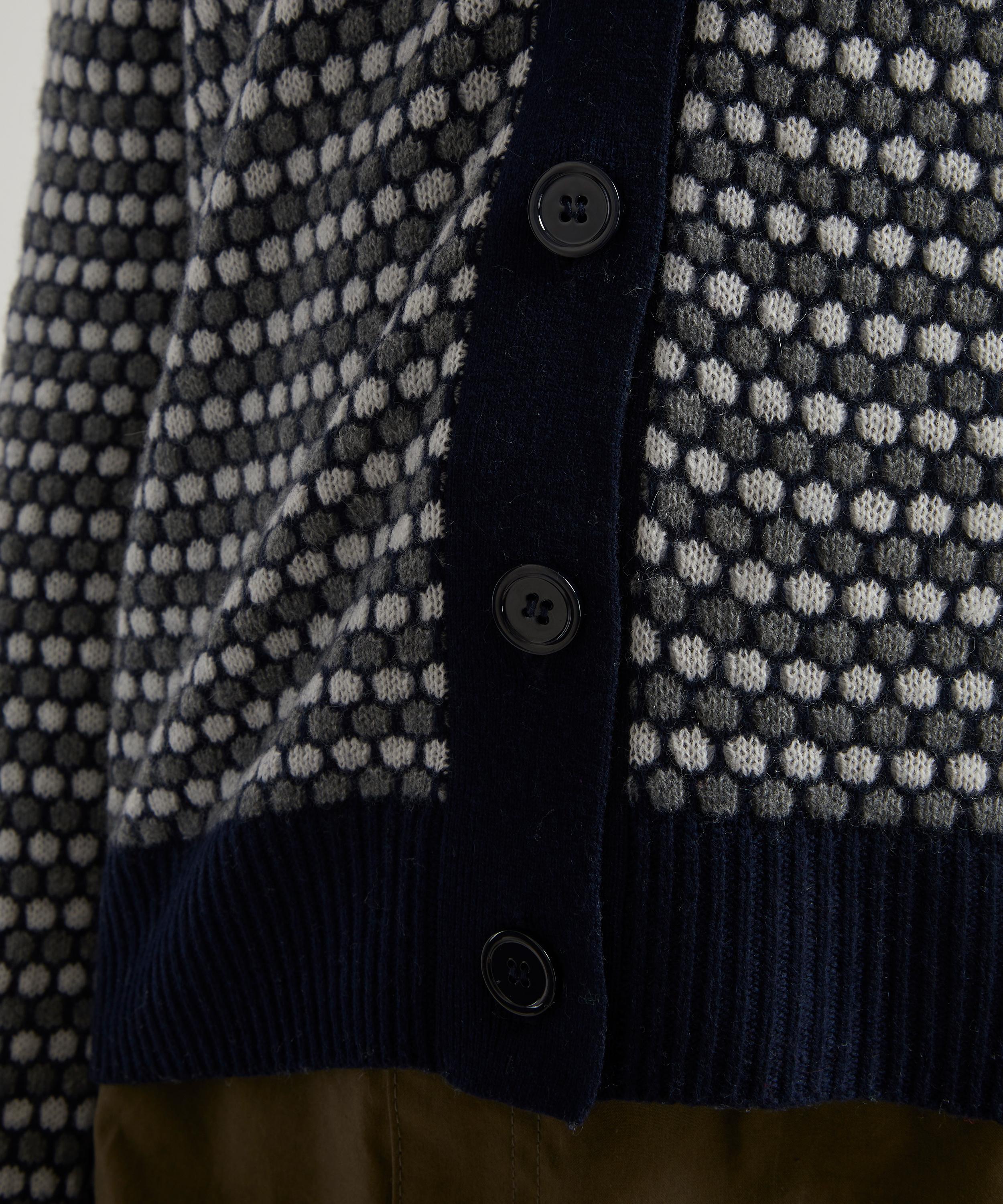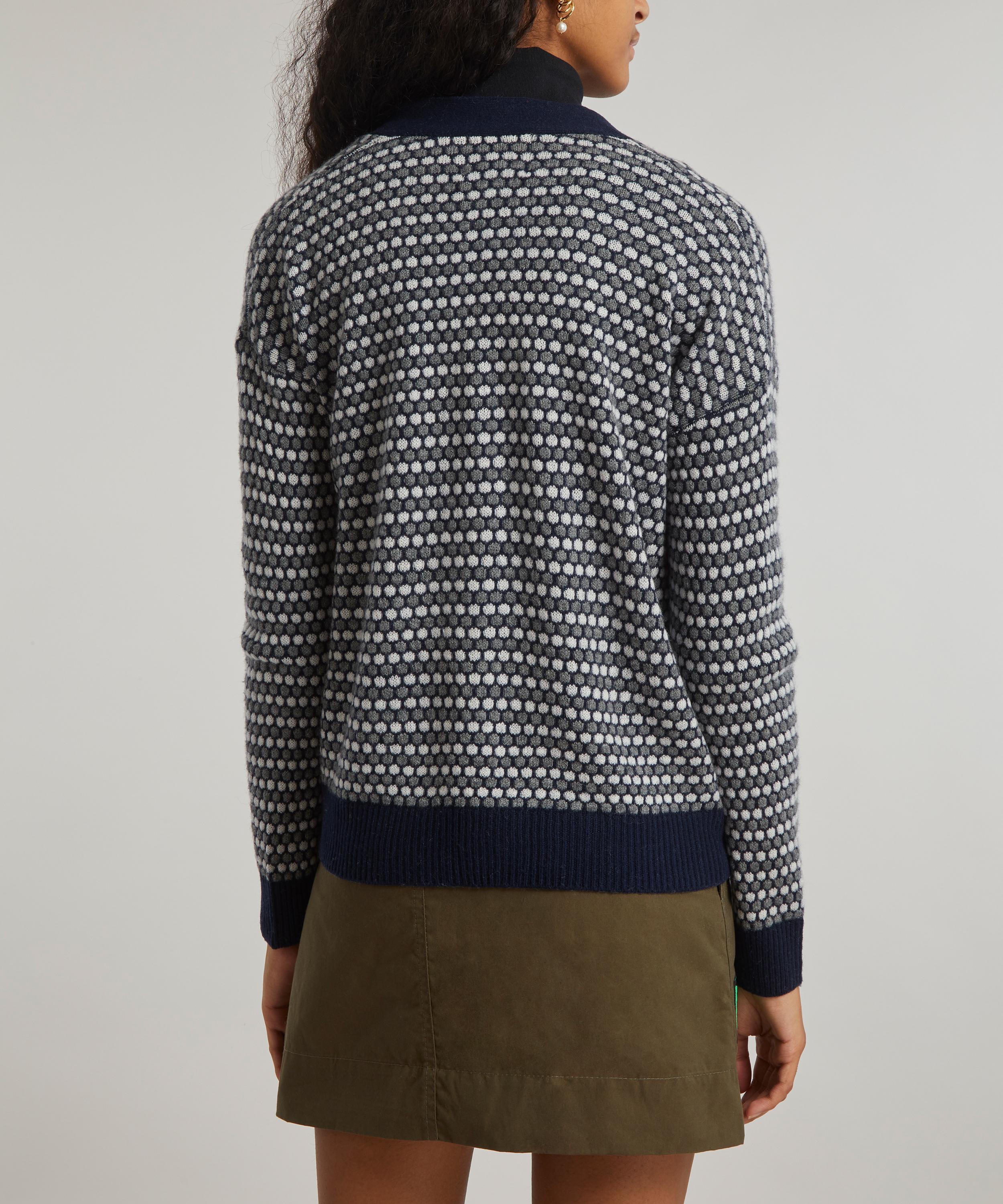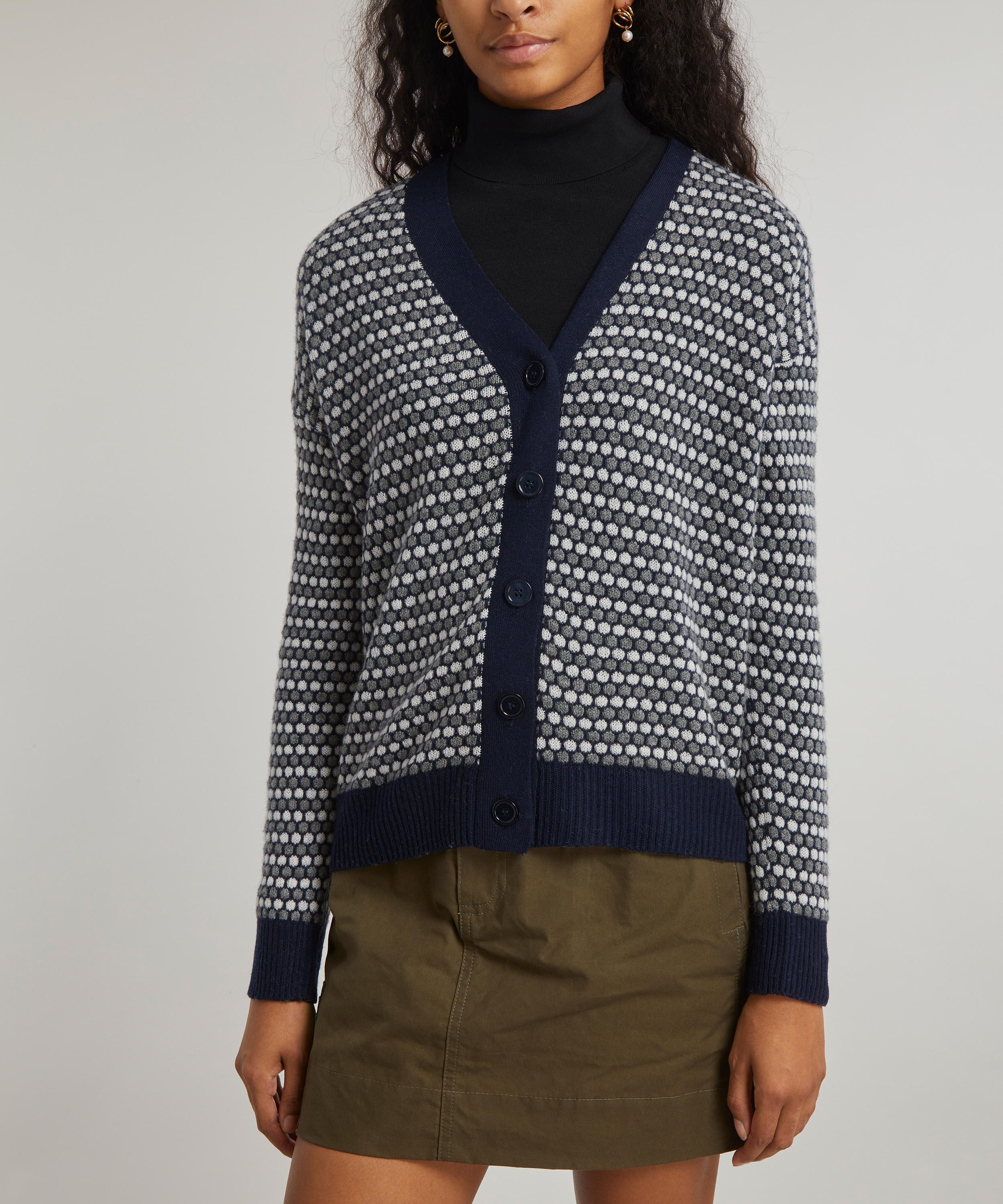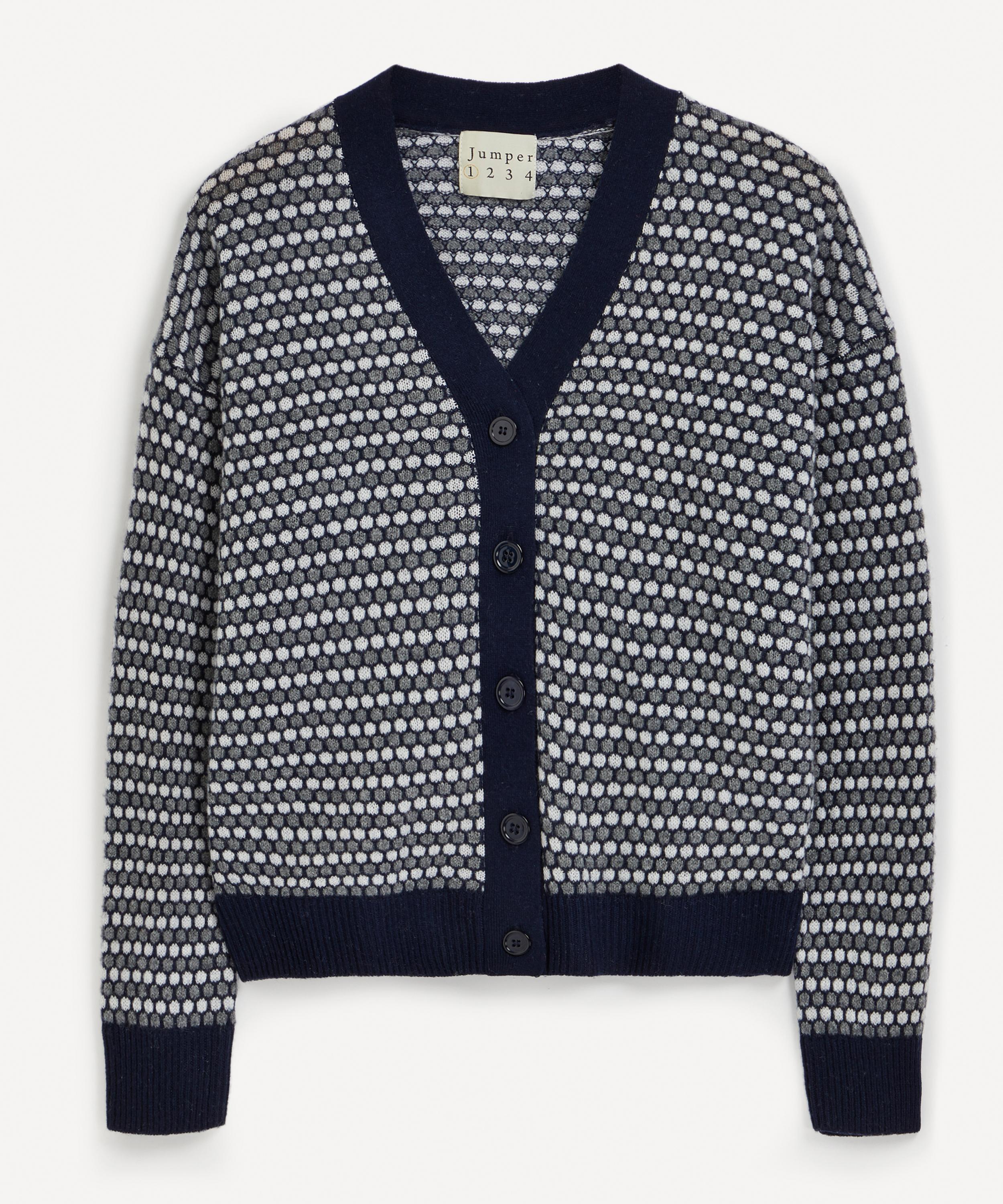 Cosy up in cashmere with the Honeycomb cardigan from Jumper 1234. Bringing a touch of luxury to your daily edit, this oversized, V-neck button-up is characterised by its navy and grey ‘honeycomb' pattern.