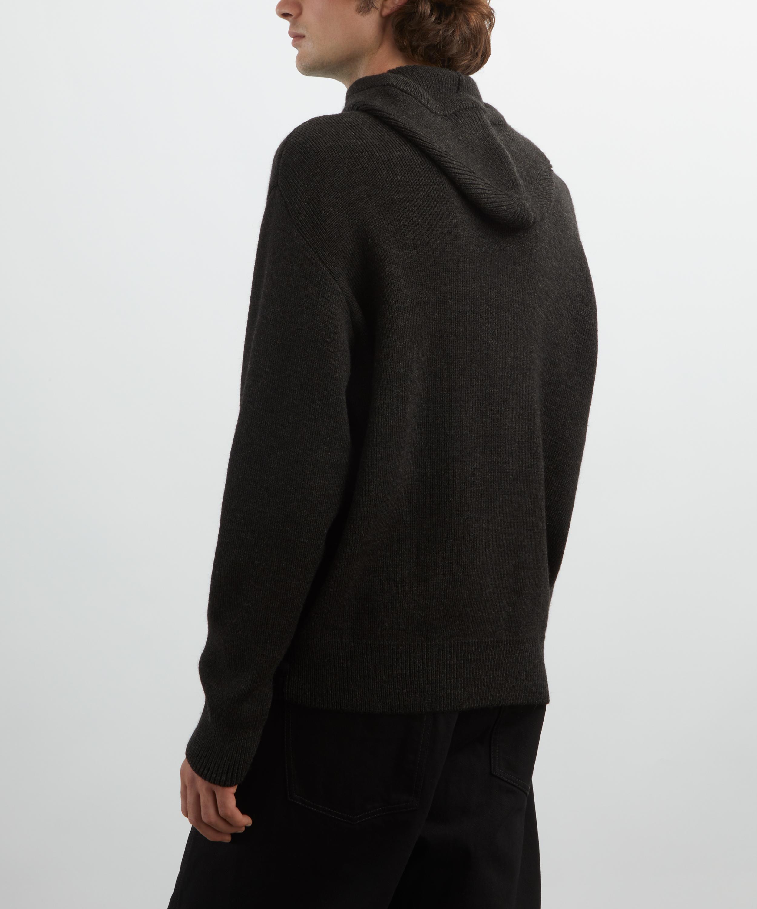 Crafted from a wool and alpaca blend, this knitted jumper features a straight fit, button-down hood, and rib-knit trims, combining comfort with understated elegance.