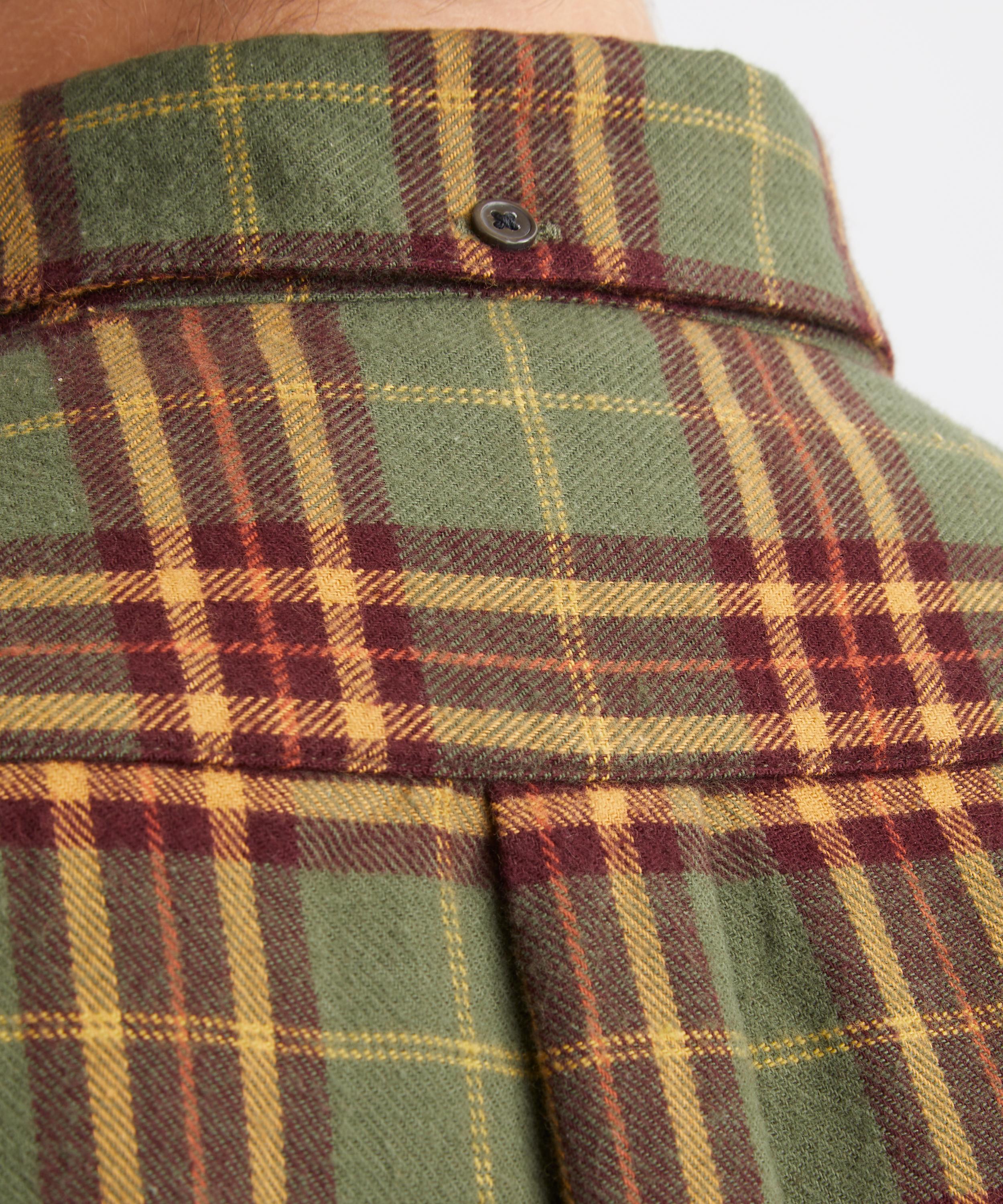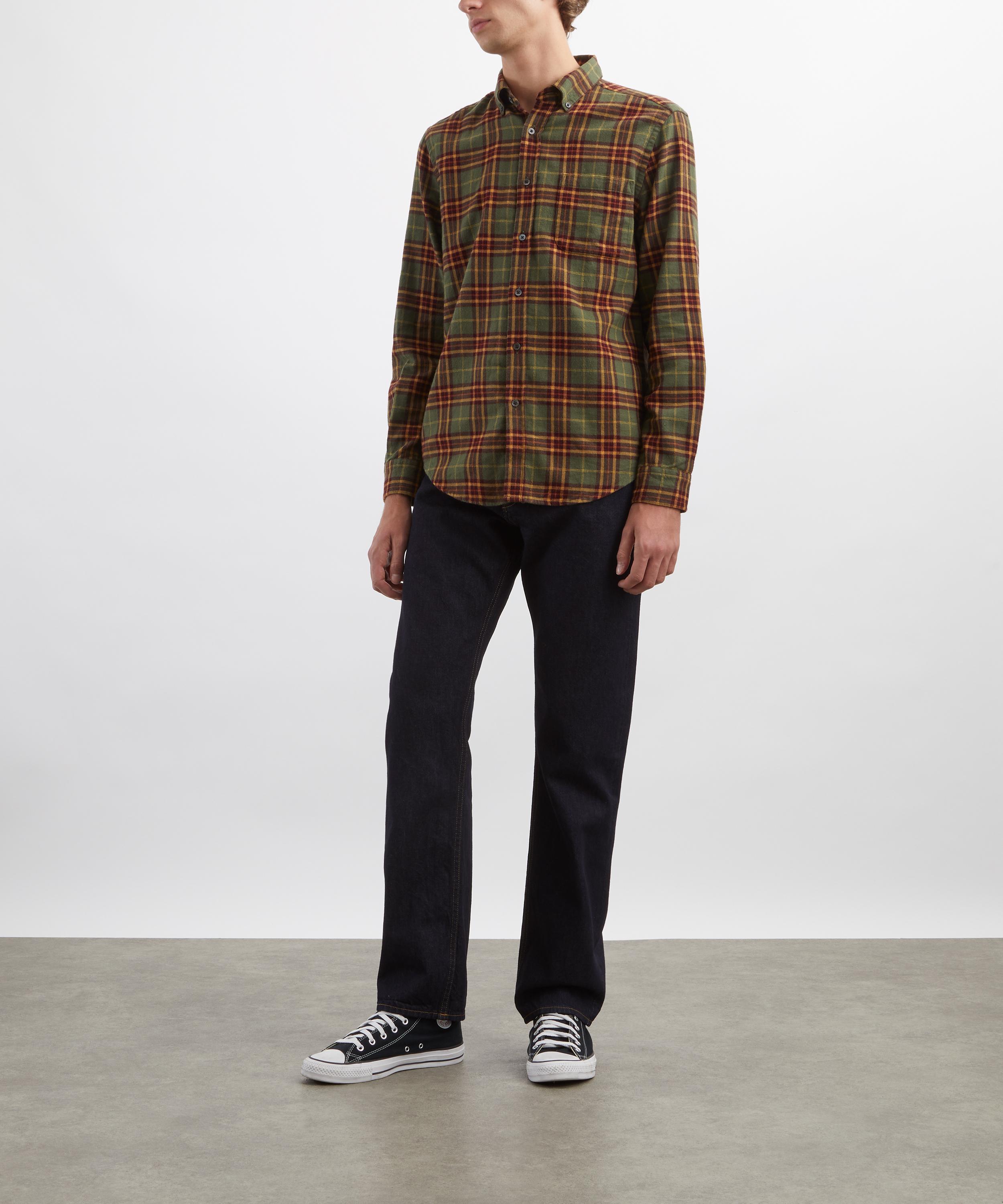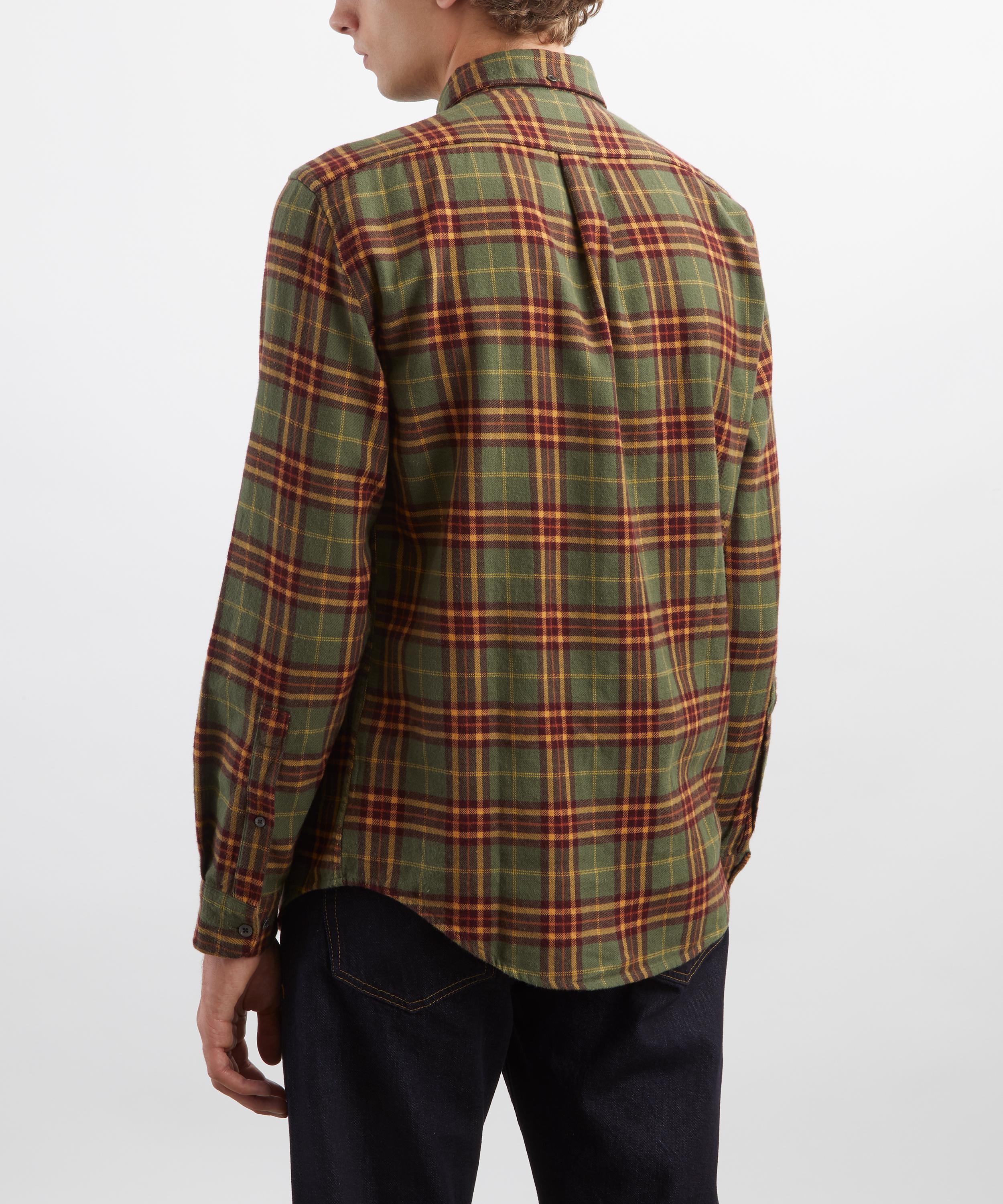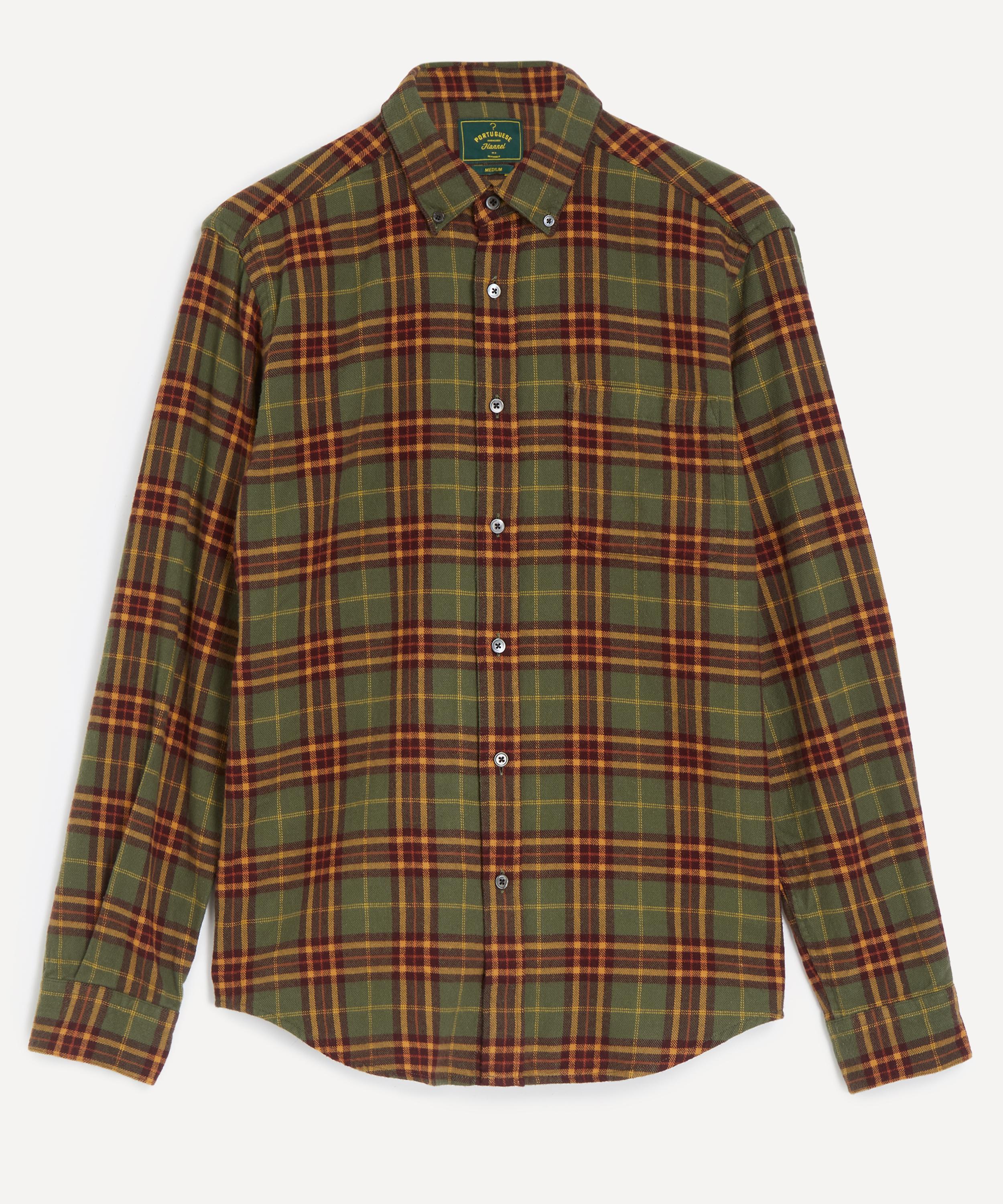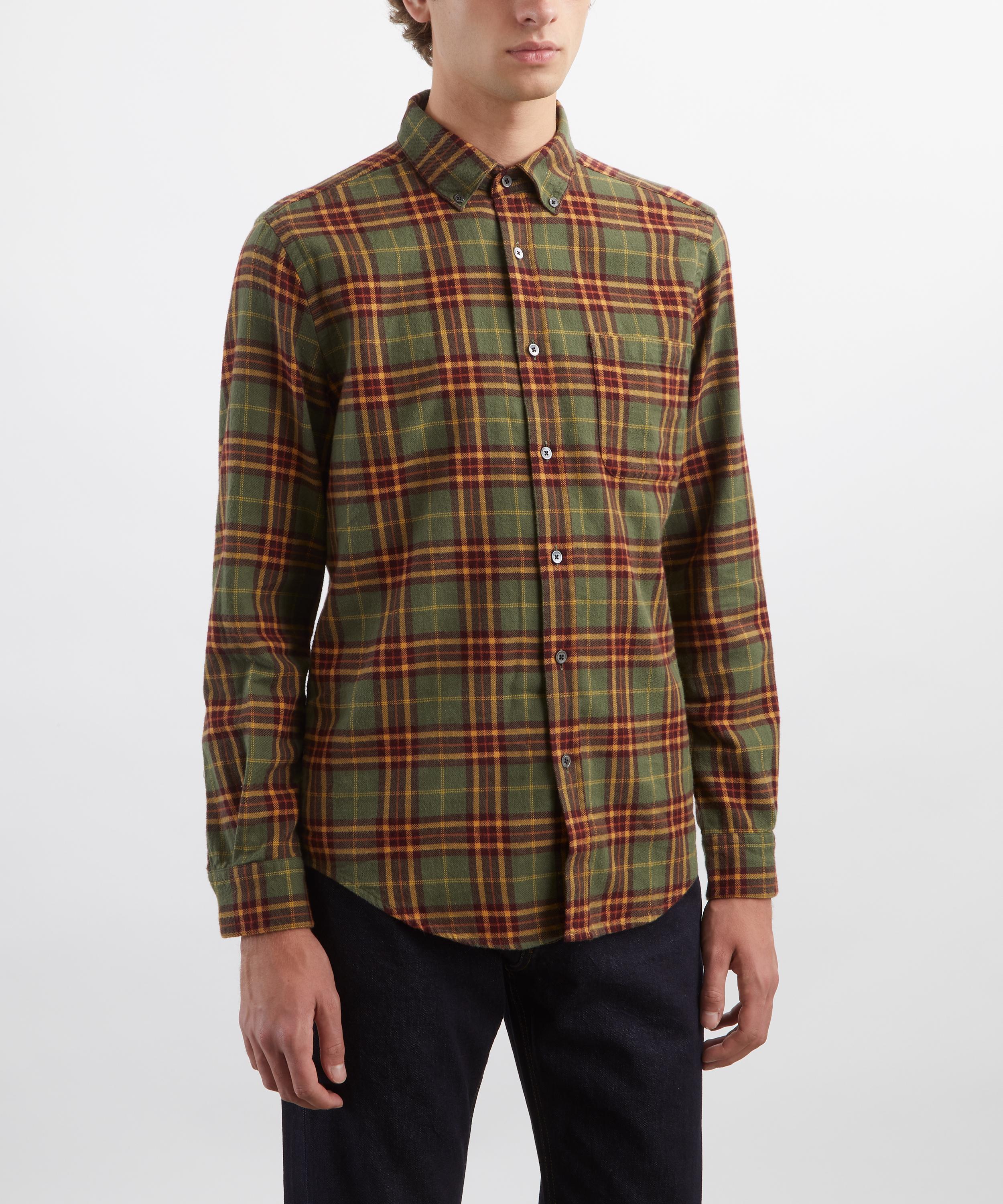 Crafted from brushed cotton adorned with a green plaid pattern, this shirt features a button-down collar, mother-of-pearl button fastening, and a single chest pocket - offering timeless utilitarian style with a modern edge.