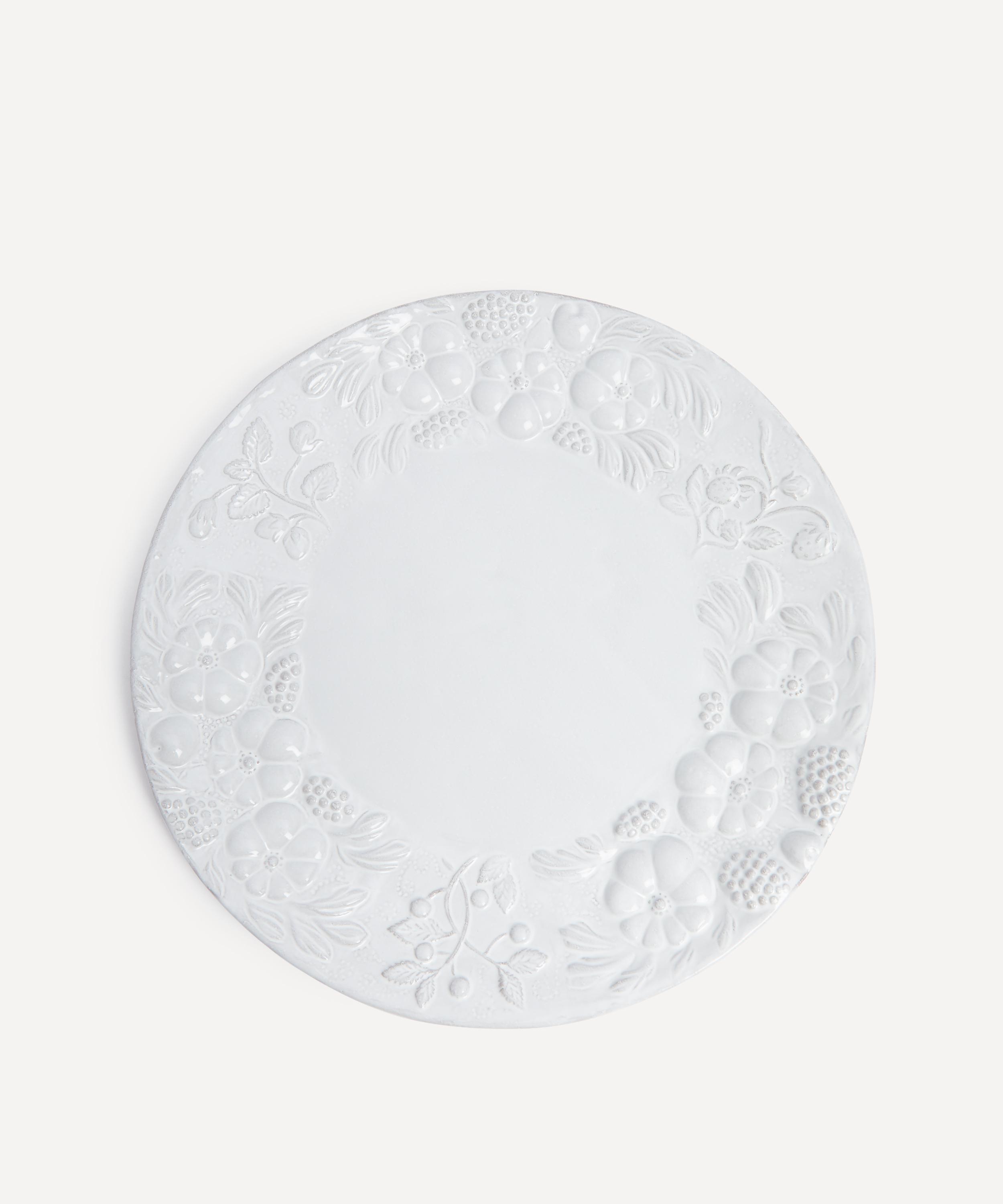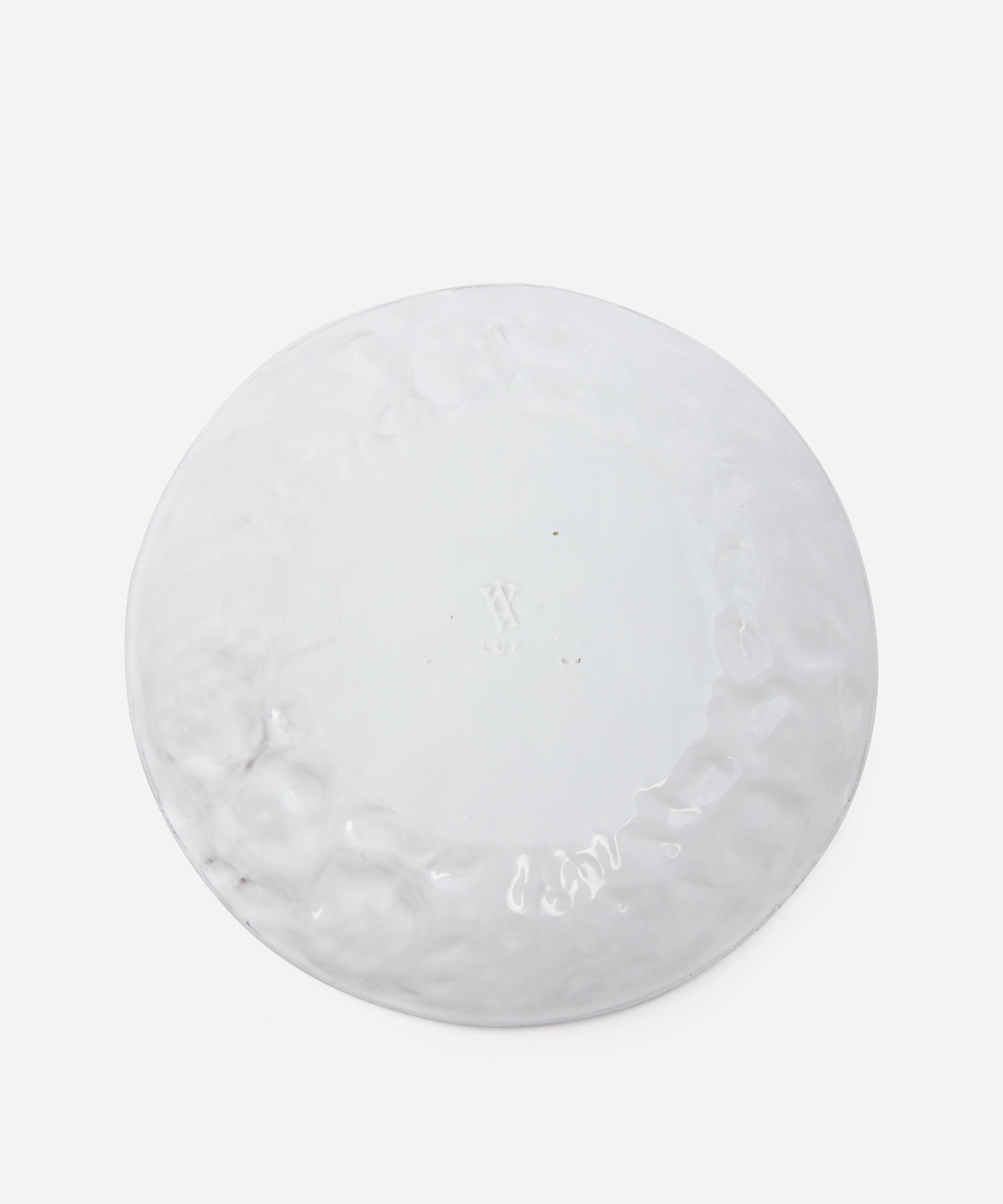 Votary of pre-industrial fabrication, Astier de Villatte is celebrated for being the one and only studio in Paris to hold and harbour the traditions of artisanal ceramic production. Restoring the ancestral systems of moulding and stamping, this plate is made using handcrafting techniques from the Middle Ages which involve moulding a handmade sheet of clay, double firing the ‘biscuit’ piece and glazing the product in white enamel – a lengthy process that involves a drying time of up to one month. Characterised by its elegant, floral rim, the plate is engraved with the brand’s signature crest – depicting an interlacing A & V – alongside the initials of one of the 40 master artisans who created it. Each handmade piece tells a beautiful story, it romances and imparts a sense of nostalgia into its owner. Arrange with other serveware in the collection to breathe an air of authenticity into your table setting.