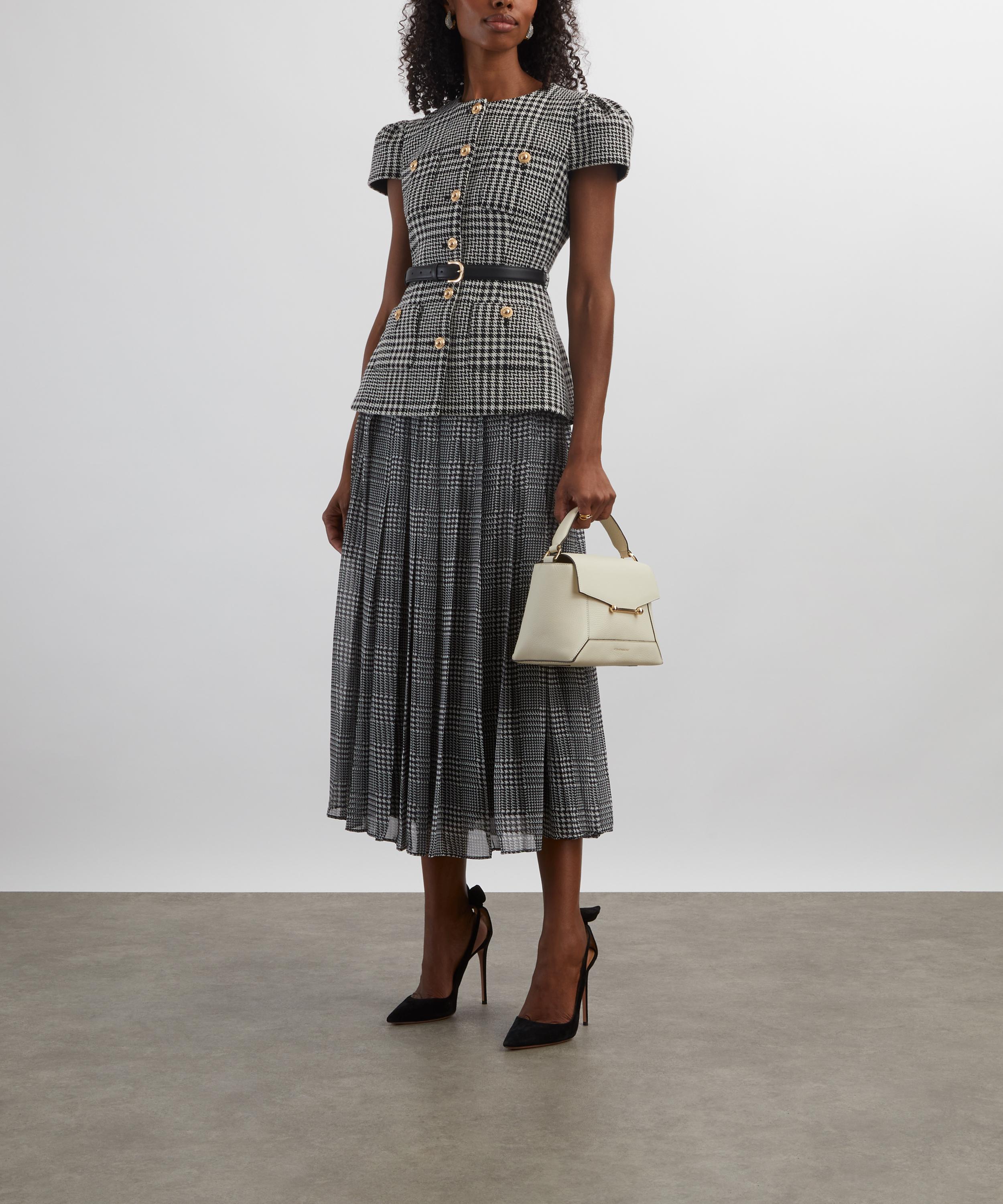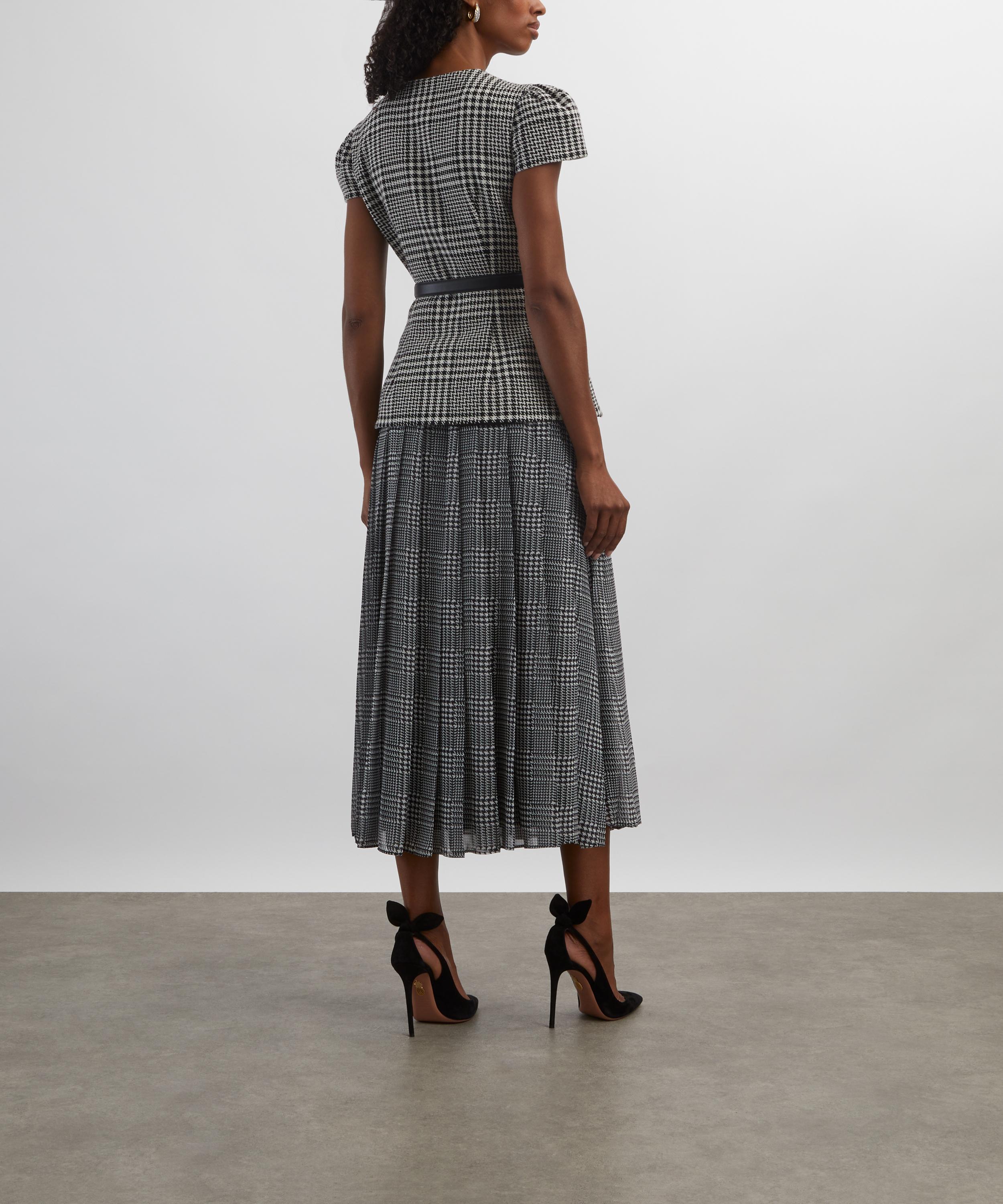 A vision of elegance, this signature tailored midi dress from Self-Portrait is reimagined in classic houndstooth wool check. Consisting of a structured bodice and a pleated chiffon skirt, it’s topped up with gold buttons and a belted waist for a refined, lady-like polish to the piece.