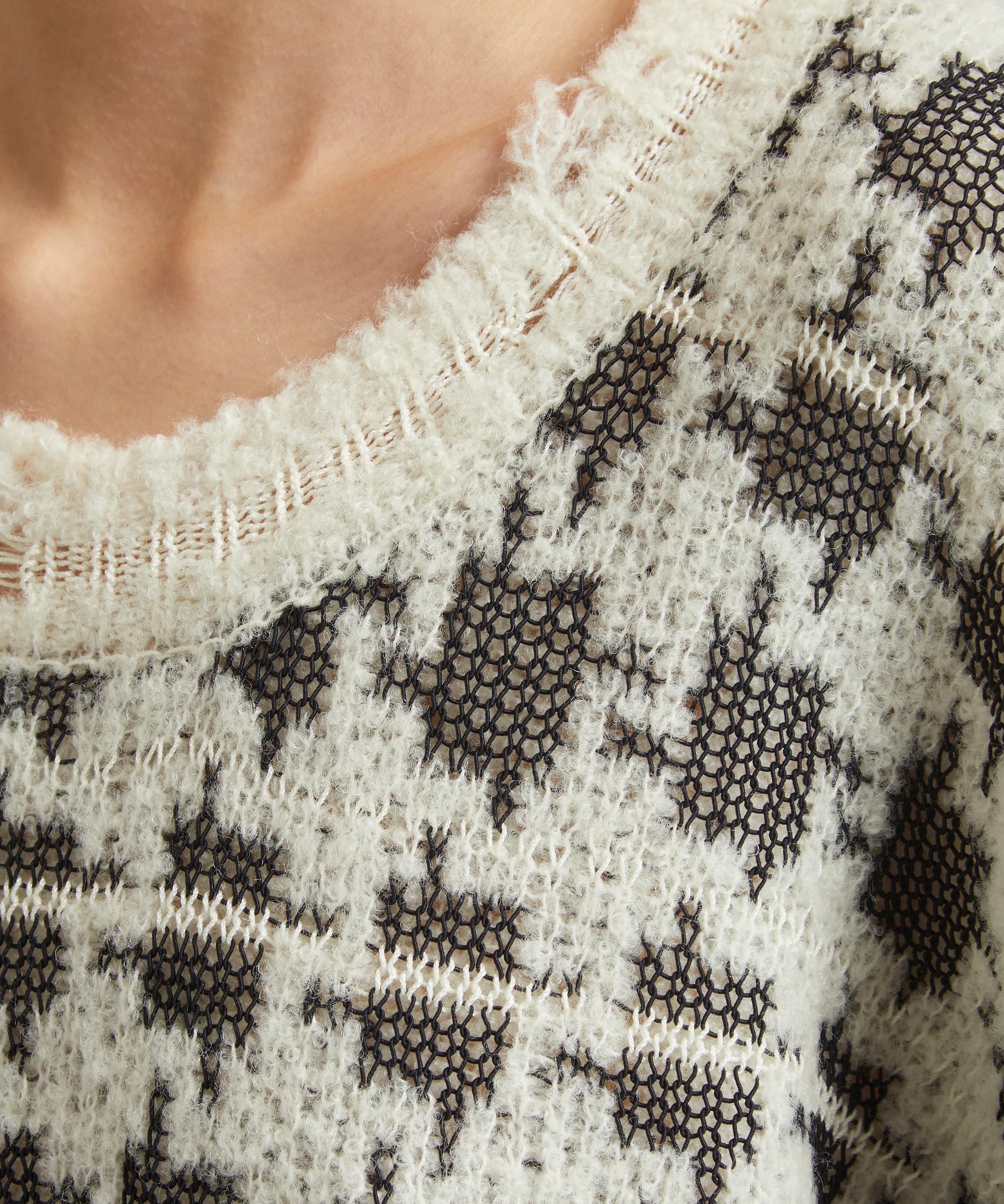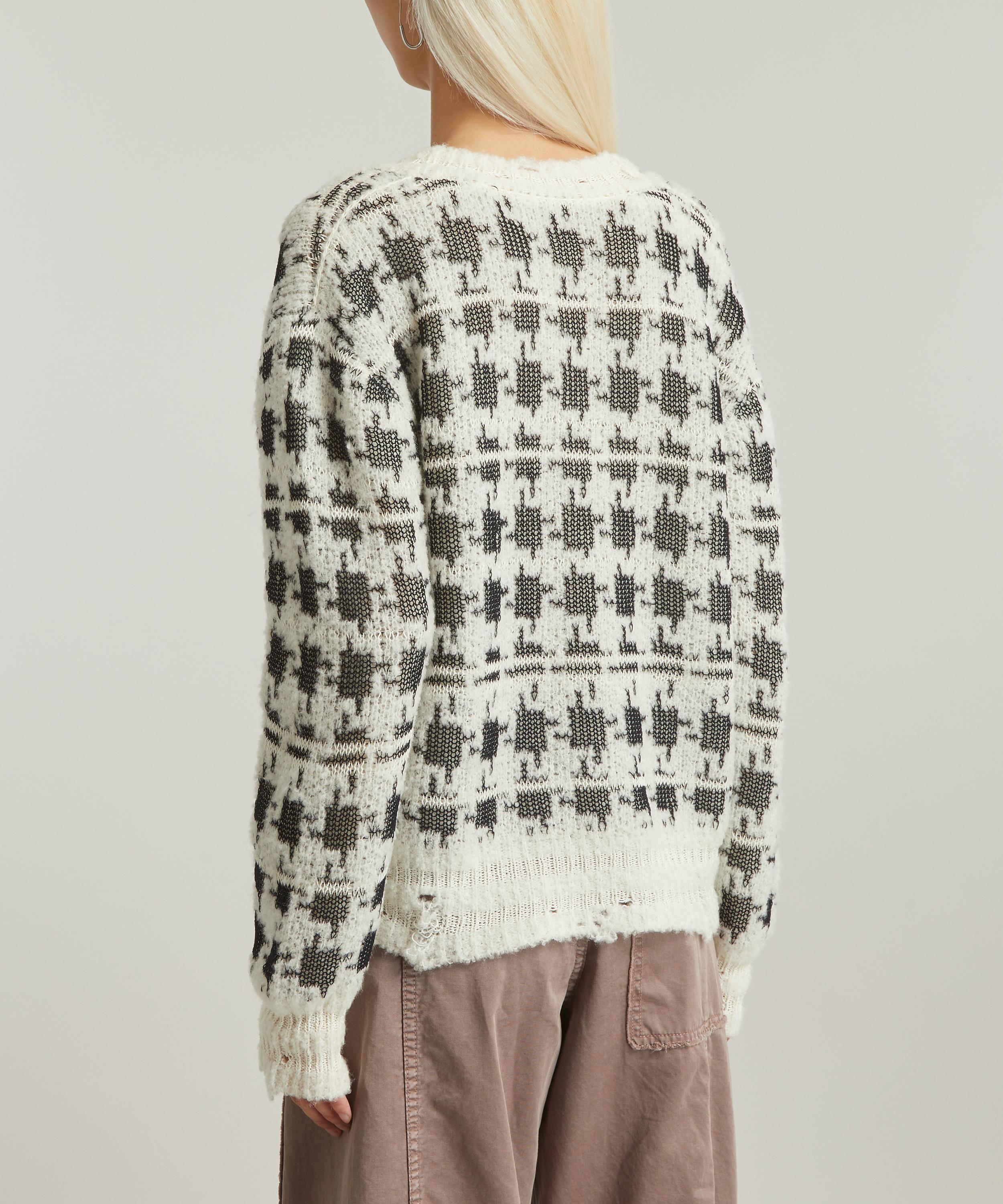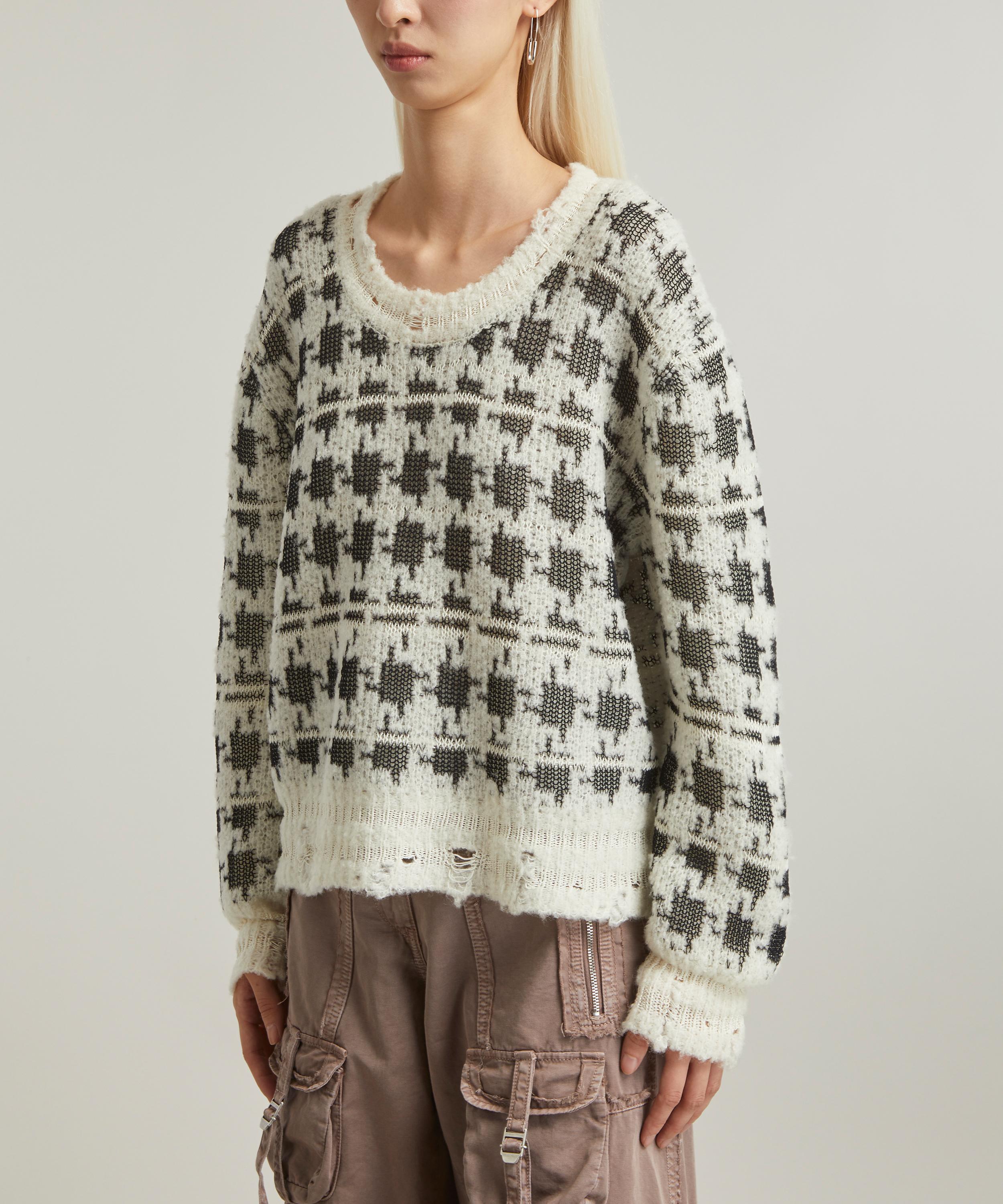 Crafted from a super-soft, boucle wool-blend featuring a tactile houndstooth jacquard pattern, this round-neck jumper is designed for a relaxed fit with dropped shoulders, slouchy long sleeves and distressed, ladder-stitched ribbed trims.