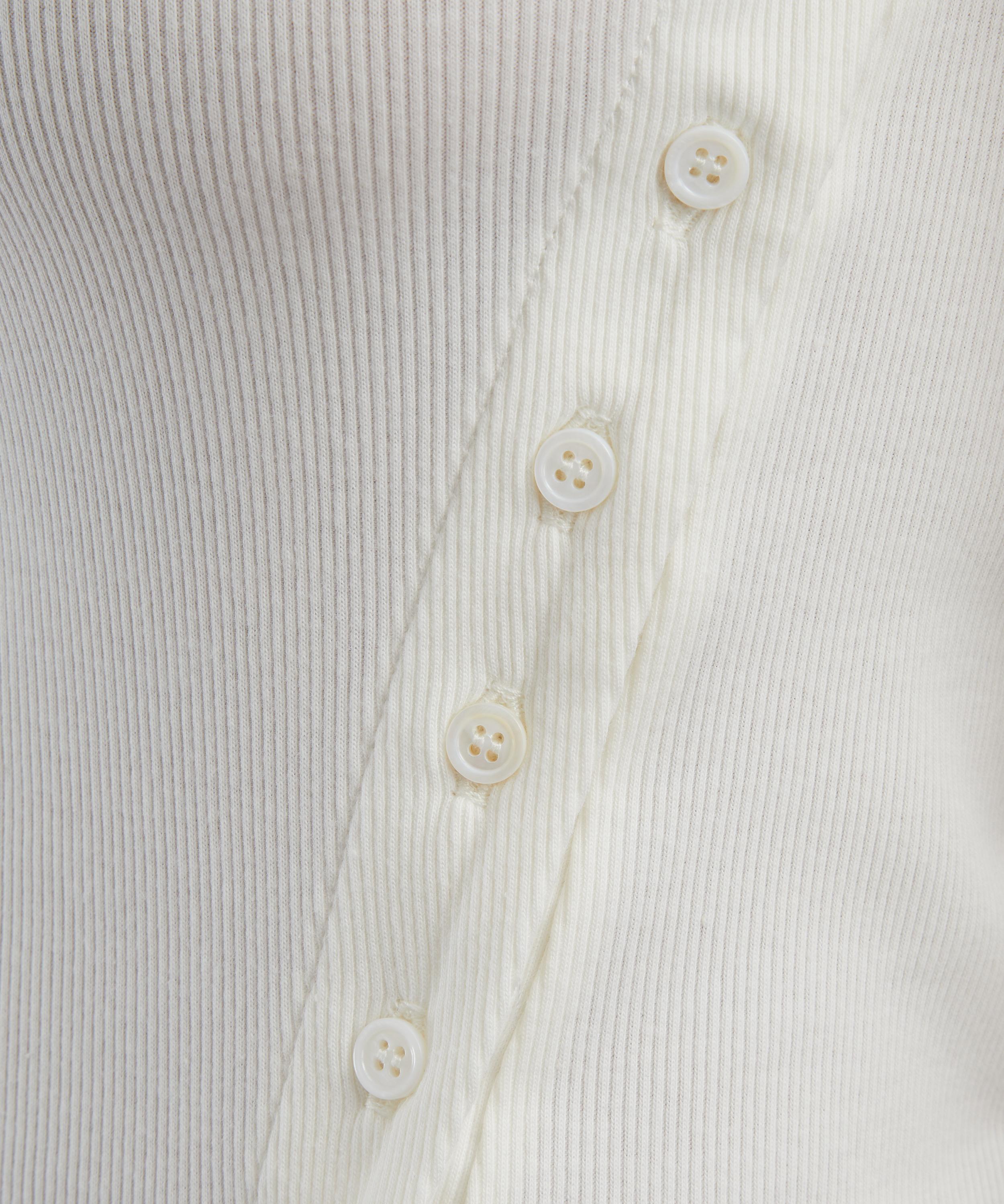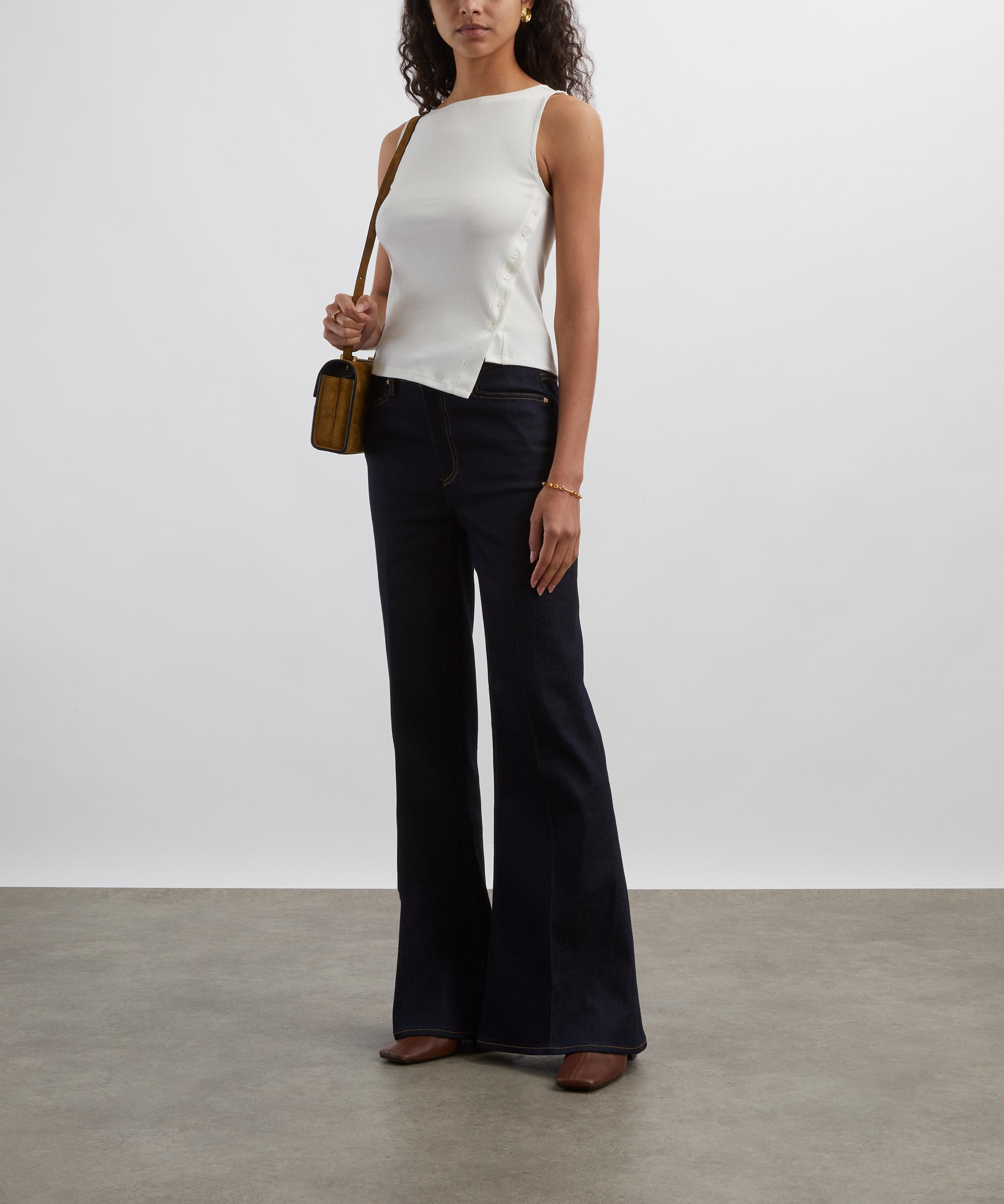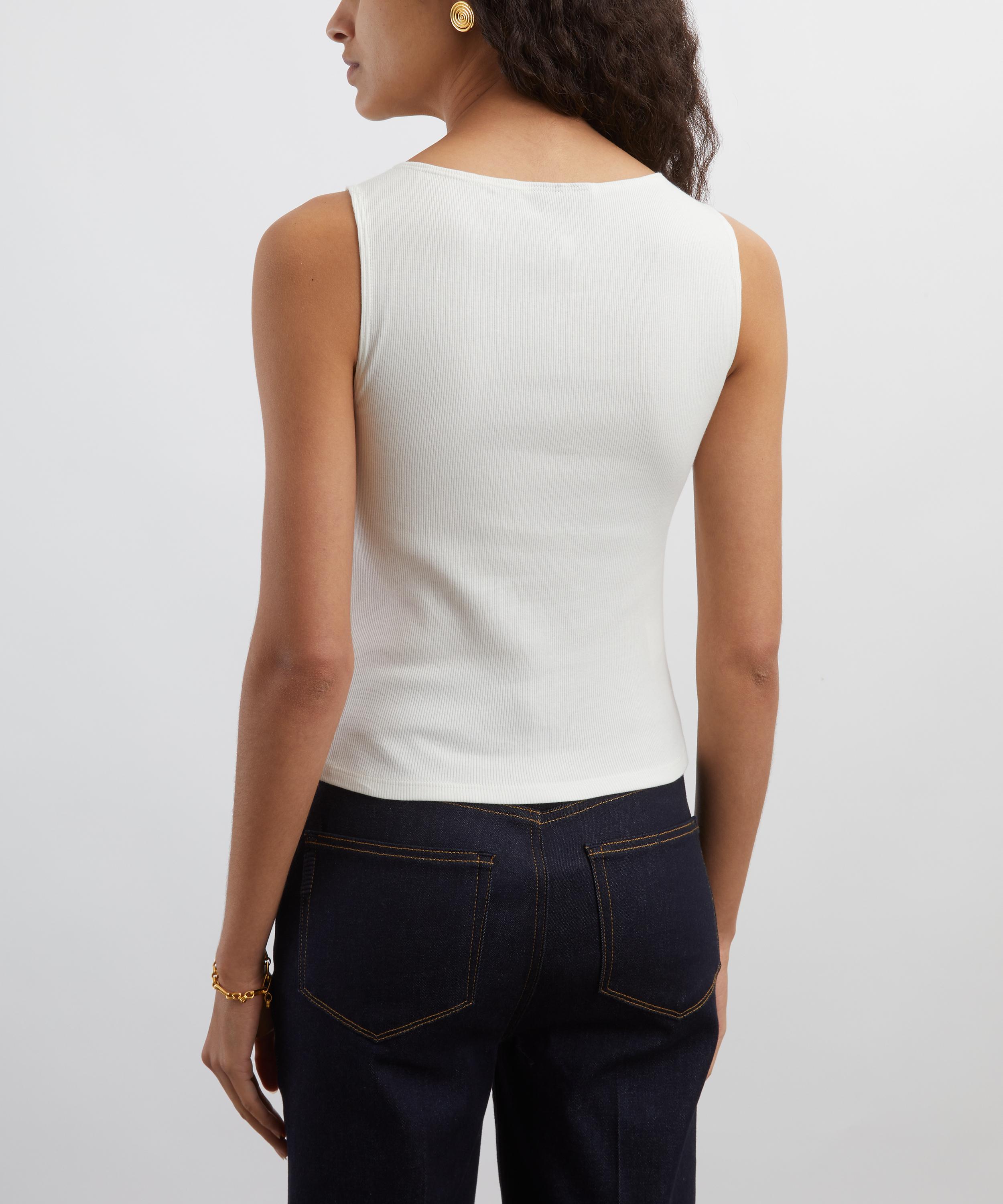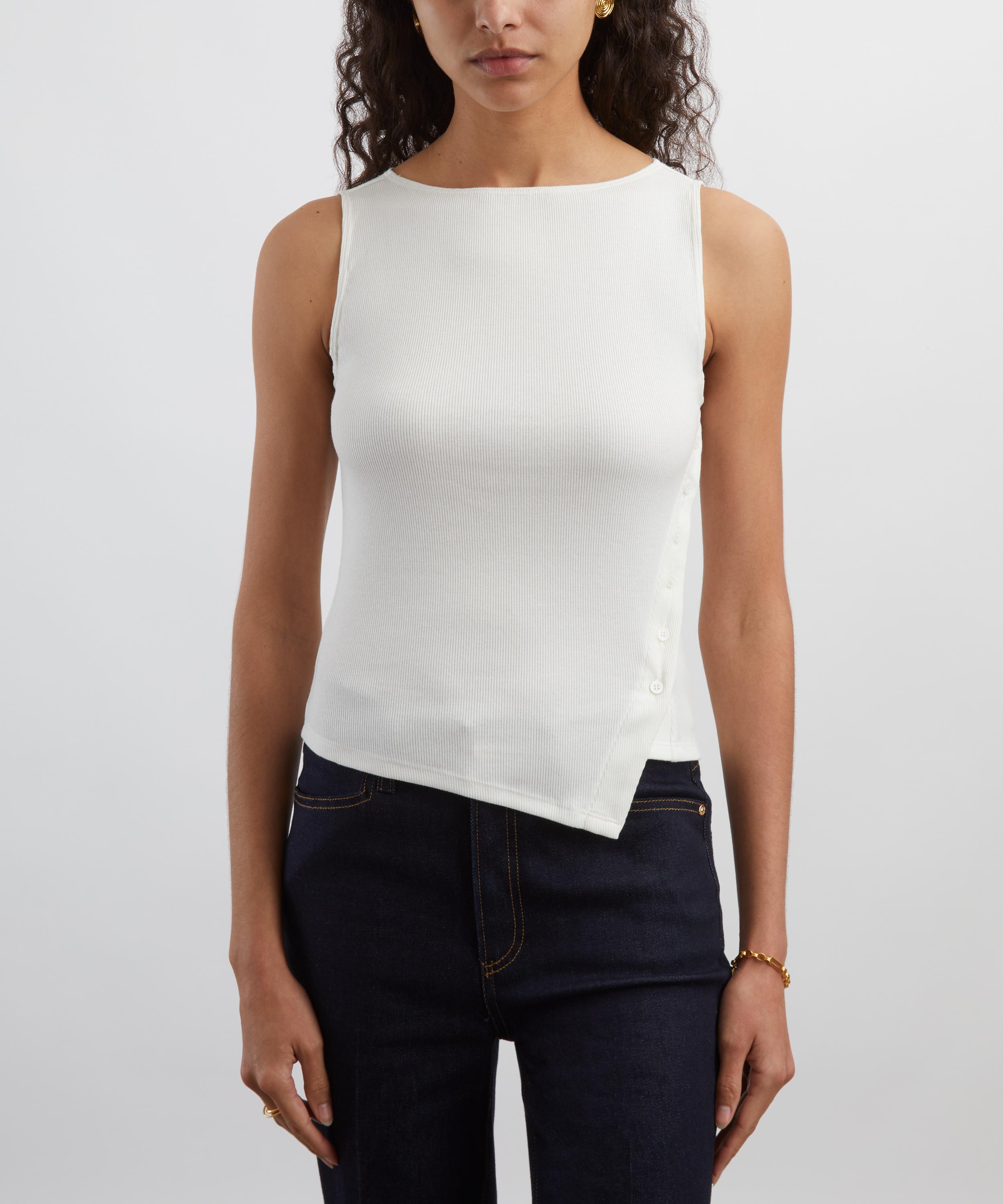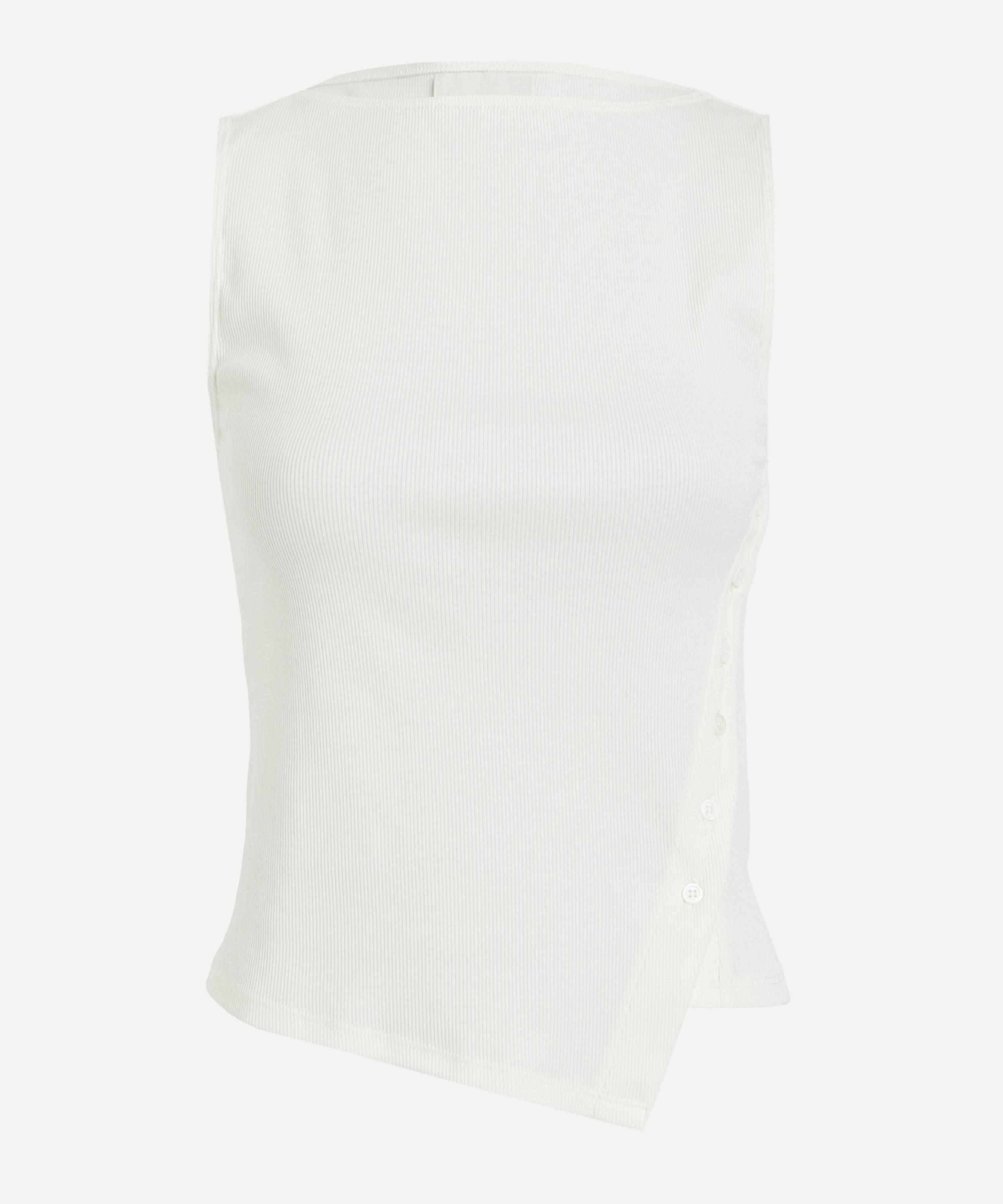Crafted from lightweight cotton and spandex for moderate stretch, it captures effortless charm with a touch of modern femininity. Featuring a sleeveless, rib knit design and a high, round neckline, it’s finished with a subtle button closure to the side for a flattering, feminine shape.
