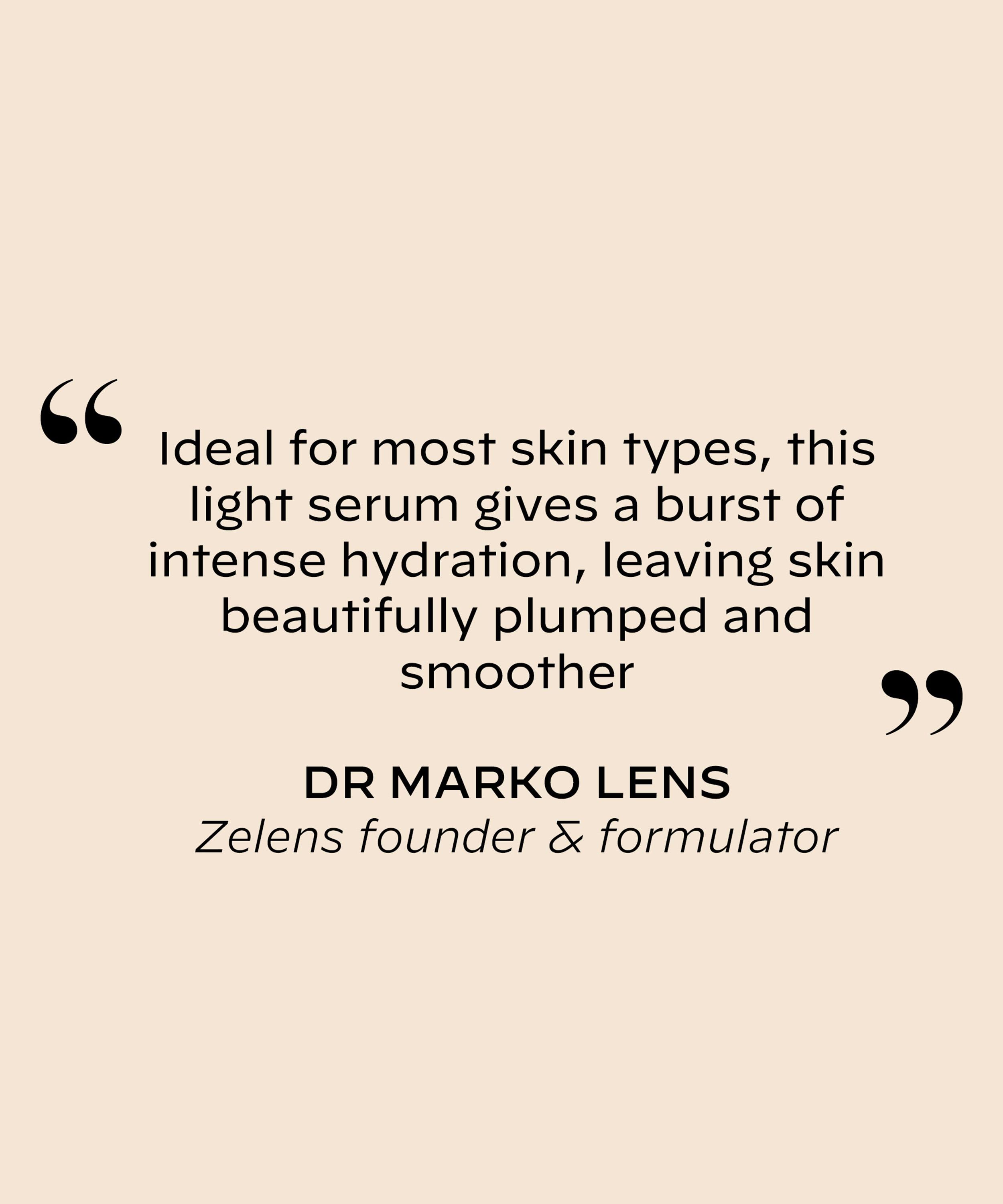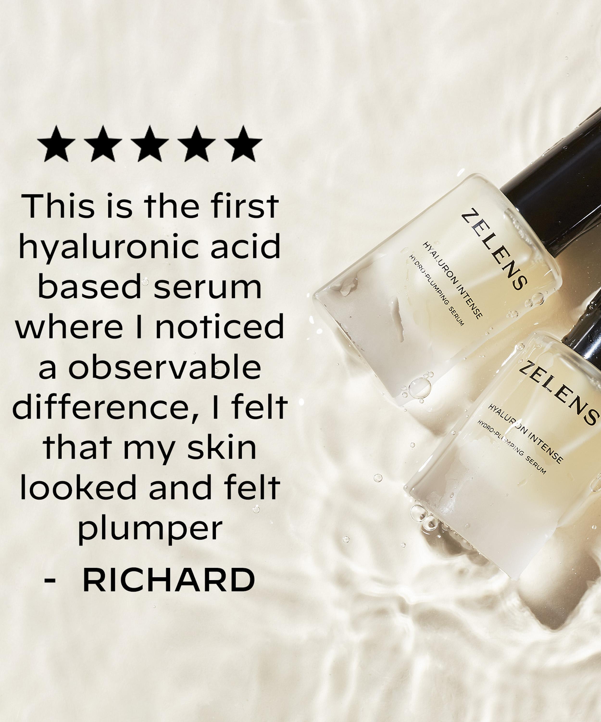 Zelens’ Hyaluron Intense Hydro-Plumping Serum is a lightweight face serum enriched with a powerful blend of hyaluronic acid (HA) in three different molecular weights, formulated to deliver hydration and lock in moisture for skin that appears supple, smooth and visibly plump.